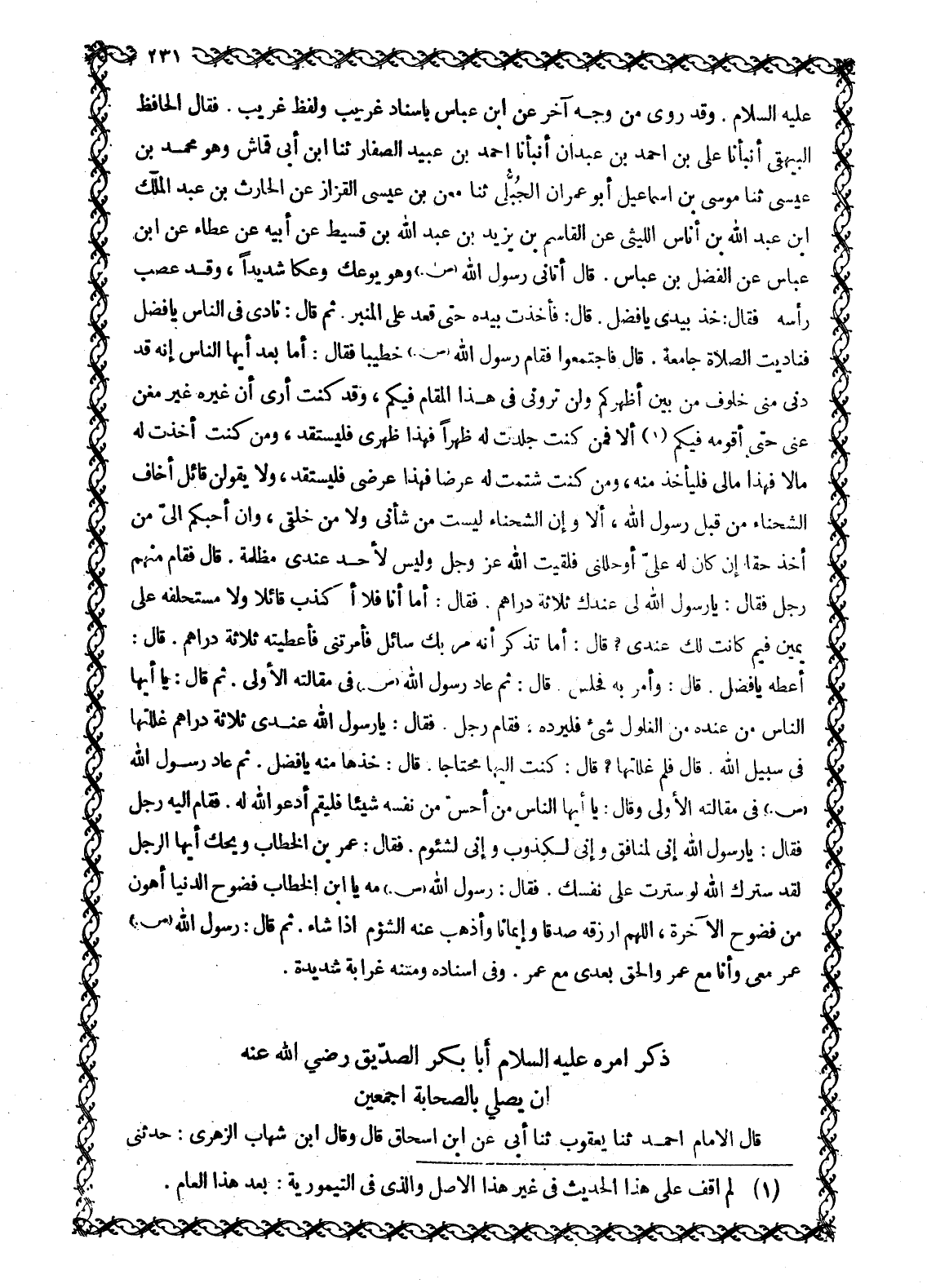 أَعْطِهِ يَا فَضْلُ. قَالَ: وَأَمَرَ بِهِ فَجَلَسَ. قَالَ: ثُمَّ عَادَ رَسُولُ اللَّهِ صَلَّى اللَّهُ عَلَيْهِ وسلم في مَقَالَتِهِ الْأُولَى. ثُمَّ قَالَ: يَا أَيُّهَا النَّاسُ مَنْ عِنْدَهُ مِنَ الْغُلُولِ شَيْءٌ فَلْيَرُدَّهُ، فَقَامَ رَجُلٌ. فَقَالَ: يَا رَسُولَ اللَّهِ عِنْدِي ثَلَاثَةُ دَرَاهِمَ غَلَلْتُهَا فِي سَبِيلِ اللَّهِ. قَالَ فَلِمَ غَلَلْتَهَا؟ قَالَ: كُنْتُ إِلَيْهَا مُحْتَاجًا. قَالَ: خُذْهَا مِنْهُ يَا فَضْلُ. ثُمَّ عَادَ رَسُولُ اللَّهِ صَلَّى اللَّهُ عَلَيْهِ وَسَلَّمَ فِي مَقَالَتِهِ الْأُولَى وَقَالَ: يَا أَيُّهَا النَّاسُ مَنْ أَحَسَّ مِنْ نَفْسِهِ شَيْئًا فَلْيَقُمْ أَدْعُو اللَّهَ لَهُ. فَقَامَ إِلَيْهِ رَجُلٌ فَقَالَ: يَا رَسُولَ اللَّهِ إِنِّي لمنافق وإني لكذوب وإني لشئوم. فَقَالَ: عُمَرُ بْنُ الْخَطَّابِ وَيْحَكَ أَيُّهَا الرَّجُلُ لَقَدْ سَتَرَكَ اللَّهُ لَوْ سَتَرَتْ عَلَى نَفْسِكَ. فَقَالَ: رَسُولُ اللَّهِ صَلَّى اللَّهُ عَلَيْهِ وَسَلَّمَ مَهْ يَا ابْنَ الْخَطَّابِ فُضُوحُ الدُّنْيَا أَهْوَنُ مِنْ فُضُوحِ الْآخِرَةِ، اللَّهمّ ارْزُقْهُ صِدْقًا وَإِيمَانًا وأذهب عنه الشؤم إِذَا شَاءَ. ثُمَّ قَالَ: رَسُولُ اللَّهِ صَلَّى اللَّهُ عَلَيْهِ وَسَلَّمَ عُمَرُ مَعِي وَأَنَا مَعَ عُمَرَ وَالْحَقُّ بَعْدِي مَعَ عُمَرَ. وَفِي إِسْنَادِهِ ومتنه غرابة شديدة.