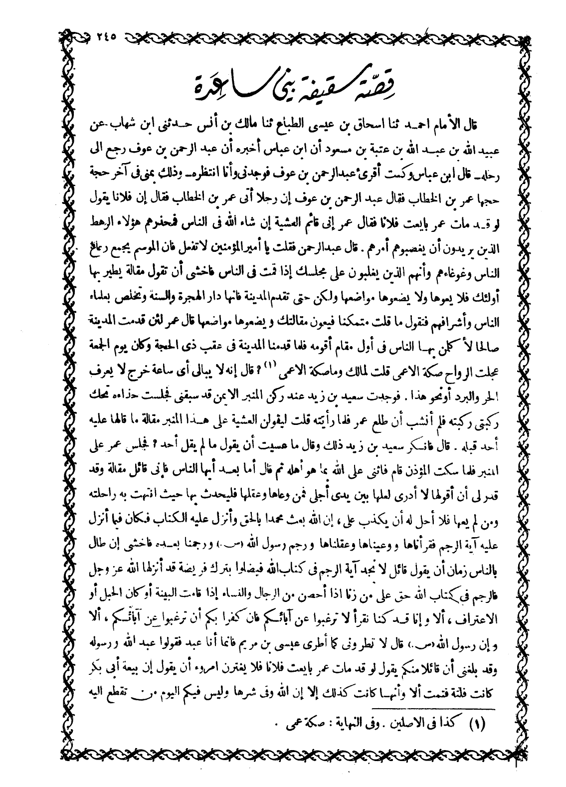 قَالَ الْإِمَامُ أَحْمَدُ ثَنَا إِسْحَاقُ بْنُ عِيسَى الطَّبَّاعُ ثَنَا مَالِكُ بْنُ أَنَسٍ حَدَّثَنِي ابْنِ شِهَابٍ عَنْ عُبَيْدِ اللَّهِ بْنِ عَبْدِ اللَّهِ بْنِ عُتْبَةَ بْنِ مَسْعُودٍ أَنَّ ابْنَ عَبَّاسٍ أَخْبَرَهُ أَنَّ عَبْدَ الرَّحْمَنِ بْنَ عَوْفٍ رَجَعَ إِلَى رَحْلِهِ- قَالَ ابْنُ عَبَّاسٍ وَكُنْتُ أُقْرِئُ عَبْدَ الرَّحْمَنِ بْنَ عَوْفٍ فَوَجَدَنِي وَأَنَا أَنْتَظِرُهُ- وَذَلِكَ بِمِنًى فِي آخِرِ حَجَّةٍ حَجَّهَا عُمَرُ بْنُ الْخَطَّابِ فَقَالَ عَبْدُ الرَّحْمَنِ بْنُ عَوْفٍ إِنَّ رَجُلًا أَتَى عُمَرَ بْنَ الْخَطَّابِ فَقَالَ إِنَّ فُلَانًا يَقُولُ لَوْ قَدْ مَاتَ عُمَرُ بَايَعْتُ فُلَانًا فَقَالَ عُمَرُ إِنِّي قَائِمٌ الْعَشِيَّةَ إِنْ شَاءَ اللَّهُ فِي النَّاسِ فَمُحَذِّرُهُمْ هَؤُلَاءِ الرَّهْطَ الَّذِينَ يُرِيدُونَ أَنْ يَغْصِبُوهُمْ أَمْرَهُمْ. قَالَ عَبْدُ الرَّحْمَنِ فَقُلْتُ يَا أَمِيرَ الْمُؤْمِنِينَ لَا تَفْعَلْ فَإِنَّ الْمَوْسِمَ يَجْمَعُ رِعَاعَ النَّاسِ وَغَوْغَاءَهُمْ وَإِنَّهُمُ الَّذِينَ يَغْلِبُونَ عَلَى مَجْلِسِكَ إِذَا قُمْتَ فِي النَّاسِ فَأَخْشَى أَنْ تَقُولَ مَقَالَةً يَطِيرُ بِهَا أُولَئِكَ فَلَا يَعُوهَا وَلَا يَضَعُوهَا مَوَاضِعَهَا وَلَكِنْ حَتَّى تَقْدَمَ الْمَدِينَةَ فَإِنَّهَا دَارُ الْهِجْرَةِ وَالسُّنَّةِ وَتَخْلُصُ بِعُلَمَاءِ النَّاسِ وَأَشْرَافِهِمْ فَتَقُولُ مَا قُلْتَ مُتَمَكِّنًا فَيَعُونَ مقالتك ويضعوها مواضعها قال عمر لئن قدمت المدينة صَالِحًا لَأُكَلِّمَنَّ بِهَا النَّاسَ فِي أَوَّلِ مَقَامٍ أَقُومُهُ فَلَمَّا قَدِمْنَا الْمَدِينَةَ فِي عَقِبِ ذِي الْحِجَّةِ وَكَانَ يَوْمَ الْجُمُعَةَ عَجَّلْتُ الرَّوَاحَ صَكَّةَ الْأَعْمَى قُلْتُ لِمَالِكٍ وَمَا صَكَّةُ الْأَعْمَى [1] ؟ قَالَ إِنَّهُ لَا يُبَالِي أَيَّ سَاعَةً خَرَجَ لَا يَعْرِفُ الْحَرَّ وَالْبَرْدَ أَوْ نَحْوَ هَذَا. فَوَجَدْتُ سَعِيدَ بْنَ زَيْدٍ عِنْدَ رُكْنِ الْمِنْبَرِ الْأَيْمَنِ قَدْ سَبَقَنِي فَجَلَسْتُ حِذَاءَهُ تَحُكُّ رُكْبَتِي رُكْبَتَهُ فَلَمْ أَنْشَبْ أَنْ طَلَعَ عُمَرُ فَلَمَّا رَأَيْتُهُ قُلْتُ لَيَقُولَنَّ الْعَشِيَّةَ عَلَى هَذَا الْمِنْبَرِ مَقَالَةً مَا قَالَهَا عَلَيْهِ أَحَدٌ قَبْلَهُ. قَالَ فَأَنْكَرَ سَعِيدُ بْنُ زَيْدٍ ذَلِكَ وَقَالَ مَا عَسَيْتَ أَنْ يَقُولَ مَا لَمْ يُقِلْ أَحَدٌ؟ فَجَلَسَ عُمَرُ عَلَى الْمِنْبَرِ فَلَمَّا سَكَتَ الْمُؤَذِّنُ قَامَ فَأَثْنَى عَلَى اللَّهِ بِمَا هُوَ أَهْلُهُ ثُمَّ قَالَ أَمَّا بَعْدُ أَيُّهَا النَّاسُ فَإِنِّي قَائِلٌ مقالة وقد قُدِّرَ لِي أَنْ أَقُولَهَا لَا أَدْرِي لَعَلَّهَا بَيْنَ يَدَيْ أَجَلِي فَمَنْ وَعَاهَا وَعَقَلَهَا فَلْيُحَدِّثْ بِهَا حَيْثُ انْتَهَتْ بِهِ رَاحِلَتُهُ وَمَنْ لَمْ يَعِهَا فَلَا أُحِلُّ لَهُ أَنْ يَكْذِبَ عَلَيَّ، إن الله بعث محمدا بالحق وأنزل عليه الكتاب فكان فيما أَنْزَلَ عَلَيْهِ آيَةُ الرَّجْمِ فَقَرَأْنَاهَا وَوَعَيْنَاهَا وَعَقَلْنَاهَا وَرَجَمَ رَسُولُ اللَّهِ صَلَّى اللَّهُ عَلَيْهِ وَسَلَّمَ وَرَجَمْنَا بَعْدَهُ فَأَخْشَى إِنْ طَالَ بِالنَّاسِ زَمَانٌ أَنْ يَقُولَ قَائِلٌ لَا نَجِدُ آيَةَ الرَّجْمِ فِي كِتَابِ اللَّهِ فَيَضِلُّوا بِتَرْكِ فَرِيضَةٍ قَدْ أَنْزَلَهَا اللَّهُ عَزَّ وَجَلَّ فَالرَّجْمُ فِي كِتَابِ الله حق على من زنا إِذَا أُحْصَنَ مِنَ الرِّجَالِ وَالنِّسَاءِ إِذَا قَامَتِ الْبَيِّنَةُ أَوْ كَانَ الْحَبَلُ أَوِ الِاعْتِرَافُ، أَلَا وَإِنَّا قَدْ كُنَّا نَقْرَأُ لَا تَرْغَبُوا عَنْ آبَائِكُمْ فَإِنَّ كُفْرًا بِكُمْ أَنْ تَرْغَبُوا عَنْ آبَائِكُمْ، أَلَا وَإِنَّ رَسُولَ اللَّهِ صَلَّى اللَّهُ عَلَيْهِ وَسَلَّمَ قَالَ لَا تُطْرُونِي كَمَ