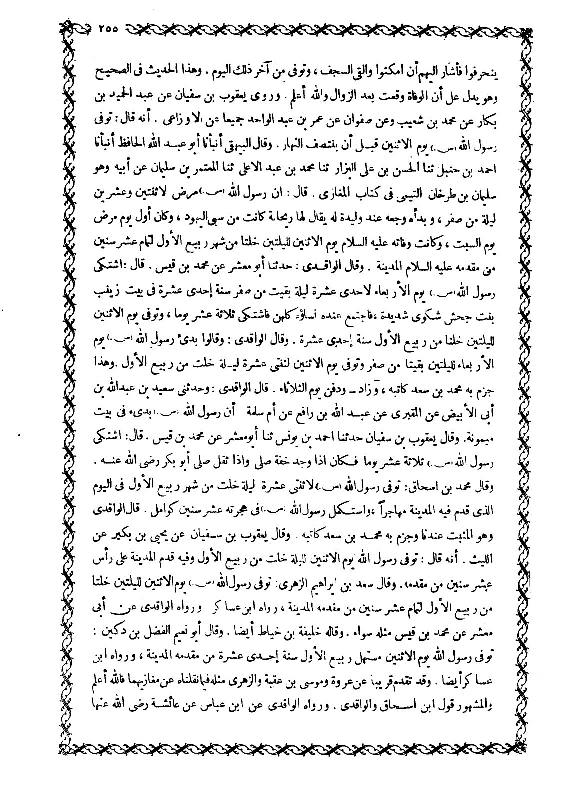 يَنْحَرِفُوا فَأَشَارَ إِلَيْهِمْ أَنِ امْكُثُوا وَأَلْقَى السَّجْفَ، وَتُوُفِّيَ مِنْ آخِرِ ذَلِكَ الْيَوْمِ. وَهَذَا الْحَدِيثُ في الصحيح وهو يدل عل أَنَّ الْوَفَاةَ وَقَعَتْ بَعْدَ الزَّوَالِ وَاللَّهُ أَعْلَمُ. وَرَوَى يَعْقُوبُ بْنُ سُفْيَانَ عَنْ عَبْدِ الْحَمِيدِ بْنِ بَكَّارٍ عَنْ مُحَمَّدِ بْنِ شُعَيْبٍ وَعَنْ صَفْوَانَ عَنْ عُمَرَ بْنِ عَبْدِ الْوَاحِدِ جَمِيعًا عَنِ الْأَوْزَاعِيِّ. أَنَّهُ قَالَ: تُوُفِّيَ رَسُولُ اللَّهِ صَلَّى اللَّهُ عَلَيْهِ وَسَلَّمَ يَوْمَ الِاثْنَيْنِ قَبْلَ أَنْ يَنْتَصِفَ النَّهَارُ. وَقَالَ الْبَيْهَقِيُّ أَنْبَأَنَا أَبُو عَبْدِ اللَّهِ الْحَافِظُ أنبأنا احمد بن حنبل ثَنَا الْحَسَنُ بْنُ عَلِيٍّ الْبَزَّارُ ثَنَا مُحَمَّدُ بْنُ عَبْدِ الْأَعْلَى ثَنَا الْمُعْتَمِرُ بْنُ سُلَيْمَانَ عَنْ أَبِيهِ وَهُوَ سُلَيْمَانُ بْنُ طَرْخَانَ التَّيْمِيُّ فِي كِتَابِ الْمَغَازِي. قَالَ: أَنَّ رَسُولَ اللَّهِ صَلَّى اللَّهُ عَلَيْهِ وَسَلَّمَ مَرِضَ لِاثْنَتَيْنِ وَعِشْرِينَ لَيْلَةً مِنْ صَفَرٍ، وَبَدَأَهُ وَجَعُهُ عِنْدَ وَلِيدَةٍ لَهُ يُقَالُ لَهَا رَيْحَانَةُ كَانَتْ مِنْ سَبْيِ الْيَهُودِ، وَكَانَ أَوَّلَ يَوْمٍ مَرِضَ يَوْمُ السَّبْتِ، وكانت وفاته عليه السلام يَوْمَ الِاثْنَيْنِ لِلَيْلَتَيْنِ خَلَتَا مِنْ شَهْرِ رَبِيعٍ الْأَوَّلِ لِتَمَامِ عَشْرِ سِنِينَ مِنْ مَقْدَمِهِ عَلَيْهِ السلام الْمَدِينَةَ. وَقَالَ الْوَاقِدِيُّ: حَدَّثَنَا أَبُو مَعْشَرٍ عَنْ مُحَمَّدِ بْنِ قَيْسٍ. قَالَ: اشْتَكَى رَسُولُ اللَّهِ صَلَّى اللَّهُ عَلَيْهِ وَسَلَّمَ يَوْمَ الْأَرْبِعَاءِ لِإِحْدَى عَشْرَةَ لَيْلَةً بَقِيَتْ مِنْ صَفَرٍ سَنَةَ إِحْدَى عَشْرَةَ فِي بَيْتِ زَيْنَبَ بِنْتِ جَحْشٍ شَكْوَى شَدِيدَةً، فَاجْتَمَعَ عِنْدَهُ نِسَاؤُهُ كُلُّهُنَّ فَاشْتَكَى ثَلَاثَةَ عَشَرَ يَوْمًا، وَتُوُفِّيَ يَوْمَ الِاثْنَيْنِ لِلَيْلَتَيْنِ خَلَتَا مِنْ رَبِيعٍ الْأَوَّلِ سَنَةَ إِحْدَى عَشْرَةَ. وَقَالَ الْوَاقِدِيُّ: وَقَالُوا بُدِئَ رَسُولُ اللَّهِ صَلَّى اللَّهُ عَلَيْهِ وَسَلَّمَ يَوْمَ الْأَرْبِعَاءِ لِلَيْلَتَيْنِ بَقِيَتَا مِنْ صَفَرٍ وَتُوُفِّيَ يَوْمَ الِاثْنَيْنِ لِثِنْتَيْ عَشْرَةَ لَيْلَةً خَلَتْ مِنْ رَبِيعٍ الْأَوَّلِ. وهذا جَزَمَ بِهِ مُحَمَّدُ بْنُ سَعْدٍ كَاتِبُهُ، وَزَادَ- وَدُفِنَ يَوْمَ الثُّلَاثَاءِ. قَالَ الْوَاقِدِيُّ: وَحَدَّثَنِي سَعِيدُ بْنُ عَبْدِ اللَّهِ بْنِ أَبِي الْأَبْيَضِ عَنِ الْمَقْبُرِيِّ عَنْ عَبْدِ اللَّهِ بْنِ رَافِعٍ عَنْ أُمِّ سَلَمَةَ أَنَّ رَسُولَ اللَّهِ صَلَّى اللَّهُ عَلَيْهِ وَسَلَّمَ بُدِئَ فِي بَيْتِ مَيْمُونَةَ. وَقَالَ يَعْقُوبُ بْنُ سُفْيَانَ حَدَّثَنَا أَحْمَدُ بْنُ يُونُسَ ثَنَا أَبُو مَعْشَرٍ عَنْ مُحَمَّدِ بْنِ قَيْسٍ. قَالَ: اشْتَكَى رَسُولُ اللَّهِ صَلَّى اللَّهُ عَلَيْهِ وَسَلَّمَ ثَلَاثَةَ عَشَرَ يَوْمًا فَكَانَ إِذَا وَجَدَ خِفَّةً صَلَّى وَإِذَا ثَقُلَ صَلَّى أَبُو بَكْرٍ رَضِيَ اللَّهُ عَنْهُ.