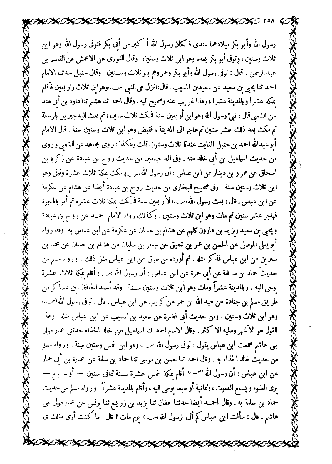 رسول الله وَأَبُو بَكْرٍ مِيلَادَهُمَا عِنْدِي فَكَانَ رَسُولُ اللَّهِ أَكْبَرَ مِنْ أَبِي بَكْرٍ فَتُوُفِّيَ رَسُولُ اللَّهِ وهو ابن ثلاث وسنين، وَتُوُفِّيَ أَبُو بَكْرٍ بَعْدَهُ وَهُوَ ابْنُ ثَلَاثٍ وَسِتِّينَ. وَقَالَ الثَّوْرِيُّ عَنِ الْأَعْمَشِ عَنِ الْقَاسِمِ بْنِ عَبْدِ الرَّحْمَنِ. قَالَ: تُوُفِّيَ رَسُولُ اللَّهِ وأبو بكر وعمرو هم بَنُو ثَلَاثٍ وَسِتِّينَ. وَقَالَ حَنْبَلٌ حَدَّثَنَا الْإِمَامُ أَحْمَدُ ثَنَا يَحْيَى بْنُ سَعِيدٍ عَنِ سَعِيدِ بْنِ الْمُسَيِّبِ. قَالَ: أُنْزِلَ عَلَى النَّبِيِّ صَلَّى اللَّهُ عَلَيْهِ وَسَلَّمَ وَهُوَ ابْنُ ثَلَاثٍ وَأَرْبَعِينَ فَأَقَامَ بِمَكَّةَ عَشْرًا وَبِالْمَدِينَةِ عَشْرًا، وَهَذَا غَرِيبٌ عَنْهُ وَصَحِيحٌ إِلَيْهِ. وَقَالَ أَحْمَدُ ثَنَا هُشَيْمٍ ثَنَا دَاوُدُ بْنُ أَبِي هِنْدٍ عَنِ الشَّعْبِيِّ قَالَ: نبئ رسول الله وَهُوَ ابْنُ أَرْبَعِينَ سَنَةً فَمَكَثَ ثَلَاثَ سِنِينَ، ثُمَّ بُعِثَ إِلَيْهِ جِبْرِيلُ بِالرِّسَالَةِ ثُمَّ مَكَثَ بَعْدَ ذَلِكَ عَشْرَ سِنِينَ ثُمَّ هَاجَرَ إِلَى الْمَدِينَةِ، فَقُبِضَ وَهُوَ ابْنُ ثَلَاثٍ وَسِتِّينَ سَنَةً. قَالَ الْإِمَامُ أَبُو عَبْدِ اللَّهِ أَحْمَدُ بْنُ حنبل الثابت عندنا ثلاث وستون قُلْتُ وَهَكَذَا: رَوَى مُجَاهِدٌ عَنِ الشَّعْبِيِّ وَرَوِيَ مِنْ حَدِيثِ إِسْمَاعِيلَ بْنِ أَبِي خَالِدٍ عَنْهُ. وَفِي الصَّحِيحَيْنِ مِنْ حَدِيثِ رَوْحِ بْنِ عُبَادَةَ عَنْ زَكَرِيَّا بْنِ إِسْحَاقَ عَنْ عَمْرِو بْنِ دِينَارٍ عَنْ ابْنِ عَبَّاسٍ: أَنَّ رَسُولَ اللَّهِ صَلَّى اللَّهُ عَلَيْهِ وَسَلَّمَ مَكَثَ بِمَكَّةَ ثَلَاثَ عَشْرَةَ وَتُوُفِّيَ وَهُوَ ابْنُ ثَلَاثٍ وَسِتِّينَ سَنَةً. وَفِي صَحِيحِ الْبُخَارِيِّ مِنْ حَدِيثِ رَوْحِ بْنِ عُبَادَةَ أَيْضًا عَنْ هِشَامٍ عَنْ عِكْرِمَةَ عَنِ ابْنِ عَبَّاسٍ. قَالَ: بَعَثَ رَسُولُ اللَّهِ صَلَّى اللَّهُ عَلَيْهِ وَسَلَّمَ لِأَرْبَعِينَ سَنَةً فَمَكَثَ بِمَكَّةَ ثَلَاثَ عَشْرَةَ ثُمَّ أُمِرَ بِالْهِجْرَةِ فَهَاجَرَ عَشْرَ سِنِينَ ثُمَّ مَاتَ وَهُوَ ابْنُ ثَلَاثٍ وَسِتِّينَ. وَكَذَلِكَ رَوَاهُ الْإِمَامُ أَحْمَدُ عَنْ رَوْحِ بْنِ عُبَادَةَ وَيَحْيَى بْنِ سَعِيدِ وَيَزِيدَ بْنِ هَارُونَ كُلُّهُمْ عَنْ هِشَامِ بْنِ حَسَّانَ عَنْ عِكْرِمَةَ عَنِ ابْنِ عَبَّاسٍ بِهِ. وَقَدْ رَوَاهُ أَبُو يَعْلَى الْمَوْصِلِيُّ عَنِ الْحَسَنِ بْنِ عُمَرَ بْنِ شَقِيقٍ عَنْ جَعْفَرِ بْنِ سُلَيْمَانَ عَنْ هِشَامِ بْنِ حَسَّانَ عَنْ مُحَمَّدِ بْنِ سيرين عن ابْنِ عَبَّاسٍ فَذَكَرَ مِثْلَهُ. ثُمَّ أَوْرَدَهُ مِنْ طُرُقٍ عَنِ ابْنِ عَبَّاسٍ مِثْلَ ذَلِكَ. وَرَوَاهُ مُسْلِمٌ مِنْ حَدِيثِ حَمَّادِ بْنِ سَلَمَةَ عَنْ أَبِي حمزة عَنِ ابْنِ عَبَّاسٍ: أَنَّ رَسُولَ اللَّهِ صَلَّى اللَّهُ عَلَيْهِ وَسَلَّمَ أَقَامَ بِمَكَّةَ ثَلَاثَ عَشْرَةَ يُوحَى إِلَيْهِ: وَبِالْمَدِينَةِ عَشْرًا وَمَاتَ وَهُوَ ابْنُ ثَلَاثٍ وَسِتِّينَ سَنَةً. وَقَدْ أَسْنَدَ الْحَافِظُ ابْنُ عساكر من طريق مسلم بْنِ جُنَادَةَ عَنْ عَبْدِ اللَّهِ بْنُ عُمَرَ عَنْ كُرَيْبٍ عَنِ ابْنِ عَبَّاسٍ. قَالَ: تُوُفِّيَ رَسُولُ اللَّهِ صَلَّى اللَّهُ عَلَيْهِ وَسَلَّمَ وَهُوَ ابْنُ ثَلَاثٍ وَسِتِّينَ. وَمِنْ حَدِيثِ أَبِي نَضْرَةَ عَنْ سَعِيدِ بْنِ الْمُسَيَّبِ عَنِ ابْنِ عَبَّاسٍ مِثْلَهُ وَهَذَا الْقَوْلُ هُوَ الْأَشْهَرُ وَعَلَيْهِ الْأَكْثَرُ. وَقَالَ الْإِمَامُ أَحْمَدُ ثَنَا إِسْمَاعِيلُ عَنْ خَالِدٍ الحذاء حدثني عمار مولى بنى هاشم سَمِعْتُ ابْنَ عَبَّاسٍ يَقُولُ: تُوُفِّيَ رَسُولُ اللَّهِ صَلَّى اللَّهُ عَلَيْهِ وَسَلَّمَ وَهُوَ ابْنُ خَمْسٍ وَسِتِّينَ سَنَةً. وَرَوَاهُ مُسْلِمٌ مِنْ حَدِيثِ خَالِدٍ الْحَذَّاءِ بِهِ. وَ