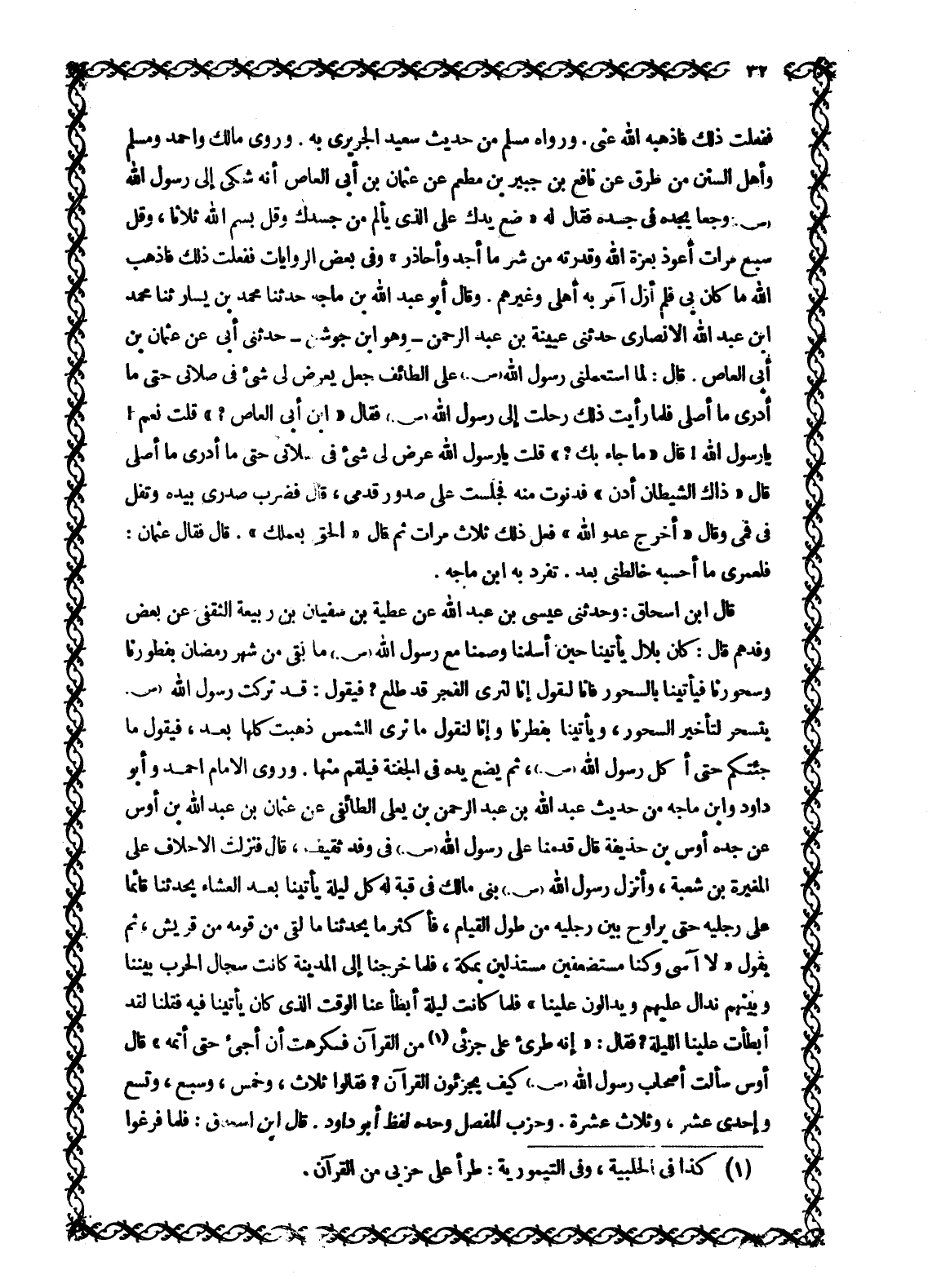 فَلَعَمْرِي مَا أَحْسَبُهُ خَالَطَنِي بَعْدُ. تَفَرَّدَ بِهِ ابْنُ مَاجَهْ. قَالَ ابْنُ إِسْحَاقَ: وَحَدَّثَنِي عِيسَى بْنُ عَبْدِ اللَّهِ عَنْ عَطِيَّةَ بْنِ سُفْيَانَ بْنِ رَبِيعَةَ الثَّقَفِيِّ عَنْ بَعْضِ وَفْدِهِمْ قَالَ: كَانَ بِلَالٌ يَأْتِينَا حِينَ أَسْلَمْنَا وَصُمْنَا مَعَ رَسُولِ اللَّهِ صَلَّى اللَّهُ عَلَيْهِ وَسَلَّمَ مَا بَقِيَ مِنْ شَهْرِ رَمَضَانَ بِفَطُورِنَا وَسَحُورِنَا فَيَأْتِينَا بِالسَّحُورِ فَإِنَّا لَنَقُولُ إِنَّا لَنَرَى الْفَجْرَ قَدْ طَلَعَ؟ فَيَقُولُ: قَدْ تَرَكْتَ رَسُولَ اللَّهِ صَلَّى اللَّهُ عَلَيْهِ وَسَلَّمَ يَتَسَحَّرُ لِتَأْخِيرِ السَّحُورِ، وَيَأْتِينَا بِفِطْرِنَا وَإِنَّا لَنَقُولُ مَا نَرَى الشَّمْسَ ذَهَبَتْ كُلَّهَا بَعْدُ، فَيَقُولُ مَا جِئْتُكُمْ حَتَّى أَكَلَ رَسُولُ اللَّهِ صَلَّى اللَّهُ عَلَيْهِ وَسَلَّمَ، ثُمَّ يَضَعُ يَدَهُ فِي الْجَفْنَةِ فَيَلْقَمُ مِنْهَا. وَرَوَى الْإِمَامُ أَحْمَدُ وَأَبُو دَاوُدَ وَابْنُ مَاجَهْ مِنْ حَدِيثِ عَبْدِ اللَّهِ بْنِ عَبْدِ الرَّحْمَنِ بْنِ يَعْلَى الطَّائِفِيِّ عَنْ عُثْمَانَ بْنِ عَبْدِ اللَّهِ بْنِ أَوْسٍ عَنْ جَدِّهِ أَوْسِ بْنِ حُذَيْفَةَ قَالَ قَدِمْنَا عَلَى رَسُولِ اللَّهِ صَلَّى اللَّهُ عَلَيْهِ وَسَلَّمَ في وفد ثَقِيفٍ، قَالَ فَنَزَلَتِ الْأَحْلَافُ عَلَى الْمُغِيرَةِ بْنِ شُعْبَةَ، وَأَنْزَلَ رَسُولُ اللَّهِ صَلَّى اللَّهُ عَلَيْهِ وَسَلَّمَ بَنِي مَالِكٍ فِي قُبَّةٍ لَهُ كُلَّ لَيْلَةٍ يَأْتِينَا بَعْدَ الْعِشَاءِ يُحَدِّثُنَا قَائِمًا عَلَى رِجْلَيْهِ حَتَّى يُرَاوِحَ بَيْنَ رِجْلَيْهِ مِنْ طُولِ الْقِيَامِ، فَأَكْثَرُ مَا يُحَدِّثُنَا مَا لَقِيَ مِنْ قومه من قريش، ثم يقول «لا آسى وَكُنَّا مُسْتَضْعَفِينَ مُسْتَذَلِّينَ بِمَكَّةَ، فَلَمَّا خَرَجْنَا إِلَى الْمَدِينَةِ كَانَتْ سِجَالُ الْحَرْبِ بَيْنَنَا وَبَيْنَهُمْ نُدَالُ عَلَيْهِمْ وَيُدَالُونَ عَلَيْنَا» فَلَمَّا كَانَتْ لَيْلَةٌ أَبْطَأَ عنا الْوَقْتِ الَّذِي كَانَ يَأْتِينَا فِيهِ فَقُلْنَا لَقَدْ أبطأت علينا الليلة؟ فقال: «إنه طرئ على جزئى [1] مِنَ الْقُرْآنِ فَكَرِهْتُ أَنْ أَجِيءَ حَتَّى أُتِمَّهُ» قَالَ أَوْسٌ سَأَلْتُ أَصْحَابِ رَسُولِ اللَّهِ صَلَّى اللَّهُ عَلَيْهِ وَسَلَّمَ كيف يجزئون الْقُرْآنَ؟ فَقَالُوا ثَلَاثٌ، وَخُمْسٌ، وَسَبْعٌ، وَتِسْعٌ وَإِحْدَى عشر، وثلاث عشرة. وحزب المفصل وحده لفظ أبو داود. قال ابن إسحاق: فلما فرغوا