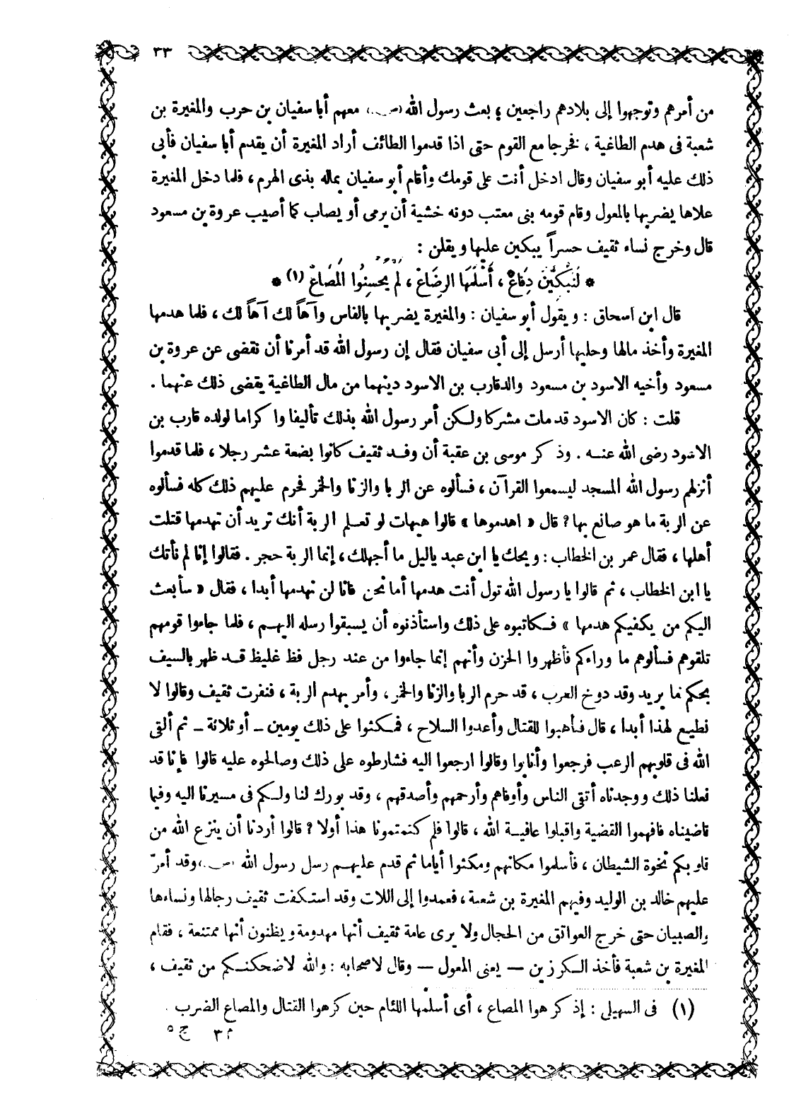 مِنْ أَمْرِهِمْ وَتَوَجَّهُوا إِلَى بِلَادِهِمْ رَاجِعِينَ، بَعَثَ رَسُولُ اللَّهِ صَلَّى اللَّهُ عَلَيْهِ وَسَلَّمَ مَعَهُمْ أَبَا سُفْيَانَ بْنَ حَرْبٍ وَالْمُغِيرَةَ بْنَ شُعْبَةَ فِي هَدْمِ الطَّاغِيَةِ، فَخَرَجَا مَعَ الْقَوْمِ حَتَّى إِذَا قَدِمُوا الطَّائِفَ أَرَادَ الْمُغِيرَةُ أَنْ يُقَدِّمَ أَبَا سُفْيَانَ فَأَبَى ذَلِكَ عَلَيْهِ أَبُو سُفْيَانَ وَقَالَ ادْخُلْ أَنْتَ عَلَى قَوْمِكَ وَأَقَامَ أَبُو سُفْيَانَ بِمَالِهِ بِذِي الْهَرْمِ، فَلَمَّا دَخَلَ الْمُغِيرَةُ علاها يضربها بالمعول وقام قومه بنى مُعَتِّبٍ دُونَهُ خَشْيَةَ أَنْ يُرْمَى أَوْ يُصَابَ كَمَا أُصِيبَ عُرْوَةُ بْنُ مَسْعُودٍ قَالَ وَخَرَجَ نساء ثقيف حسرا يبكين عليها ويقلن: