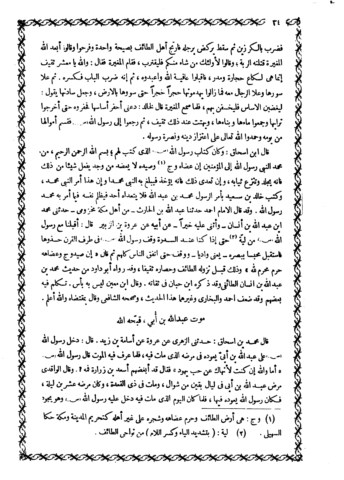 قَالَ ابْنُ إِسْحَاقَ: وَكَانَ كِتَابَ رَسُولِ اللَّهِ صَلَّى اللَّهُ عَلَيْهِ وَسَلَّمَ الَّذِي كَتَبَ لَهُمْ، بِسْمِ اللَّهِ الرَّحْمنِ الرَّحِيمِ، 1: 1 مِنْ مُحَمَّدٍ النَّبِيِّ رَسُولِ اللَّهِ إِلَى الْمُؤْمِنِينَ إِنَّ عِضَاةَ وَجٍّ [1] وَصَيْدَهُ لَا يُعْضَدُ مَنْ وَجَدَ يَفْعَلُ شَيْئًا مِنْ ذَلِكَ فَإِنَّهُ يُجْلَدُ وَتُنْزَعُ ثِيَابُهُ، وَإِنْ تَعَدَّى ذَلِكَ فَإِنَّهُ يُؤْخَذُ فَيُبْلَغُ بِهِ النَّبِيَّ مُحَمَّدًا وَإِنَّ هَذَا أَمْرُ النَّبِيِّ مُحَمَّدٍ، وَكَتَبَ خَالِدُ بْنُ سَعِيدٍ بِأَمْرِ الرسول محمد بن عبد الله فلا يتعداه أحد فيظلم نفسه فيما أمر به محمد رسول الله. وَقَدْ قَالَ الْإِمَامُ أَحْمَدُ حَدَّثَنَا عَبْدُ اللَّهِ بْنُ الْحَارِثِ- مِنْ أَهْلِ مَكَّةَ مَخْزُومِيٌّ- حَدَّثَنِي محمد ابن عَبْدِ اللَّهِ بْنِ إِنْسَانَ- وَأَثْنَى عَلَيْهِ خَيْرًا- عن أبيه عن عروة بن الزبير قَالَ: أَقْبَلْنَا مَعَ رَسُولِ اللَّهِ صَلَّى اللَّهُ عَلَيْهِ وَسَلَّمَ مِنْ لِيَةَ [2] حَتَّى إِذَا كُنَّا عِنْدَ السِّدْرَةِ وَقَفَ رَسُولُ اللَّهِ صَلَّى اللَّهُ عَلَيْهِ وَسَلَّمَ في طرف القرن حذوها فاستقبل محبسا ببصره- يعنى واديا- ووقف حتى اتفق الناس كلهم ثم قال «إن صيدوح وَعِضَاهَهُ حَرَمٌ مُحَرَّمٌ للَّه» وَذَلِكَ قَبْلَ نُزُولِهِ الطَّائِفَ وَحِصَارِهِ ثَقِيفًا، وَقَدْ رَوَاهُ أَبُو دَاوُدَ مِنْ حَدِيثِ مُحَمَّدِ بْنِ عَبْدِ اللَّهِ بْنِ إِنْسَانَ الطَّائِفِيِّ وَقَدْ ذَكَرَهُ ابْنُ حِبَّانَ فِي ثِقَاتِهِ. وَقَالَ ابْنُ مَعِينٍ لَيْسَ بِهِ بَأْسٌ. تَكَلَّمَ فِيهِ بَعْضُهُمْ وَقَدْ ضَعَّفَ أَحْمَدُ وَالْبُخَارِيُّ وَغَيْرُهُمَا هَذَا الْحَدِيثَ، وَصَحَّحَهُ الشَّافِعِيُّ وَقَالَ بِمُقْتَضَاهُ وَاللَّهُ أَعْلَمُ.