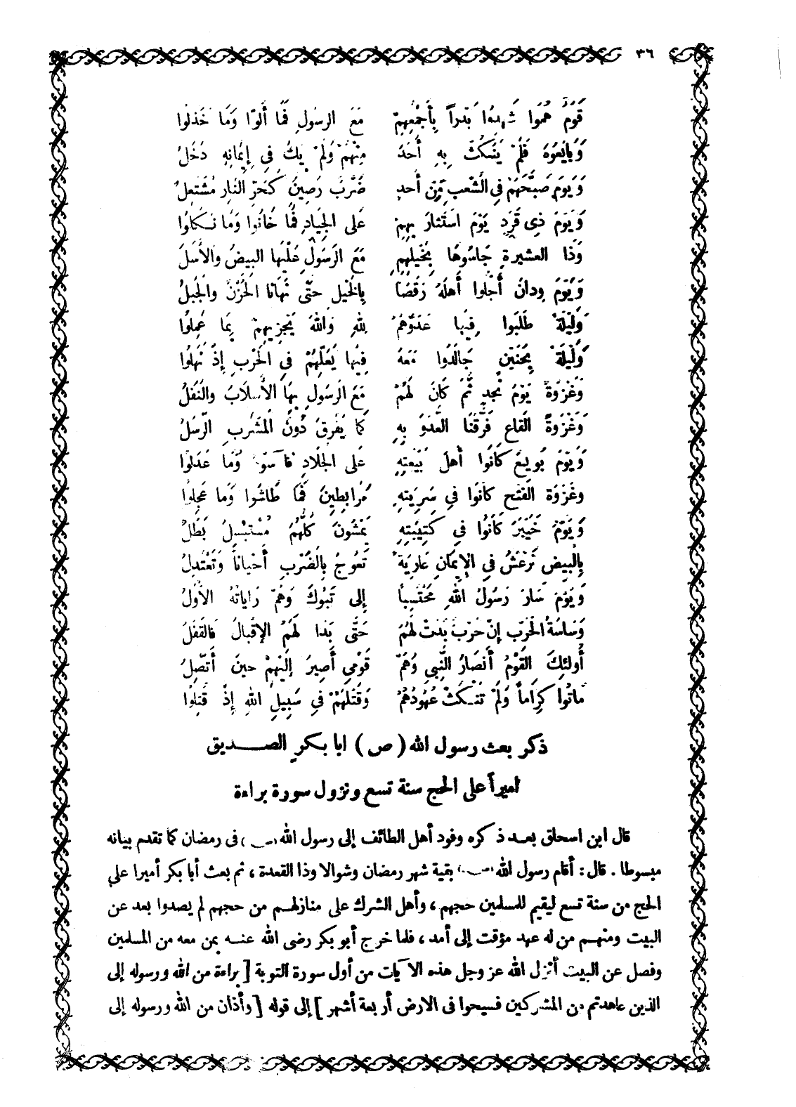 قَالَ ابْنُ إِسْحَاقَ بَعْدَ ذِكْرِهِ وُفُودَ أَهْلِ الطَّائِفِ إِلَى رَسُولِ اللَّهِ صَلَّى اللَّهُ عَلَيْهِ وَسَلَّمَ فِي رَمَضَانَ كَمَا تَقَدَّمَ بَيَانُهُ مبسوطا. قَالَ: أَقَامَ رَسُولُ اللَّهِ صَلَّى اللَّهُ عَلَيْهِ وَسَلَّمَ بَقِيَّةَ شَهْرِ رَمَضَانَ وَشَوَّالًا وَذَا الْقَعْدَةِ، ثُمَّ بَعَثَ أَبَا بَكْرٍ أَمِيرًا عَلَى الْحَجِّ مِنْ سَنَةِ تِسْعٍ لِيُقِيمَ لِلْمُسْلِمِينَ حَجَّهُمْ، وَأَهْلُ الشِّرْكِ عَلَى مَنَازِلِهِمْ مِنْ حَجِّهِمْ لَمْ يُصَدُّوا بَعْدُ عَنِ الْبَيْتِ وَمِنْهُمْ مَنْ لَهُ عَهْدٌ مُؤَقَّتٌ إِلَى أَمَدٍ، فَلَمَّا خَرَجَ أَبُو بَكْرٍ رَضِيَ اللَّهُ عَنْهُ بِمَنْ مَعَهُ مِنَ الْمُسْلِمِينَ وفصل عن البيت أَنْزَلَ اللَّهُ عَزَّ وَجَلَّ هَذِهِ الْآيَاتِ مِنْ أَوَّلِ سُورَةِ التَّوْبَةِ بَراءَةٌ مِنَ اللَّهِ وَرَسُولِهِ إِلَى الَّذِينَ عاهَدْتُمْ مِنَ الْمُشْرِكِينَ فَسِيحُوا فِي الْأَرْضِ أَرْبَعَةَ أَشْهُرٍ 9: 1- 2 إِلَى قَوْلِهِ وَأَذانٌ مِنَ اللَّهِ وَرَسُولِهِ إِلَى