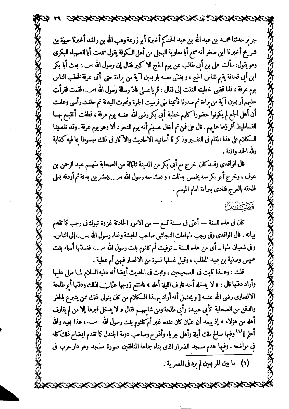 جَرِيرٍ حَدَّثَنَا مُحَمَّدُ بْنُ عَبْدِ اللَّهِ بْنُ عَبْدِ الْحَكَمِ أَخْبَرَنَا أَبُو زُرْعَةَ وَهْبُ اللَّهِ بْنُ رَاشِدٍ أَخْبَرَنَا حَيْوَةُ بْنُ شُرَيْحٍ أَخْبَرَنَا ابن صَخْرٍ أَنَّهُ سَمِعَ أَبَا مُعَاوِيَةَ الْبَجَلِيَّ مِنْ أَهْلِ الْكُوفَةِ يَقُولُ سَمِعْتُ أَبَا الصَّهْبَاءِ الْبَكْرِيَّ وَهُوَ يَقُولُ: سَأَلْتُ عَلِيَّ بْنَ أَبِي طَالِبٍ عَنْ يَوْمِ الْحَجِّ الْأَكْبَرِ فَقَالَ إِنَّ رَسُولَ اللَّهِ صَلَّى اللَّهُ عَلَيْهِ وَسَلَّمَ بَعَثَ أَبَا بكر ابن أَبِي قُحَافَةَ يُقِيمُ لِلنَّاسِ الْحَجَّ، وَبَعَثَنِي مَعَهُ بِأَرْبَعِينَ آيَةً مِنْ بَرَاءَةَ حَتَّى أَتَى عَرَفَةَ فَخَطَبَ النَّاسَ يَوْمَ عَرَفَةَ، فَلَمَّا قَضَى خُطْبَتَهُ الْتَفَتَ إِلَيَّ فَقَالَ: قُمْ يَا عَلِيُّ فَأَدِّ رِسَالَةَ رَسُولِ اللَّهِ صَلَّى اللَّهُ عَلَيْهِ وَسَلَّمَ فَقُمْتُ فَقَرَأْتُ عَلَيْهِمْ أَرْبَعِينَ آيَةً مِنْ بَرَاءَةَ ثُمَّ صَدَرْنَا فَأَتَيْنَا مِنًى فَرَمَيْتُ الْجَمْرَةَ وَنَحَرْتُ الْبَدَنَةَ ثُمَّ حَلَقْتُ رَأْسِي وَعَلِمْتُ أَنَّ أَهْلَ الْجَمْعِ لَمْ يَكُونُوا حُضُورًا كُلُّهُمْ خُطْبَةَ أَبِي بكر رضى الله عنه يوم عرفة، فطفت أَتَتَبَّعُ بِهَا الْفَسَاطِيطَ أَقْرَؤُهَا عَلَيْهِمْ. قَالَ عَلِيٌّ فَمِنْ ثَمَّ إِخَالُ حَسِبْتُمْ أَنَّهُ يَوْمُ النَّحْرِ، أَلَا وَهُوَ يَوْمُ عَرَفَةَ. وَقَدْ تَقَصَّيْنَا الْكَلَامَ عَلَى هَذَا الْمَقَامِ فِي التَّفْسِيرِ وَذَكَرْنَا أَسَانِيدَ الْأَحَادِيثِ وَالْآثَارِ فِي ذَلِكَ مَبْسُوطًا بِمَا فِيهِ كِفَايَةٌ وللَّه الْحَمْدُ وَالْمِنَّةُ.