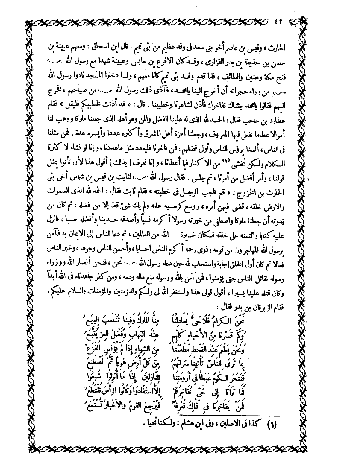 الْحَارِثِ، وَقَيْسُ بْنُ عَاصِمٍ أَخُو بَنِي سَعْدٍ فِي وَفْدٍ عَظِيمٍ مِنْ بَنِي تَمِيمٍ. قَالَ ابْنُ إِسْحَاقَ: وَمَعَهُمْ عُيَيْنَةُ بْنُ حِصْنِ بْنِ حُذَيْفَةَ بْنِ بَدْرٍ الْفَزَارِيُّ، وَقَدْ كَانَ الْأَقْرَعُ بْنُ حَابِسٍ وعُيَيْنَةُ شَهِدَا مَعَ رَسُولِ اللَّهِ صَلَّى اللَّهُ عَلَيْهِ وَسَلَّمَ فتح مكة وحنين وَالطَّائِفَ، فَلَمَّا قَدِمَ وَفْدُ بَنِي تَمِيمٍ كَانَا معهم، ولما دَخَلُوا الْمَسْجِدَ نَادَوْا رَسُولَ اللَّهِ صَلَّى اللَّهُ عَلَيْهِ وَسَلَّمَ مِنْ وَرَاءِ حُجُرَاتِهِ أَنِ اخْرُجْ إِلَيْنَا يَا مُحَمَّدُ، فَآذَى ذَلِكَ رَسُولَ اللَّهِ صَلَّى اللَّهُ عَلَيْهِ وَسَلَّمَ مِنْ صِيَاحِهِمْ، فَخَرَجَ إِلَيْهِمْ فَقَالُوا يَا مُحَمَّدُ جِئْنَاكَ نُفَاخِرُكَ فَأْذَنْ لِشَاعِرِنَا وَخَطِيبِنَا. قَالَ: «قَدْ أَذِنْتُ لِخَطِيبِكُمْ فَلْيَقُلْ» فَقَامَ عُطَارِدُ بْنُ حَاجِبٍ فَقَالَ: الْحَمْدُ للَّه الَّذِي لَهُ عَلَيْنَا الْفَضْلُ وَالْمَنُّ وَهُوَ أَهْلُهُ الَّذِي جَعَلَنَا مُلُوكًا وَوَهَبَ لَنَا أَمْوَالًا عِظَامًا نفعل فيها المعروف، وجعلنا أعزة أَهْلِ الْمَشْرِقِ وَأَكْثَرُهُ عَدَدًا وَأَيْسَرَهُ عُدَّةً. فَمَنْ مِثْلُنَا فِي النَّاسِ، أَلَسْنَا بِرُءُوسِ النَّاسِ وَأُولِي فَضْلِهِمْ، فَمَنْ فَاخَرَنَا فَلْيُعَدِّدْ مِثْلَ مَا عَدَّدْنَا، وإنا لو نشاء لا كثرنا الكلام ولكن نخشى [1] مِنَ الْإِكْثَارِ فِيمَا أَعْطَانَا، وَإِنَّا نُعْرَفُ [بِذَلِكَ] أَقُولُ هَذَا لَأَنْ تَأْتُوا بِمِثْلِ قَوْلِنَا، وَأَمْرٍ أَفْضَلَ مِنْ أَمْرِنَا، ثُمَّ جَلَسَ. فَقَالَ رَسُولُ اللَّهِ صَلَّى اللَّهُ عَلَيْهِ وَسَلَّمَ لِثَابِتِ بْنِ قَيْسِ بْنِ شَمَّاسٍ أَخِي بَنِي الْحَارِثِ بْنِ الْخَزْرَجِ: «قُمْ فَأَجِبِ الرَّجُلَ فِي خُطْبَتِهِ» فَقَامَ ثابت فقال: الحمد للَّه الّذي السموات وَالْأَرْضُ خَلْقُهُ، قَضَى فِيهِنَّ أَمْرُهُ، وَوَسِعَ كُرْسِيَّهُ عِلْمُهُ وَلَمْ يَكُ شَيْءٌ قَطُّ إِلَّا مِنْ فَضْلِهِ، ثُمَّ كَانَ مِنْ قُدْرَتِهِ أَنْ جَعَلَنَا ملوكا واصطفى من خيرته رَسُولًا أَكْرَمَهُ نَسَبًا وَأَصْدَقَهُ حَدِيثًا وَأَفْضَلَهُ حَسَبًا، فَأَنْزَلَ عَلَيْهِ كِتَابًا وَائْتَمَنَهُ عَلَى خَلْقِهِ فَكَانَ خِيرَةَ [2] اللَّهِ مِنَ الْعَالَمِينَ، ثُمَّ دَعَا النَّاسَ إِلَى الْإِيمَانِ بِهِ فَآمَنَ بِرَسُولِ اللَّهِ الْمُهَاجِرُونَ مِنْ قَوْمِهِ وَذَوِي رَحِمِهِ أَكْرَمُ النَّاسِ أَحْسَابًا، وَأَحْسَنُ النَّاسِ وُجُوهًا، وَخَيْرُ النَّاسِ فِعَالًا ثُمَّ كَانَ أَوَّلَ الْخَلْقِ إِجَابَةً وَاسْتَجَابَ للَّه حِينَ دَعَاهُ رَسُولُ اللَّهِ صَلَّى اللَّهُ عَلَيْهِ وَسَلَّمَ نَحْنُ، فنحن أنصار الله ووزراء رَسُولِهِ نُقَاتِلُ النَّاسَ حَتَّى يُؤْمِنُوا، فَمَنْ آمَنَ باللَّه وَرَسُولِهِ مَنَعَ مَالَهُ وَدَمَهُ، وَمَنْ كَفَرَ جَاهَدْنَاهُ فِي اللَّهِ أَبَدًا وَكَانَ قَتْلُهُ عَلَيْنَا يَسِيرًا، أَقُولُ قَوْلِي هَذَا وَأَسْتَغْفِرُ اللَّهَ لِي وَلَكُمْ وَلِلْمُؤْمِنِينَ وَالْمُؤْمِنَاتِ وَالسَّلَامُ عَلَيْكُمْ.