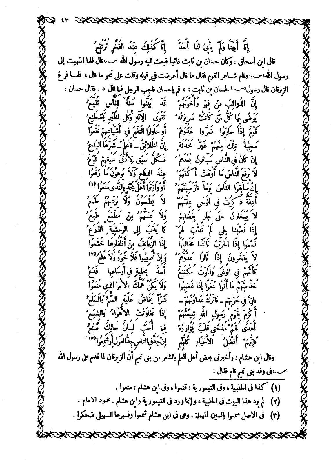 قَالَ ابْنُ إِسْحَاقَ: وَكَانَ حَسَّانُ بْنُ ثَابِتٍ غَائِبًا فَبَعَثَ إِلَيْهِ رَسُولُ اللَّهِ صَلَّى اللَّهُ عَلَيْهِ وَسَلَّمَ قَالَ فَلَمَّا انْتَهَيْتُ إِلَى رَسُولِ اللَّهِ صَلَّى اللَّهُ عَلَيْهِ وَسَلَّمَ وَقَامَ شَاعِرُ الْقَوْمِ فَقَالَ مَا قال أعرضت فِي قَوْلِهِ وَقُلْتُ عَلَى نَحْوِ مَا قَالَ، فلما فرغ الزبرقان قال رسول صَلَّى اللَّهُ عَلَيْهِ وَسَلَّمَ لِحَسَّانَ بْنِ ثَابِتٍ: «قُمْ يَا حَسَّانُ فَأَجِبِ الرَّجُلَ فِيمَا قَالَ» . فَقَالَ حَسَّانُ: