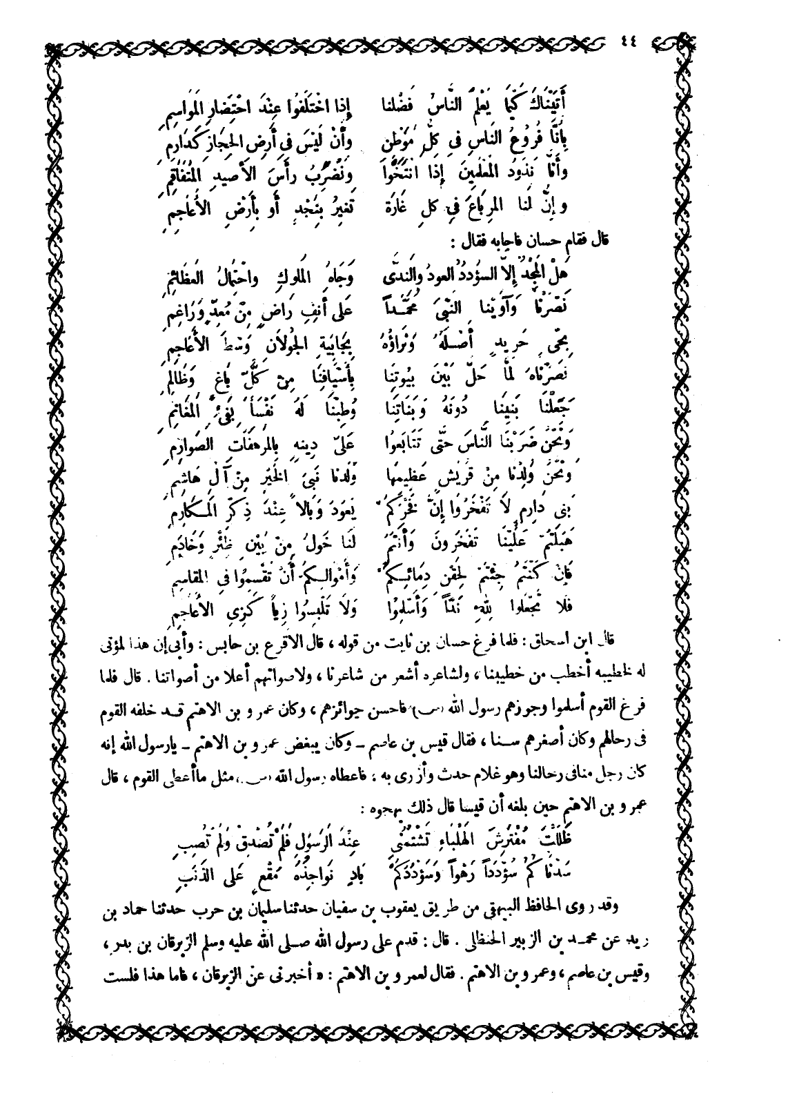 قَالَ فَقَامَ حَسَّانُ فَأَجَابَهُ فَقَالَ: