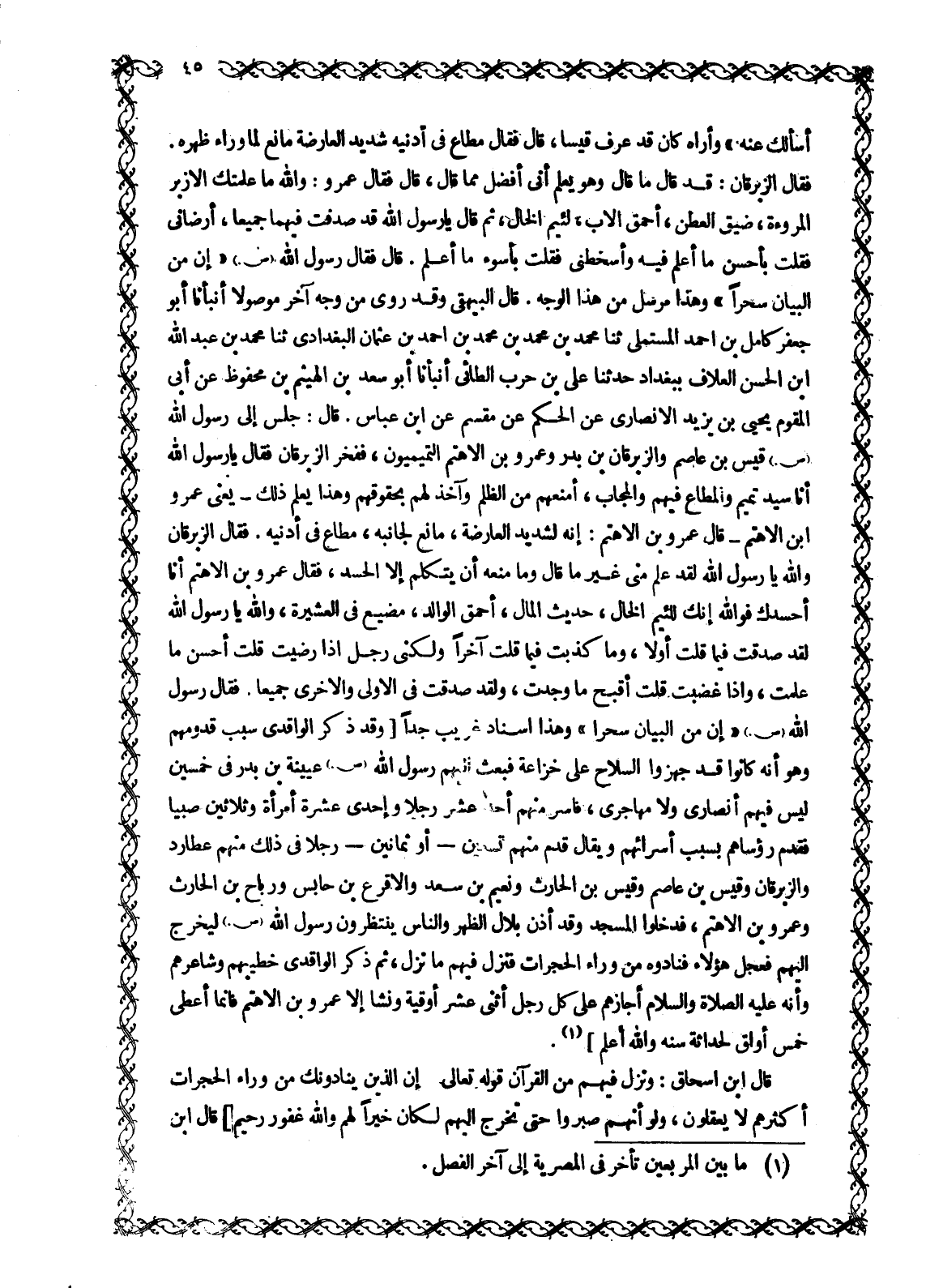 فَقَالَ الزِّبْرِقَانُ: قَدْ قَالَ مَا قَالَ وَهُوَ يَعْلَمُ أَنِّي أَفْضَلُ مِمَّا قَالَ، قَالَ فَقَالَ عَمْرٌو: وَاللَّهِ مَا علمتك إلا زبر الْمُرُوءَةِ، ضَيِّقَ الْعَطَنِ، أَحْمَقَ الْأَبِ، لَئِيمَ الْخَالِ، ثُمَّ قَالَ يَا رَسُولَ اللَّهِ قَدْ صَدَقْتُ فِيهِمَا جَمِيعًا، أَرْضَانِي فَقُلْتُ بِأَحْسَنِ مَا أَعْلَمُ فيه وأسخطنى فقلت بأسوإ ما أعلم. قَالَ فَقَالَ رَسُولُ اللَّهِ صَلَّى اللَّهُ عَلَيْهِ وَسَلَّمَ «إِنَّ مِنَ الْبَيَانِ سِحْرًا» وَهَذَا مُرْسَلٌ مِنْ هَذَا الْوَجْهِ. قَالَ الْبَيْهَقِيُّ وَقَدْ رُوِيَ مِنْ وَجْهٍ آخَرَ موصولا أنبأنا أَبُو جَعْفَرٍ كَامِلُ بْنُ أَحْمَدَ الْمُسْتَمْلِي ثنا محمد بْنِ مُحَمَّدُ بْنُ مُحَمَّدِ بْنِ أَحْمَدَ بْنِ عُثْمَانَ البغدادي ثنا محمد بن عبد الله ابن الحسن الْعَلَّافُ بِبَغْدَادَ حَدَّثَنَا عَلِيُّ بْنُ حَرْبٍ الطَّائِيُّ أَنْبَأَنَا أَبُو سَعْدِ بْنُ الْهَيْثَمِ بْنِ مَحْفُوظٍ عَنْ أَبِي الْمُقَوِّمِ يَحْيَى بْنِ يَزِيدَ الْأَنْصَارِيِّ عَنِ الْحَكَمِ عَنْ مِقْسَمٍ عَنِ ابْنِ عَبَّاسٍ. قَالَ: جَلَسَ إِلَى رَسُولِ اللَّهِ صَلَّى اللَّهُ عَلَيْهِ وَسَلَّمَ قَيْسُ بْنُ عَاصِمٍ وَالزِّبْرِقَانُ بْنُ بَدْرٍ وَعَمْرُو بْنُ الْأَهْتَمِ التَّمِيمِيُّونَ، فَفَخَرَ الزِّبْرِقَانُ فقال يا رسول الله أنا سيد تَمِيمٍ وَالْمُطَاعُ فِيهِمْ وَالْمُجَابُ، أَمْنَعُهُمْ مِنَ الظُّلْمِ وَآخُذُ لَهُمْ بِحُقُوقِهِمْ وَهَذَا يَعْلَمُ ذَلِكَ- يَعْنِي عمرو ابن الأهتم- قال عَمْرُو بْنُ الْأَهْتَمِ: إِنَّهُ لَشَدِيدُ الْعَارِضَةِ، مَانِعٌ لِجَانِبِهِ، مُطَاعٌ فِي أَدْنَيْهِ. فَقَالَ الزِّبْرِقَانُ وَاللَّهِ يَا رَسُولَ اللَّهِ لَقَدْ عَلِمَ مِنِّي غَيْرَ مَا قَالَ وَمَا مَنَعَهُ أَنْ يَتَكَلَّمَ إِلَّا الْحَسَدُ، فَقَالَ عَمْرُو بْنُ الْأَهْتَمِ أَنَا أَحْسُدُكَ فو الله إِنَّكَ لَلَئِيمُ الْخَالِ، حَدِيثُ الْمَالِ، أَحْمَقُ الْوَالِدِ، مُضَيَّعٌ فِي الْعَشِيرَةِ، وَاللَّهِ يَا رَسُولَ اللَّهِ لَقَدْ صَدَقْتُ فِيمَا قُلْتُ أَوَّلًا، وَمَا كَذَبْتُ فِيمَا قُلْتُ آخِرًا وَلَكِنِّي رِجْلٌ إِذَا رَضِيتُ قُلْتُ أَحْسَنَ مَا عَلِمْتُ، وَإِذَا غَضِبْتُ قُلْتُ أَقْبَحَ مَا وَجَدْتُ، وَلَقَدْ صَدَقْتُ فِي الْأُولَى وَالْأُخْرَى جَمِيعًا. فَقَالَ رَسُولُ اللَّهِ صَلَّى اللَّهُ عَلَيْهِ وَسَلَّمَ «إِنَّ مِنَ الْبَيَانِ سِحْرًا» وَهَذَا إِسْنَادٌ غَرِيبٌ جِدًّا [وَقَدْ ذَكَرَ الْوَاقِدِيُّ سَبَبَ قدومهم وهو أنه كانوا قد جهزوا السِّلَاحَ عَلَى خُزَاعَةَ فَبَعَثَ إِلَيْهِمْ رَسُولُ اللَّهِ صَلَّى اللَّهُ عَلَيْهِ وَسَلَّمَ عُيَيْنَةَ بْنَ بَدْرٍ فِي خَمْسِينَ لَيْسَ فِيهِمْ أَنْصَارِيٌّ وَلَا مُهَاجِرِيٌّ، فَأَسَرَ مِنْهُمْ أَحَدَ عَشَرَ رَجُلًا وَإِحْدَى عَشْرَةَ امرأة وثلاثين صبيا فقدم رؤساهم بسبب أسرائهم ويقال قدم منهم تسعين- أو ثمانين- رَجُلًا فِي ذَلِكَ مِنْهُمْ عُطَارِدٌ وَالزِّبْرِقَانُ وَقَيْسُ بْنُ عَاصِمٍ وَقَيْسُ بْنُ الْحَارِثِ وَنُعَيْمُ بْنُ سَعْدٍ وَالْأَقْرَعُ بْنُ حَابِسٍ وَرَبَاحُ بْنُ الْحَارِثِ وَعَمْرُو بْنُ الْأَهْتَمِ، فَدَخَلُوا الْمَسْجِدَ وَقَدْ أَذَّنَ بِلَالٌ الظُّهْرَ وَالنَّاسُ يَنْتَظِرُونَ رَسُولَ اللَّهِ صَلَّى اللَّهُ عَلَيْهِ وَسَلَّمَ لِيَخْرُجَ إِلَيْهِمْ فَعَجِلَ هَؤُلَاءِ فَنَادَوْهُ مِنْ وَرَاءِ الْحُجُرَاتِ فَنَزَلَ فِيهِمْ مَا نَزَلَ، ثُمَّ ذَكَرَ الْوَاقِدِيُّ خَطِيبَهُمْ وَشَاعِرَهُمْ وَأَنَّهُ عَلَيْهِ الصَّلَاةُ وَالسَّلَامُ أَجَازَهُمْ عَلَى كُلِّ رَجُلٍ أثنى عشر أُوقِيَّةٍ وَنَشًّا إِلَّا عَمْرَو بْنَ الْأَهْتَمِ فَإِنَّمَا أُعْطِيَ خَمْسَ أَوَاقٍ لِحَدَاثَةِ سِنِّهِ وَاللَّهُ أَعْلَمُ] [1] .