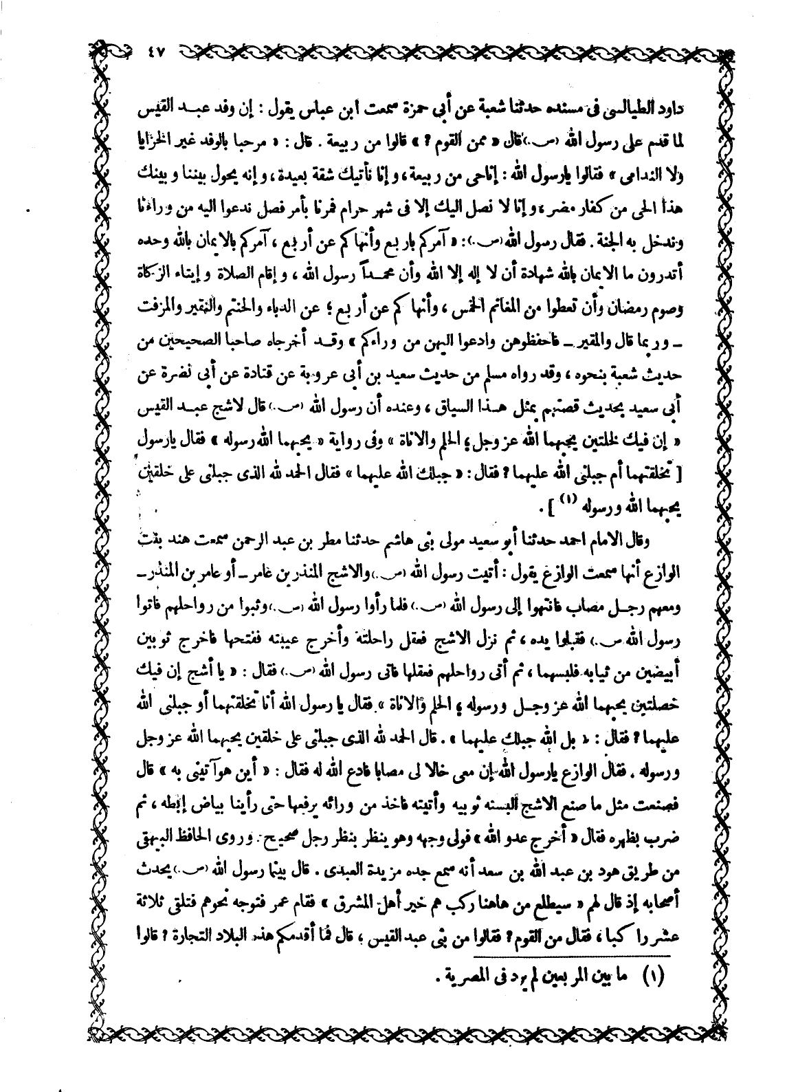 دَاوُدَ الطَّيَالِسِيُّ فِي مُسْنَدِهِ حَدَّثَنَا شُعْبَةُ عَنِ أبى حمزة سَمِعْتُ ابْنَ عَبَّاسٍ يَقُولُ: إِنَّ وَفْدَ عَبْدِ الْقَيْسِ لَمَّا قَدِمَ عَلَى رَسُولِ اللَّهِ صَلَّى اللَّهُ عَلَيْهِ وَسَلَّمَ قَالَ «مِمَّنِ الْقَوْمُ؟» قَالُوا مِنْ رَبِيعَةَ. قَالَ: «مَرْحَبًا بِالْوَفْدِ غَيْرِ الْخَزَايَا وَلَا النَّدَامَى» فَقَالُوا يَا رَسُولَ اللَّهِ: إِنَّا حي من ربيعة، وإنا نأتيك شُقَّةٍ بَعِيدَةٍ، وَإِنَّهُ يَحُولُ بَيْنَنَا وَبَيْنَكَ هَذَا الْحَيُّ مِنْ كُفَّارِ مُضَرَ، وَإِنَّا لَا نَصُلْ إِلَيْكَ إِلَّا فِي شَهْرٍ حَرَامٍ فَمُرْنَا بِأَمْرٍ فصل ندعوا إِلَيْهِ مَنْ وَرَاءَنَا وَنَدْخُلُ بِهِ الْجَنَّةِ. فَقَالَ رَسُولُ اللَّهِ صَلَّى اللَّهُ عَلَيْهِ وَسَلَّمَ: «آمُرُكُمْ بِأَرْبَعٍ وَأَنْهَاكُمْ عَنْ أَرْبَعٍ، آمُرُكُمْ بِالْإِيمَانِ باللَّه وَحْدَهُ أَتَدْرُونَ مَا الْإِيمَانُ باللَّه شَهَادَةُ أَنْ لَا إِلهَ إِلَّا اللَّهُ 37: 35 وَأَنَّ مُحَمَّدًا رَسُولُ اللَّهِ، وَإِقَامِ الصَّلَاةِ وَإِيتَاءِ الزَّكَاةِ وصوم رمضان وأن تعطوا من المغانم الخمس، وأنها كم عَنْ أَرْبَعٍ، عَنِ الدُّبَّاءِ وَالْحَنْتَمِ وَالنَّقِيرِ وَالْمُزَفَّتِ- وَرُبَّمَا قَالَ وَالْمُقَيَّرِ- فَاحْفَظُوهُنَّ وَادْعُوا إِلَيْهِنَّ مَنْ وراءكم» وقد أخرجاه صَاحِبَا الصَّحِيحَيْنِ مِنْ حَدِيثِ شُعْبَةَ بِنَحْوِهِ، وَقَدْ رَوَاهُ مُسْلِمٌ مِنْ حَدِيثِ سَعِيدِ بْنِ أَبِي عَرُوبَةَ عَنْ قَتَادَةَ عَنِ أَبِي نَضْرَةَ عَنْ أَبِي سَعِيدٍ بِحَدِيثِ قِصَّتِهِمْ بِمِثْلِ هَذَا السِّيَاقِ، وَعِنْدَهُ أَنَّ رَسُولَ اللَّهِ صَلَّى اللَّهُ عَلَيْهِ وَسَلَّمَ قَالَ لِأَشَجِّ عَبْدِ الْقَيْسِ «إِنْ فِيكَ لَخَلَّتَيْنِ يُحِبُّهُمَا اللَّهُ عَزَّ وَجَلَّ، الْحِلْمُ وَالْأَنَاةُ» وَفِي رِوَايَةٍ «يُحِبُّهُمَا اللَّهُ وَرَسُولُهُ» فَقَالَ يَا رسول [تخلقتهما أم جبلنى الله عليهما؟ فقال: «جَبَلَكَ اللَّهُ عَلَيْهِمَا» فَقَالَ الْحَمْدُ للَّه الَّذِي جَبَلَنِي عَلَى خُلُقَيْنِ يُحِبُّهُمَا اللَّهُ وَرَسُولُهُ [1]] . وَقَالَ الْإِمَامُ أَحْمَدُ حَدَّثَنَا أَبُو سَعِيدٍ مَوْلَى بَنِي هَاشِمٍ حَدَّثَنَا مَطَرُ بْنُ عَبْدِ الرَّحْمَنِ سَمِعْتُ هند بنت الوازع أنها سمعت الوازع يَقُولُ: أَتَيْتُ رَسُولَ اللَّهِ صَلَّى اللَّهُ عَلَيْهِ وَسَلَّمَ وَالْأَشَجُّ الْمُنْذِرُ بْنُ عَامِرٍ- أَوْ عَامِرُ بْنُ الْمُنْذِرِ- وَمَعَهُمْ رَجُلٌ مُصَابٌ فَانْتَهَوْا إِلَى رَسُولِ اللَّهِ صَلَّى اللَّهُ عَلَيْهِ وَسَلَّمَ فَلَمَّا رَأَوْا رَسُولَ اللَّهِ صَلَّى اللَّهُ عَلَيْهِ وَسَلَّمَ وَثَبُوا مِنْ رَوَاحِلِهِمْ فَأَتَوْا رَسُولَ اللَّهِ صَلَّى اللَّهُ عَلَيْهِ وَسَلَّمَ فَقَبَّلُوا يَدَهُ، ثُمَّ نَزَلَ الْأَشَجُّ فَعَقَلَ رَاحِلَتَهُ وَأَخْرَجَ عَيْبَتَهُ فَفَتَحَهَا فَأَخْرَجَ ثَوْبَيْنِ أَبْيَضَيْنِ مِنْ ثِيَابِهِ فَلَبِسَهُمَا، ثُمَّ أَتَى رَوَاحِلَهُمْ فَعَقَلَهَا فَأَتَى رَسُولَ اللَّهِ صَلَّى اللَّهُ عَلَيْهِ وَسَلَّمَ فَقَالَ: «يَا أَشَجُّ إِنَّ فِيكَ خَصْلَتَيْنِ يُحِبُّهُمَا اللَّهُ عَزَّ وَجَلَّ وَرَسُولُهُ، الْحِلْمُ وَالْأَنَاةُ» فَقَالَ يَا رَسُولَ اللَّهِ أَنَا تَخَلَّقْتُهُمَا أو جبلنى الله عليهما؟ فقال: «بل الله جبلك عَلَيْهِمَا» . قَالَ الْحَمْدُ للَّه الَّذِي جَبَلَنِي عَلَى خُلُقَيْنِ يُحِبُّهُمَا اللَّهُ عَزَّ وَجَلَّ وَرَسُولُهُ. فَقَالَ الْوَازِعُ يَا رَسُولَ اللَّهِ إِنَّ مَعِي خَالًا لِي مُصَابًا فَادْعُ اللَّهَ لَهُ فَقَالَ: «أَيْنَ هو آتيني بِهِ» قَالَ فَصَنَعْتُ مِثْلَ مَا صَنَعَ الْأَشَجُّ ألبسته ثوبيه وأتيته فاخذ من ورائه يَرْفَعُهَا حَتَّى رَأَيْنَا بَيَاضَ إِبِطِهِ، ثُمَّ ضَرَبَ بِظَهْر