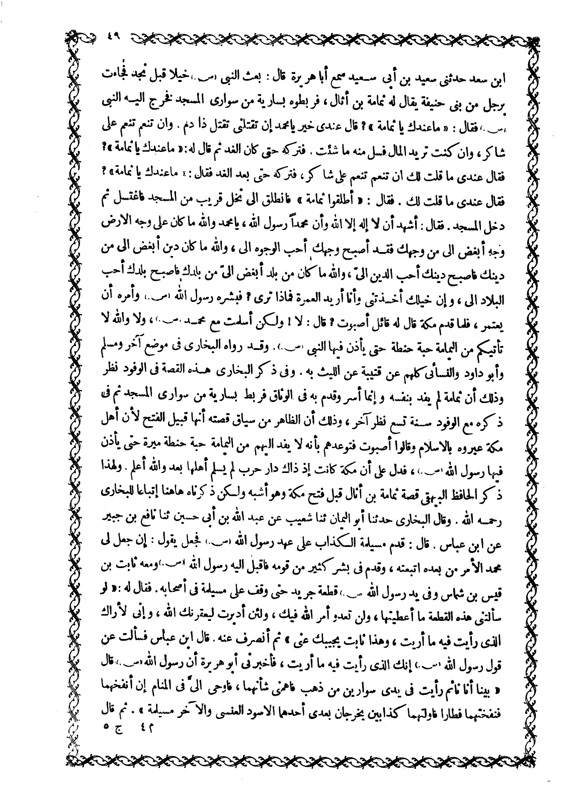 ابن سعد حدثني سعيد بن أبى سعيد سَمِعَ أَبَا هُرَيْرَةَ قَالَ: بُعِثَ النَّبِيُّ صَلَّى اللَّهُ عَلَيْهِ وَسَلَّمَ خَيْلًا قَبْلَ نَجْدٍ فَجَاءَتْ بِرَجُلٍ مِنْ بَنِي حَنِيفَةَ يُقَالُ لَهُ ثُمَامَةُ بْنُ أُثَالٍ، فَرَبَطُوهُ بِسَارِيَةٍ مِنْ سَوَارِي الْمَسْجِدِ فَخَرَجَ إِلَيْهِ النَّبِيِّ صَلَّى اللَّهُ عَلَيْهِ وَسَلَّمَ فَقَالَ: «مَا عِنْدَكَ يَا ثُمَامَةُ» ؟ قَالَ عِنْدِي خَيْرٌ يَا مُحَمَّدُ إِنْ تَقْتُلْنِي تَقْتُلْ ذَا دَمٍ. وَإِنْ تُنْعِمْ تُنْعِمْ عَلَى شَاكِرٍ، وَإِنْ كُنْتَ تُرِيدُ الْمَالَ فَسَلْ مِنْهُ مَا شِئْتَ. فَتَرَكَهُ حَتَّى كَانَ الْغَدُ ثُمَّ قَالَ لَهُ: «مَا عِنْدَكَ يَا ثُمَامَةُ» ؟