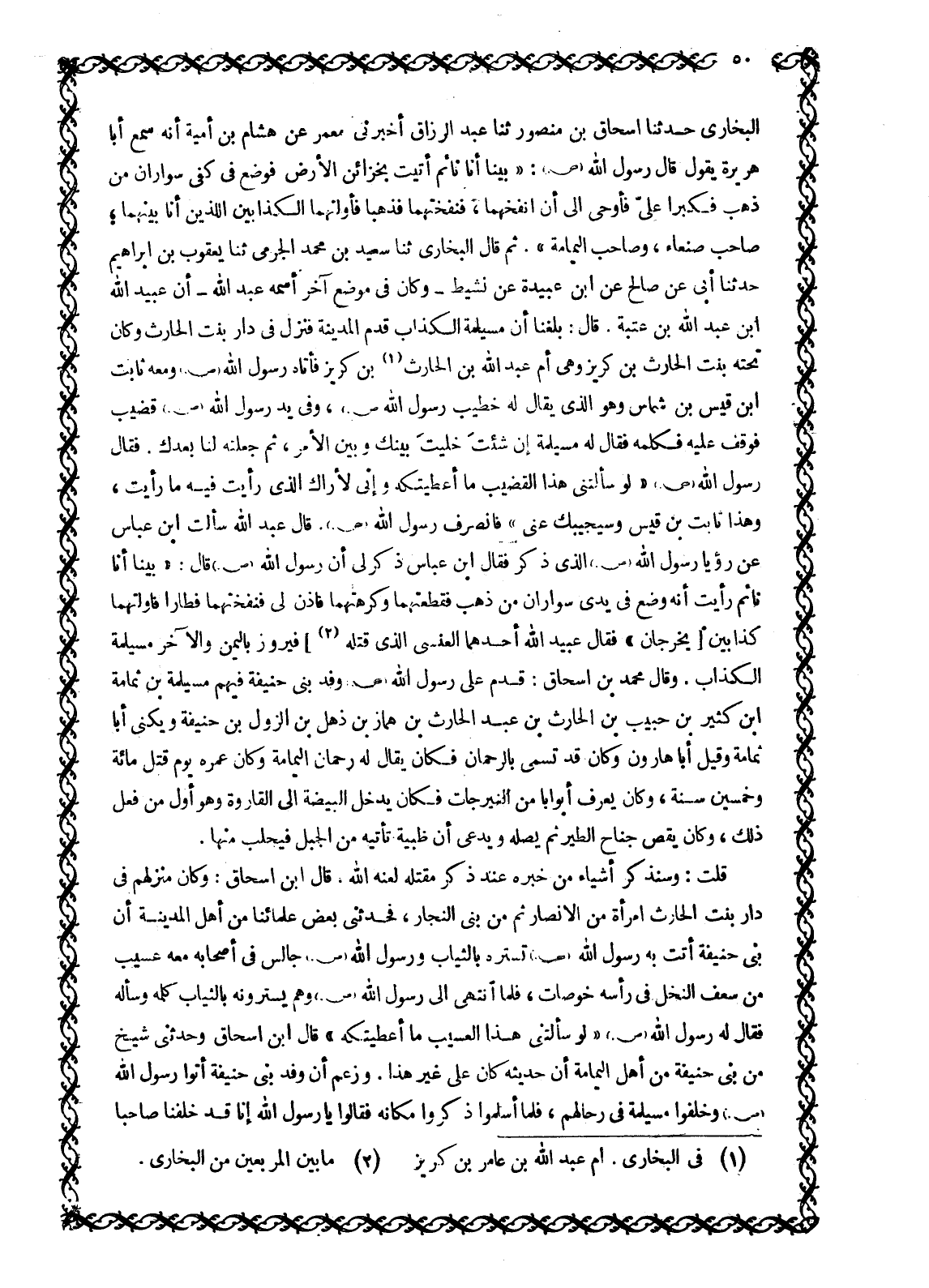 البخاري حدثنا إسحاق بن منصور ثنا عبد الرزاق أخبرنى معمر عن هشام بن أمية أَنَّهُ سَمِعَ أَبَا هُرَيْرَةَ يَقُولُ قَالَ رَسُولُ اللَّهِ صَلَّى اللَّهُ عَلَيْهِ وَسَلَّمَ: «بَيْنَا أَنَا نَائِمٌ أُتِيتُ بِخَزَائِنِ الْأَرْضِ فَوُضِعَ فِي كَفِّي سِوَارَانِ مِنْ ذَهَبٍ فَكَبُرَا عَلَيَّ فَأُوحِيَ إِلَيَّ أَنِ انْفُخْهُمَا، فَنَفَخْتُهُمَا فَذَهَبَا فَأَوَّلْتُهُمَا الْكَذَّابَيْنِ اللَّذَيْنِ أَنَا بَيْنَهُمَا، صَاحِبَ صَنْعَاءَ، وَصَاحِبَ الْيَمَامَةِ» . ثُمَّ قَالَ الْبُخَارِيُّ ثنا سَعِيدُ بْنُ مُحَمَّدٍ الْجَرْمِيُّ ثنا يَعْقُوبُ بْنُ إِبْرَاهِيمَ حَدَّثَنَا أَبِي عَنْ صَالِحٍ عن ابن عبيدة عن نَشِيطٍ- وَكَانَ فِي مَوْضِعٍ آخَرَ اسْمُهُ عَبْدُ الله- أن عبيد الله ابن عَبْدِ اللَّهِ بْنِ عُتْبَةَ. قَالَ: بَلَغَنَا أَنَّ مُسَيْلِمَةَ الْكَذَّابَ قَدِمَ الْمَدِينَةَ فَنَزَلَ فِي دَارِ بِنْتِ الْحَارِثِ وَكَانَ تَحْتَهُ بِنْتُ الْحَارِثِ بْنِ كريز وهي أم عبد الله بن الحارث [1] بْنِ كُرَيْزٍ فَأَتَاهُ رَسُولُ اللَّهِ صَلَّى اللَّهُ عَلَيْهِ وَسَلَّمَ وَمَعَهُ ثابت ابن قَيْسِ بْنِ شَمَّاسٍ وَهُوَ الَّذِي يُقَالُ لَهُ خَطِيبُ رَسُولِ اللَّهِ صَلَّى اللَّهُ عَلَيْهِ وَسَلَّمَ، وَفِي يَدِ رَسُولِ اللَّهِ صَلَّى اللَّهُ عَلَيْهِ وَسَلَّمَ قَضِيبٌ فَوَقَفَ عَلَيْهِ فَكَلَّمَهُ فَقَالَ لَهُ مُسَيْلِمَةُ إِنْ شِئْتَ خَلَّيْتُ بَيْنَكَ وَبَيْنَ الْأَمْرِ، ثُمَّ جَعَلْتَهُ لَنَا بَعْدِكَ. فَقَالَ رَسُولُ اللَّهِ صَلَّى اللَّهُ عَلَيْهِ وَسَلَّمَ «لَوْ سَأَلْتَنِي هَذَا القضيب ما أعطيتكه وإني لأراك الّذي رأيت فيه ما رأيت، وَهَذَا ثَابِتُ بْنُ قَيْسٍ وَسَيُجِيبُكَ عَنِّي» فَانْصَرَفَ رَسُولُ اللَّهِ صَلَّى اللَّهُ عَلَيْهِ وَسَلَّمَ. قَالَ عبد اللَّهِ سَأَلْتُ ابْنَ عَبَّاسٍ عَنْ رُؤْيَا رَسُولِ اللَّهِ صَلَّى اللَّهُ عَلَيْهِ وَسَلَّمَ الَّذِي ذَكَرَ فَقَالَ ابْنُ عَبَّاسٍ ذُكِرَ لِي أَنَّ رَسُولَ اللَّهِ صَلَّى اللَّهُ عَلَيْهِ وَسَلَّمَ قال: «بَيْنَا أَنَا نَائِمٌ رَأَيْتُ أَنَّهُ وُضِعَ فِي يدي سواران من ذهب فقطعتهما وكرهتهما فاذن لي فنفختهما فطارا فأولتهما كذا بين [يَخْرُجَانِ» فَقَالَ عُبَيْدُ اللَّهِ أَحَدُهُمَا الْعَنْسِيُّ الَّذِي قَتَلَهُ [2]] فَيْرُوزُ بِالْيَمَنِ وَالْآخَرُ مُسَيْلِمَةُ الْكَذَّابُ. وَقَالَ مُحَمَّدُ بْنُ إِسْحَاقَ: قَدِمَ عَلَى رَسُولِ اللَّهِ صَلَّى اللَّهُ عَلَيْهِ وَسَلَّمَ وَفْدُ بَنِي حَنِيفَةَ فيهم مسيلمة بن ثمامة ابن كثير بْنِ حَبِيبِ بْنِ الْحَارِثِ بْنِ عَبْدِ الْحَارِثِ بن هماز بن ذهل بن الزول بْنِ حَنِيفَةَ وَيُكَنَّى أَبَا ثُمَامَةَ وَقِيلَ أَبَا هَارُونَ وَكَانَ قَدْ تَسَمَّى بِالرَّحْمَنِ فَكَانَ يُقَالُ له رحمان الْيَمَامَةِ وَكَانَ عُمُرُهُ يَوْمَ قُتِلَ مِائَةً وَخَمْسِينَ سَنَةً، وَكَانَ يَعْرِفُ أَبْوَابًا مِنْ النِّيرَجَاتِ فَكَانَ يُدْخِلُ الْبَيْضَةَ إِلَى الْقَارُورَةِ وَهُوَ أَوَّلُ مَنْ فَعَلَ ذَلِكَ، وَكَانَ يَقُصُّ جَنَاحَ الطَّيْرِ ثُمَّ يَصِلُهُ وَيَدَّعِي أَنَّ ظَبْيَةً تَأْتِيهِ مِنَ الْجَبَلِ فيحلب منها.
