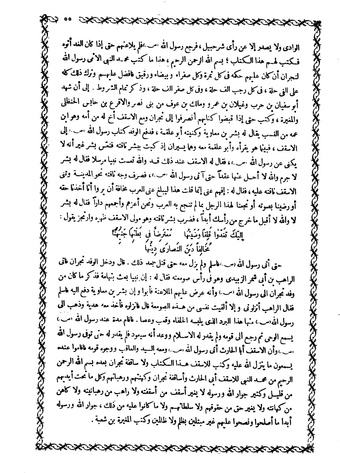الْوَادِيَ وَلَا يَصْدُرُ إِلَّا عَنْ رَأْيِ شُرَحْبِيلَ، فَرَجَعَ رَسُولُ اللَّهِ صَلَّى اللَّهُ عَلَيْهِ وَسَلَّمَ فَلَمْ يُلَاعِنْهُمْ حَتَّى إِذَا كَانَ الْغَدُ أَتَوْهُ فَكَتَبَ لَهُمْ هَذَا الْكِتَابَ، بِسْمِ اللَّهِ الرَّحْمَنِ الرحيم، هذا ما كتب محمد النبي الأمي رسول الله لِنَجْرَانَ أَنْ كَانَ عَلَيْهِمْ حُكْمُهُ فِي كُلِّ ثَمَرَةٍ وَكُلِّ صَفْرَاءَ وَبَيْضَاءَ وَرَقِيقٍ فَأَفْضَلَ عَلَيْهِمْ وَتَرَكَ ذَلِكَ كُلَّهُ عَلَى أَلْفَيْ حُلَّةٍ، فِي كُلِّ رَجَبٍ أَلْفُ حُلَّةٍ، وَفِي كُلِّ صَفَرٍ أَلْفُ حُلَّةٍ، وَذَكَرَ تَمَامَ الشُّرُوطِ. إِلَى أَنْ شَهِدَ أَبُو سُفْيَانَ بْنُ حَرْبٍ وَغَيْلَانُ بْنُ عَمْرٍو وَمَالِكُ بْنُ عَوْفٍ مِنْ بَنِي نَصْرٍ والأقرع بن حابس الحنظليّ والمغيرة، وَكَتَبَ حَتَّى إِذَا قَبَضُوا كِتَابَهُمُ انْصَرَفُوا إِلَى نَجْرَانَ وَمَعَ الْأُسْقُفِّ أَخٌ لَهُ مِنْ أُمِّهِ وَهُوَ ابْنُ عَمِّهِ مِنَ النَّسَبِ يُقَالُ لَهُ بِشْرُ بْنُ مُعَاوِيَةَ وَكُنْيَتُهُ أَبُو عَلْقَمَةَ، فَدَفَعَ الْوَفْدُ كِتَابَ رَسُولِ اللَّهِ صَلَّى اللَّهُ عَلَيْهِ وَسَلَّمَ إِلَى الْأُسْقُفِّ، فَبَيْنَمَا هُوَ يَقْرَأُهُ وَأَبُو عَلْقَمَةَ مَعَهُ وَهُمَا يَسِيرَانِ إِذْ كَبَتْ بِبِشْرٍ نَاقَتُهُ فَتَعِسَ بِشْرٌ غَيْرَ أَنَّهُ لَا يُكَنِّي عَنْ رَسُولِ اللَّهِ صَلَّى اللَّهُ عَلَيْهِ وَسَلَّمَ، فَقَالَ لَهُ الْأُسْقُفُّ عِنْدَ ذَلِكَ قَدْ وَاللَّهِ تَعَّسْتَ نَبِيًّا مُرْسَلًا فَقَالَ لَهُ بِشْرٌ لَا جَرَمَ وَاللَّهِ لَا أَحُلُّ عَنْهَا عَقْدًا حَتَّى أَتَى رَسُولَ اللَّهِ صَلَّى اللَّهُ عَلَيْهِ وَسَلَّمَ، فصرف وَجْهَ نَاقَتِهِ نَحْوَ الْمَدِينَةِ وَثَنَى الْأُسْقُفُّ نَاقَتَهُ عليه، فقال له: افهم عنى إِنَّمَا قُلْتُ هَذَا لِيَبْلُغَ عَنِّي الْعَرَبَ مَخَافَةَ أَنْ يَرَوْا أَنَّا أَخَذْنَا حَقَّهُ أَوْ رَضِينَا بصوته أو نجعنا لهذا الرجل بما لم تنجع بِهِ الْعَرَبُ وَنَحْنُ أَعَزُّهُمْ وَأَجْمَعُهُمْ دَارًا فَقَالَ لَهُ بِشْرٌ لَا وَاللَّهِ لَا أَقْبَلُ مَا خَرَجَ مِنْ رَأْسِكَ أَبَدًا، فَضَرَبَ بِشْرٌ نَاقَتَهُ وهو مولى الْأُسْقُفَّ ظَهرَهُ وَارْتَجَزَ يَقُولُ: