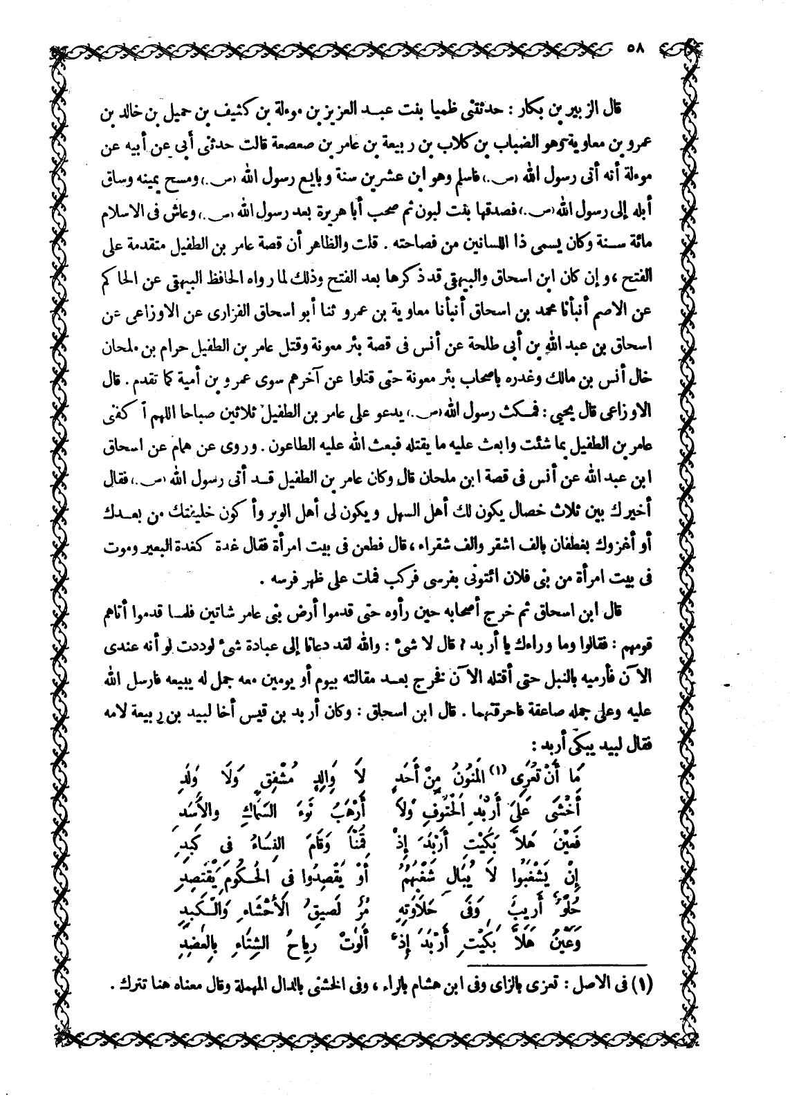 قَالَ الزُّبَيْرُ بْنُ بَكَّارٍ: حَدَّثَتْنِي ظَمْيَاءُ بِنْتُ عبد العزيز بن موءلة بن كثيف بن حميل بْنِ خَالِدِ بْنِ عَمْرِو بْنِ مُعَاوِيَةَ وَهُوَ الضِّبَابُ بْنِ كِلَابِ بْنِ رَبِيعَةَ بْنِ عَامِرِ بْنِ صَعْصَعَةَ قَالَتْ حَدَّثَنِي أَبِي عَنْ أَبِيهِ عن موءلة أَنَّهُ أَتَى رَسُولَ اللَّهِ صَلَّى اللَّهُ عَلَيْهِ وَسَلَّمَ فَأَسْلَمَ وَهُوَ ابْنُ عِشْرِينَ سَنَةً وَبَايَعَ رَسُولَ اللَّهِ صَلَّى اللَّهُ عَلَيْهِ وَسَلَّمَ وَمَسَحَ يَمِينَهُ وَسَاقَ إِبِلَهُ إِلَى رَسُولِ اللَّهِ صَلَّى اللَّهُ عَلَيْهِ وَسَلَّمَ فَصَدَّقَهَا بِنْتَ لَبُونٍ ثُمَّ صَحِبَ أَبَا هُرَيْرَةَ بَعْدَ رَسُولِ اللَّهِ صَلَّى اللَّهُ عَلَيْهِ وَسَلَّمَ وَعَاشَ فِي الْإِسْلَامِ مِائَةَ سَنَةٍ وَكَانَ يُسَمَّى ذَا اللِّسَانَيْنِ مِنْ فَصَاحَتِهِ. قُلْتُ وَالظَّاهِرُ أَنَّ قِصَّةَ عَامِرِ بْنِ الطُّفَيْلِ مُتَقَدِّمَةٌ عَلَى الْفَتْحِ، وَإِنْ كَانَ ابْنُ إِسْحَاقَ والبيهقي قد ذكرها بَعْدَ الْفَتْحِ وَذَلِكَ لِمَا رَوَاهُ الْحَافِظُ الْبَيْهَقِيُّ عَنِ الْحَاكِمِ عَنِ الْأَصَمِّ أَنْبَأَنَا مُحَمَّدُ بْنُ إِسْحَاقَ أَنْبَأَنَا مُعَاوِيَةُ بْنُ عَمْرٍو ثنا أَبُو إِسْحَاقَ الْفَزَارِيَّ عَنِ الْأَوْزَاعِيِّ عَنْ إِسْحَاقَ بْنِ عَبْدِ اللَّهِ بْنِ أَبِي طلحة عن أنس فِي قِصَّةِ بِئْرِ مَعُونَةَ وَقَتْلِ عَامِرِ بْنِ الطُّفَيْلِ حَرَامَ بْنَ مِلْحَانَ خَالَ أَنَسِ بْنِ مَالِكٍ وَغَدْرِهِ بِأَصْحَابِ بِئْرِ مَعُونَةَ حَتَّى قُتِلُوا عَنْ آخِرِهِمْ سِوَى عَمْرِو بْنِ أُمَيَّةَ كَمَا تَقَدَّمَ. قَالَ الْأَوْزَاعِيُّ قَالَ يَحْيَى: فَمَكَثَ رَسُولُ اللَّهِ صَلَّى اللَّهُ عَلَيْهِ وَسَلَّمَ يَدْعُو عَلَى عَامِرِ بْنِ الطُّفَيْلِ ثَلَاثِينَ صَبَاحًا اللَّهمّ اكْفِنِي عَامِرَ بْنَ الطُّفَيْلِ بِمَا شِئْتَ وَابْعَثْ عَلَيْهِ مَا يَقْتُلُهُ فَبَعَثَ اللَّهُ عَلَيْهِ الطَّاعُونَ. وَرَوَى عن همام عن إسحاق ابن عبد الله عن أنس في قصة ابن مِلْحَانَ قَالَ وَكَانَ عَامِرُ بْنُ الطُّفَيْلِ قَدْ أَتَى رَسُولَ اللَّهِ صَلَّى اللَّهُ عَلَيْهِ وَسَلَّمَ فَقَالَ أُخَيِّرُكَ بَيْنَ ثَلَاثِ خِصَالٍ يَكُونُ لَكَ أَهْلُ السَّهْلِ وَيَكُونُ لِي أَهْلُ الْوَبَرِ وَأَكُونُ خَلِيفَتَكَ مِنْ بَعْدِكَ أَوْ أَغْزُوكَ بِغَطَفَانَ بِأَلْفِ أَشْقَرَ وَأَلْفِ شَقْرَاءَ، قَالَ فَطُعِنَ فِي بَيْتِ امرأة فقال غدة كغدة البعير وَمَوْتٌ فِي بَيْتِ امْرَأَةٍ مِنْ بَنِي فُلَانٍ ائْتُونِي بِفَرَسِي فَرَكِبَ فَمَاتَ عَلَى ظَهْرِ فَرَسِهِ.