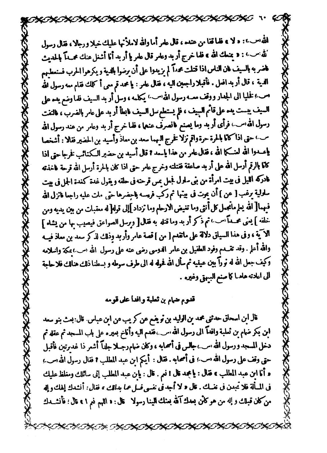 قَالَ ابْنُ إِسْحَاقَ حَدَّثَنِي مُحَمَّدُ بْنُ الْوَلِيدِ بْنِ نُوَيْفِعٍ عَنْ كُرَيْبٍ عَنِ ابْنِ عَبَّاسٍ. قال: بعث بنو سعد ابن بَكْرٍ ضِمَامَ بْنَ ثَعْلَبَةَ وَافِدًا إِلَى رَسُولِ اللَّهِ صَلَّى اللَّهُ عَلَيْهِ وَسَلَّمَ فَقَدِمَ إِلَيْهِ وأناخ بعيره على باب المسجد ثم عقله ثُمَّ دَخَلَ الْمَسْجِدَ وَرَسُولُ اللَّهِ صَلَّى اللَّهُ عَلَيْهِ وَسَلَّمَ جَالِسٌ فِي أَصْحَابِهِ. وَكَانَ ضِمَامٌ رَجُلًا جَلْدًا أَشْعَرَ ذَا غَدِيرَتَيْنِ فَأَقْبَلَ حَتَّى وَقَفَ عَلَى رَسُولِ اللَّهِ صَلَّى اللَّهُ عَلَيْهِ وَسَلَّمَ فِي أَصْحَابِهِ. فَقَالَ: أَيُّكُمُ ابْنَ عَبْدِ الْمُطَّلِبِ؟ فَقَالَ رَسُولُ اللَّهِ صَلَّى اللَّهُ عَلَيْهِ وَسَلَّمَ «أَنَا ابْنُ عَبْدِ الْمُطَّلِبِ» فَقَالَ: يَا محمد قال! نعم. قال: يا بن عَبْدِ الْمُطَّلِبِ إِنِّي سَائِلُكَ وَمُغَلِّظٌ عَلَيْكَ فِي الْمَسْأَلَةِ فَلَا تَجِدَنَّ فِي نَفْسِكَ. قَالَ «لَا أَجِدُ فِي نَفْسِي فَسَلْ عَمَّا بَدَا لَكَ» فقال: أنشدك إِلَهَكَ وَإِلَهَ مَنْ كَانَ قَبْلَكَ وَإِلَهَ مَنْ هُوَ كَائِنٌ بَعْدَكَ آللَّه بَعَثَكَ إِلَيْنَا رَسُولًا. قَالَ: «اللَّهمّ نَعَمْ!» قَالَ: فَأَنْشُدُكَ