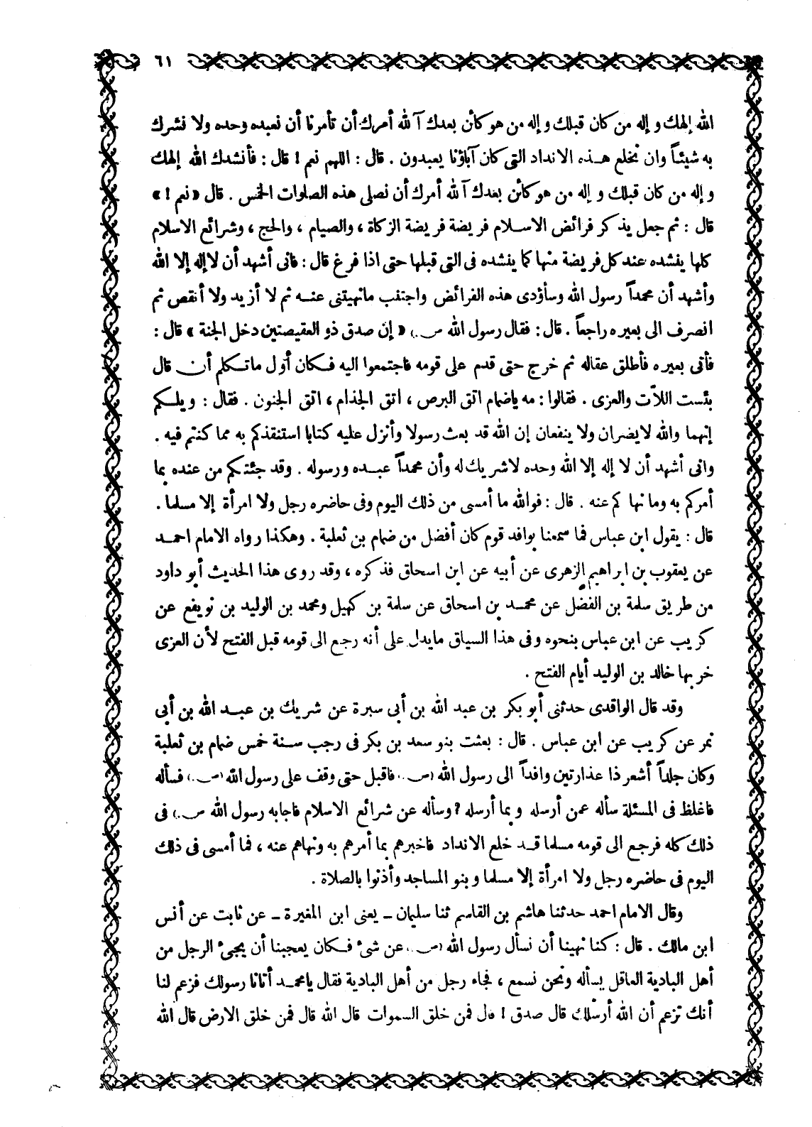 اللَّهَ إِلَهَكَ وَإِلَهَ مَنْ كَانَ قَبْلَكَ وَإِلَهَ من هو كائن بعدك آللَّه أمرك أن تَأْمُرَنَا أَنْ نَعْبُدَهُ وَحْدَهُ وَلَا نُشْرِكَ بِهِ شَيْئًا وَأَنْ نَخْلَعَ هَذِهِ الْأَنْدَادَ الَّتِي كَانَ آبَاؤُنَا يَعْبُدُونَ. قَالَ: اللَّهمّ نَعَمْ! قَالَ: فَأَنْشُدُكَ اللَّهَ إِلَهَكَ وَإِلَهَ مَنْ كَانَ قَبْلَكَ وَإِلَهَ من هو كائن بعدك آللَّه أمرك أن نصلي هذه الصلوات الخمس. قال «نَعَمْ!» قَالَ: ثُمَّ جَعَلَ يَذْكُرُ فَرَائِضَ الْإِسْلَامِ فَرِيضَةً فَرِيضَةً الزَّكَاةَ، وَالصِّيَامَ، وَالْحَجَّ، وَشَرَائِعَ الْإِسْلَامِ كُلَّهَا يَنْشُدُهُ عِنْدَ كُلِّ فَرِيضَةٍ مِنْهَا كَمَا يَنْشُدُهُ فِي الَّتِي قَبْلَهَا حَتَّى إِذَا فَرَغَ قَالَ: فَإِنِّي أَشْهَدُ أَنْ لَا إِلَهَ إِلَّا اللَّهُ وَأَشْهَدُ أَنَّ مُحَمَّدًا رَسُولُ اللَّهِ وَسَأُؤَدِّي هَذِهِ الْفَرَائِضَ وَأَجْتَنِبُ مَا نَهَيْتَنِي عَنْهُ ثُمَّ لَا أَزِيدُ وَلَا أَنْقُصُ ثُمَّ انْصَرَفَ إِلَى بَعِيرِهِ رَاجِعًا. قَالَ: فَقَالَ رَسُولُ اللَّهِ صَلَّى اللَّهُ عَلَيْهِ وَسَلَّمَ «إِنْ صَدَقَ ذُو الْعَقِيصَتَيْنِ دَخَلَ الْجَنَّةَ» قَالَ: