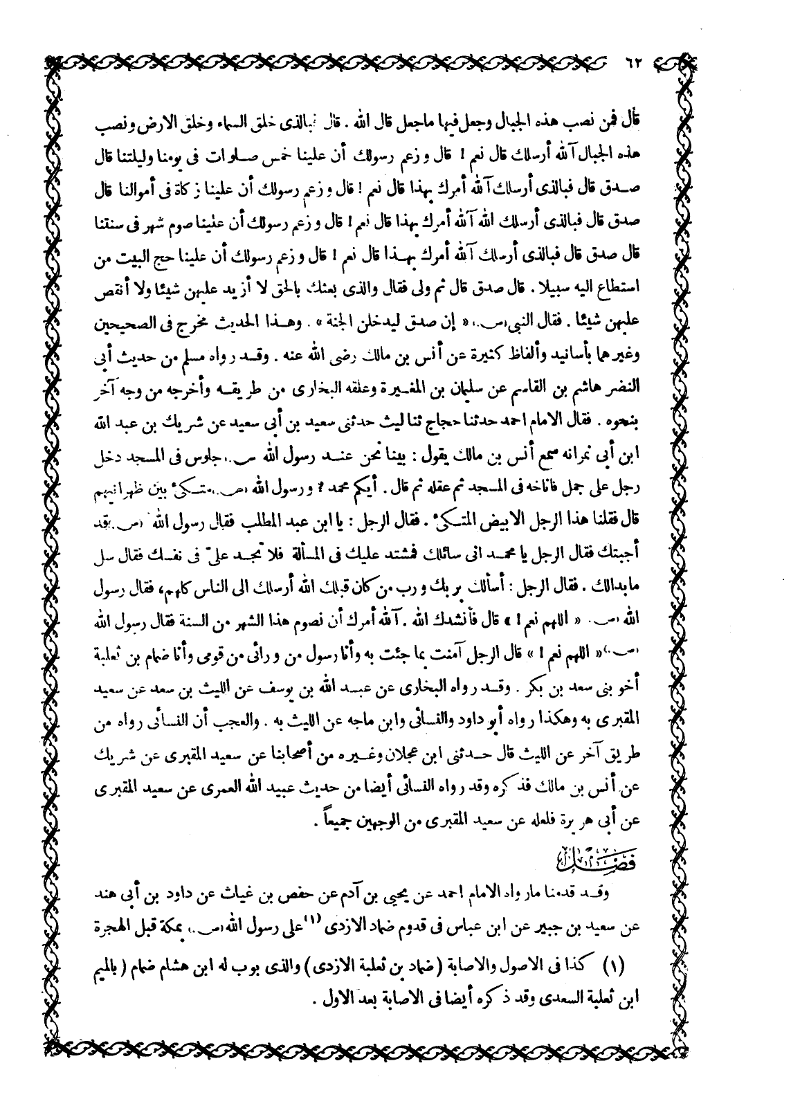 قَالَ فَمَنْ نَصَبَ هَذِهِ الْجِبَالَ وَجَعَلَ فِيهَا مَا جَعَلَ قَالَ اللَّهُ. قَالَ فَبِالَّذِي خَلَقَ السَّمَاءَ وَخَلَقَ الْأَرْضَ وَنَصَبَ هَذِهِ الْجِبَالَ آللَّه أَرْسَلَكَ قَالَ نَعَمْ! قَالَ وَزَعَمَ رَسُولُكَ أَنَّ عَلَيْنَا خَمْسَ صَلَوَاتٍ فِي يَوْمِنَا وَلَيْلَتِنَا قَالَ صَدَقَ قَالَ فَبِالَّذِي أَرْسَلَكَ آللَّه أَمَرَكَ بِهَذَا قَالَ نَعَمْ! قَالَ وَزَعَمَ رَسُولُكَ أَنَّ عَلَيْنَا زَكَاةً فِي أَمْوَالِنَا قَالَ صَدَقَ قَالَ فَبِالَّذِي أرسلك الله آللَّه أَمَرَكَ بِهَذَا قَالَ نَعَمْ! قَالَ وَزَعَمَ رسولك أن علينا صوم شهر فِي سَنَتِنَا قَالَ صَدَقَ قَالَ فَبِالَّذِي أَرْسَلَكَ آللَّه أَمَرَكَ بِهَذَا قَالَ نَعَمْ! قَالَ وَزَعَمَ رَسُولُكَ أَنَّ عَلَيْنَا حَجَّ الْبَيْتِ مَنِ اسْتَطَاعَ إِلَيْهِ سَبِيلًا. قَالَ صَدَقَ قَالَ ثُمَّ وَلَّى فقال والّذي بعثك بالحق لا أزيد عليهنّ شيئا ولا أنقص عليهنّ شَيْئًا. فَقَالَ النَّبِيُّ صَلَّى اللَّهُ عَلَيْهِ وَسَلَّمَ «إِنَّ صَدَقَ لَيَدْخُلَنَّ الْجَنَّةَ» . وَهَذَا الْحَدِيثُ مُخَرَّجٌ فِي الصَّحِيحَيْنِ وَغَيْرِهِمَا بِأَسَانِيدَ وَأَلْفَاظٍ كَثِيرَةٍ عَنْ أَنَسِ بْنِ مَالِكٍ رَضِيَ اللَّهُ عَنْهُ. وَقَدْ رَوَاهُ مُسْلِمٌ مِنْ حَدِيثِ أَبِي النَّضْرِ هَاشِمِ بْنِ الْقَاسِمِ عَنْ سُلَيْمَانَ بْنِ الْمُغِيرَةِ وَعَلَّقَهُ الْبُخَارِيُّ مِنْ طَرِيقِهِ وَأَخْرَجَهُ مِنْ وَجْهٍ آخَرَ بِنَحْوِهِ. فَقَالَ الْإِمَامُ أَحْمَدُ حَدَّثَنَا حَجَّاجٌ ثَنَا لَيْثٌ حَدَّثَنِي سَعِيدُ بْنُ أَبِي سَعِيدٍ عَنْ شَرِيكِ بن عبد الله ابن أبى نمرانه سَمِعَ أَنَسَ بْنَ مَالِكٍ يَقُولُ: بَيْنَا نَحْنُ عِنْدَ رَسُولِ اللَّهِ صَلَّى اللَّهُ عَلَيْهِ وَسَلَّمَ جلوس فِي الْمَسْجِدِ دَخَلَ رَجُلٌ عَلَى جَمَلٍ فَأَنَاخَهُ فِي الْمَسْجِدِ ثُمَّ عَقَلَهُ ثُمَّ قَالَ. أَيُّكُمْ محمد؟ ورسول الله صلّى الله عليه وسلّم مُتَّكِئٌ بَيْنَ ظَهْرَانِيهِمْ قَالَ فَقُلْنَا هَذَا الرَّجُلُ الْأَبْيَضُ الْمُتَّكِئُ. فَقَالَ الرَّجُلُ: يَا ابْنَ عَبْدِ الْمُطَّلِبِ فَقَالَ رَسُولُ اللَّهِ صَلَّى اللَّهُ عَلَيْهِ وَسَلَّمَ قَدْ أَجَبْتُكَ فَقَالَ الرَّجُلُ يَا مُحَمَّدُ إِنِّي سَائِلُكَ فَمُشْتَدٌّ عَلَيْكَ فِي الْمَسْأَلَةِ فَلَا تَجِدْ عَلَيَّ فِي نَفْسِكَ فَقَالَ سَلْ مَا بدا لك. فقال الرجل: أسألك بِرَبِّكَ وَرَبٍّ مَنْ كَانَ قَبْلَكَ آللَّهُ أَرْسَلَكَ إِلَى النَّاسِ كُلِّهِمْ، فَقَالَ رَسُولُ اللَّهِ صَلَّى اللَّهُ عَلَيْهِ وَسَلَّمَ «اللَّهمّ نَعَمْ!» قَالَ فَأَنْشُدُكَ الله. آللَّه أمرك أن نصوم هَذَا الشَّهْرَ مِنَ السَّنَةِ فَقَالَ رَسُولُ اللَّهِ صَلَّى اللَّهُ عَلَيْهِ وَسَلَّمَ «اللَّهمّ نَعَمْ!» قَالَ الرَّجُلُ آمَنْتُ بِمَا جِئْتَ بِهِ وَأَنَا رَسُولٌ مَنْ وَرَائِي مِنْ قَوْمِي وَأَنَا ضِمَامُ بْنُ ثَعْلَبَةَ أَخُو بَنِي سَعْدِ بْنِ بَكْرٍ. وَقَدْ رَوَاهُ الْبُخَارِيُّ عَنْ عَبْدِ اللَّهِ بْنِ يُوسُفَ عَنِ اللَّيْثِ بْنِ سَعْدٍ عَنْ سَعِيدٍ الْمَقْبُرِيِّ بِهِ وَهَكَذَا رَوَاهُ أَبُو دَاوُدَ وَالنَّسَائِيُّ وَابْنُ مَاجَهْ عَنِ اللَّيْثِ بِهِ. وَالْعَجَبُ أَنَّ النَّسَائِيَّ رَوَاهُ مِنْ طَرِيقٍ آخَرَ عَنِ اللَّيْثِ قَالَ حَدَّثَنِي ابْنُ عَجْلَانَ وَغَيْرُهُ مِنْ أَصْحَابِنَا عَنْ سَعِيدٍ الْمَقْبُرِيِّ عَنْ شَرِيكٍ عَنْ أَنَسِ بْنِ مَالِكٍ فَذَكَرَهُ وَقَدْ رَوَاهُ النَّسَائِيُّ أَيْضًا مِنْ حَدِيثِ عُبَيْدِ اللَّهِ الْعُمَرِيِّ عَنْ سَعِيدٍ الْمَقْبُرِيِّ عَنْ أَبِي هُرَيْرَةَ فَلَعَلَّهُ عَنْ سَعِيدٍ الْمَقْبُرِيِّ من الوجهين جميعا.