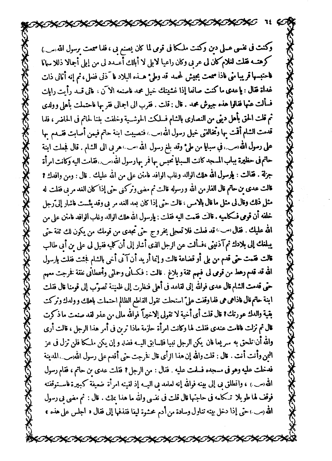 وَكُنْتُ فِي نَفْسِي عَلَى دِينٍ وَكُنْتُ مَلِكًا فِي قَوْمِي لِمَا كَانَ يُصْنَعُ بِي، فَلَمَّا سَمِعْتُ بِرَسُولِ اللَّهِ صَلَّى اللَّهُ عَلَيْهِ وَسَلَّمَ كَرِهْتُهُ فَقُلْتُ لِغُلَامٍ كَانَ لِي عَرَبِيٍّ وَكَانَ رَاعِيًا لِإِبِلِي لَا أَبًا لَكَ أُعْدُدْ لِي مِنْ إِبِلِي أَجْمَالًا ذُلُلًا سِمَانًا فَاحْتَبِسْهَا قَرِيبًا مِنِّي فَإِذَا سَمِعْتَ بِجَيْشٍ لِمُحَمَّدٍ قَدْ وَطِئَ هَذِهِ الْبِلَادَ فَآذِنِّي فَفَعَلَ، ثُمَّ أَنَّهُ أَتَانِي ذَاتَ غَدَاةٍ فَقَالَ: يَا عَدِيُّ مَا كُنْتَ صَانِعًا إِذَا غَشِيَتْكَ خَيْلُ مُحَمَّدٍ فَاصْنَعْهُ الْآنَ، فَإِنِّي قَدْ رَأَيْتُ رَايَاتٍ فَسَأَلْتُ عَنْهَا فَقَالُوا هَذِهِ جُيُوشُ مُحَمَّدٍ. قَالَ: قُلْتُ. فَقَرِّبْ إِلَى أَجْمَالِي فَقَرَّبَهَا فَاحْتَمَلْتُ بِأَهْلِي وَوَلَدِي ثُمَّ قُلْتُ أَلْحَقُ بِأَهْلِ دِينِي مِنَ النَّصَارَى بِالشَّامِ فَسَلَكْتُ الحوشية وَخَلَّفْتُ بِنْتًا لِحَاتِمٍ فِي الْحَاضِرِ، فَلَمَّا قَدِمْتُ الشَّامَ أَقَمْتُ بِهَا وَتُخَالِفُنِي خَيْلُ رَسُولِ اللَّهِ صَلَّى اللَّهُ عَلَيْهِ وَسَلَّمَ فَتُصِيبُ ابْنَةَ حَاتِمٍ فِيمَنْ أَصَابَتْ فَقَدِمَ بِهَا عَلَى رَسُولِ اللَّهِ صَلَّى اللَّهُ عَلَيْهِ وَسَلَّمَ فِي سَبَايَا مِنْ طيِّئ وَقَدْ بَلَغَ رَسُولُ اللَّهِ صَلَّى اللَّهُ عَلَيْهِ وَسَلَّمَ هَرَبِي إِلَى الشَّامِ، قَالَ فَجُعِلَتِ ابْنَةُ حَاتِمٍ فِي حَظِيرَةٍ بِبَابِ الْمَسْجِدِ كَانَتِ السَّبَايَا تُحْبَسُ بِهَا فَمَرَّ بِهَا رَسُولُ اللَّهِ صَلَّى اللَّهُ عَلَيْهِ وَسَلَّمَ فَقَامَتْ إِلَيْهِ وَكَانَتِ امْرَأَةً جَزْلَةً. فَقَالَتْ: يَا رَسُولَ اللَّهِ هَلَكَ الْوَالِدُ وَغَابَ الْوَافِدُ فَامْنُنْ عَلَيَّ مَنَّ اللَّهُ عَلَيْكَ. قَالَ: وَمَنْ وَافِدُكِ؟
