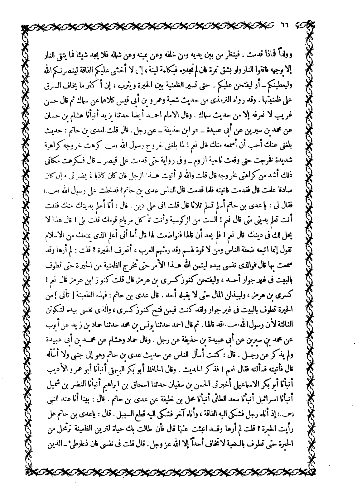 وَوَلَدًا فَمَاذَا قَدَّمْتَ: فَيَنْظُرُ مِنْ بَيْنِ يَدَيْهِ وَمِنْ خَلْفِهِ وَعَنْ يَمِينِهِ وَعَنْ شِمَالِهِ فَلَا يَجِدُ شَيْئًا فَمَا يَتَّقِي النَّارَ إِلَّا بِوَجْهِهِ فَاتَّقُوا النَّارَ وَلَوْ بِشِقِّ تَمْرَةٍ فَإِنْ لَمْ تَجِدُوهُ فَبِكَلِمَةٍ لَيِّنَةٍ، إِنِّي لَا أَخْشَى عَلَيْكُمُ الْفَاقَةَ لَيَنْصُرَنَّكُمُ اللَّهُ وَلَيُعْطِيَنَّكُمْ- أَوْ لَيَفْتَحَنَّ عَلَيْكُمْ- حتى تسير الظعنية بين الحيرة ويثرب، إن أكثر ما يخاف السَّرَقَ عَلَى ظَعِينَتِهَا. وَقَدْ رَوَاهُ التِّرْمِذِيُّ مِنْ حَدِيثِ شُعْبَةَ وَعَمْرِو بْنِ أَبِي قَيْسٍ كِلَاهُمَا عَنْ سِمَاكٍ ثُمَّ قَالَ حَسَنٌ غَرِيبٌ لَا نَعْرِفُهُ إِلَّا مِنْ حَدِيثِ سِمَاكٍ. وَقَالَ الْإِمَامُ أَحْمَدُ أَيْضًا حَدَّثَنَا يَزِيدُ أَنْبَأَنَا هِشَامُ بْنُ حَسَّانَ عَنْ مُحَمَّدِ بْنِ سِيرِينَ عَنْ أَبِي عُبَيْدَةَ- هُوَ ابْنُ حُذَيْفَةَ- عَنْ رَجُلٍ. قَالَ قُلْتُ لِعَدِيِّ بْنِ حَاتِمٍ: حَدِيثٌ بَلَغَنِي عَنْكَ أُحِبُّ أَنْ أَسْمَعَهُ مِنْكَ قَالَ نَعَمْ! لَمَّا بَلَغَنِي خُرُوجَ رَسُولِ اللَّهِ صَلَّى اللَّهُ عَلَيْهِ وَسَلَّمَ كَرِهْتُ خُرُوجَهُ كَرَاهِيَةً شَدِيدَةً فَخَرَجْتُ حَتَّى وَقَعْتُ نَاحِيَةَ الرُّومِ- وَفِي رِوَايَةٍ حَتَّى قَدِمْتُ عَلَى قَيْصَرَ- قَالَ فَكَرِهْتُ مَكَانِي ذَلِكَ أَشَدَّ مِنْ كَرَاهَتِي لِخُرُوجِهِ قَالَ قُلْتُ وَاللَّهِ لَوْ أَتَيْتُ هَذَا الرَّجُلَ فَإِنْ كَانَ كَاذِبًا لَمْ يَضُرَّنِي وَإِنْ كَانَ صَادِقًا عَلِمْتُ قَالَ فَقَدِمْتُ فَأَتَيْتُهُ فَلَمَّا قَدِمْتُ قَالَ النَّاسُ عَدِيُّ بْنُ حَاتِمٍ؟ فَدَخَلْتُ عَلَى رَسُولِ اللَّهِ صَلَّى اللَّهُ عَلَيْهِ وَسَلَّمَ فَقَالَ لِي: يَا عَدِيَّ بْنَ حَاتِمٍ أَسْلِمْ تَسْلَمْ ثَلَاثًا قَالَ قُلْتُ إِنِّي عَلَى دِينٍ. قَالَ: أَنَا أَعْلَمُ بِدِينِكَ مِنْكَ فقلت أنت تعلم بِدِينِي مِنِّي قَالَ نَعَمْ! أَلَسْتَ مِنَ الرَّكُوسِيَّةِ وَأَنْتَ تَأْكُلُ مِرْبَاعَ قَوْمِكَ قُلْتُ بَلَى! قَالَ هَذَا لَا يَحِلُّ لَكَ فِي دِينِكَ قَالَ نَعَمْ! فَلَمْ يَعْدُ أَنْ قَالَهَا فَتَوَاضَعْتُ لَهَا قَالَ أَمَا إِنِّي أَعْلَمُ الَّذِي يَمْنَعُكَ مِنَ الْإِسْلَامِ تَقُولُ إِنَّمَا اتَّبَعَهُ ضَعَفَةُ النَّاسِ وَمَنْ لا قوة لهم وَقَدْ رَمَتْهُمُ الْعَرَبُ، أَتَعْرِفُ الْحِيرَةَ؟ قُلْتُ: لَمْ أرها وقد سمعت بها قال فو الّذي نَفْسِي بِيَدِهِ لَيُتِمَّنَّ اللَّهُ هَذَا الْأَمْرَ حَتَّى تخرج الظعنية مِنَ الْحِيرَةِ حَتَّى تَطُوفَ بِالْبَيْتِ فِي غَيْرِ جِوَارِ أَحَدٍ، وَلَيَفْتَحَنَّ كُنُوزَ كِسْرَى بْنِ هُرْمُزَ قال قلت كنوز ابن هُرْمُزَ قَالَ نَعَمْ! كِسْرَى بْنَ هُرْمُزَ، وَلَيُبْذَلَنَّ الْمَالُ حَتَّى لَا يَقْبَلَهُ أَحَدٌ. قَالَ عَدِيُّ بن حاتم: فهذه الظعينة [تأتى] مِنَ الْحِيرَةِ تَطُوفُ بِالْبَيْتِ فِي غَيْرِ جِوَارٍ ولقد كنت فيمن فتح كنوز كسرى، وَالَّذِي نَفْسِي بِيَدِهِ لَتَكُونَنَّ الثَّالِثَةُ لِأَنَّ رَسُولَ اللَّهِ صَلَّى اللَّهُ عَلَيْهِ وَسَلَّمَ قَدْ قَالَهَا. ثُمَّ قَالَ أَحْمَدُ حَدَّثَنَا يُونُسُ بْنُ مُحَمَّدٍ حَدَّثَنَا حَمَّادُ بْنُ زَيْدٍ عَنْ أَيُّوبَ عَنْ مُحَمَّدِ بْنِ سِيرِينَ عَنْ أبي عُبَيْدَةَ بْنِ حُذَيْفَةَ عَنْ رَجُلٍ. وَقَالَ حَمَّادٌ وهشام عن محمد بن أَبِي عُبَيْدَةَ وَلَمْ يَذْكُرْ عَنْ رَجُلٍ. قَالَ: كُنْتُ أَسْأَلُ النَّاسَ عَنْ حَدِيثِ عَدِيِّ بْنِ حَاتِمٍ وَهُوَ إِلَى جَنْبِي وَلَا أَسْأَلُهُ قَالَ فَأَتَيْتُهُ فَسَأَلْتُهُ فَقَالَ نَعَمْ! فَذَكَرَ الْحَدِيثَ. وَقَالَ الْحَافِظُ أَبُو بَكْرٍ الْبَيْهَقِيُّ أَنْبَأَنَا أَبُو عَمْرٍو الْأَدِيبُ أَنْبَأَنَا أَبُو بَكْرٍ الْإِسْمَاعِيلِيُّ أَخْبَرَنِي الْحَسَنُ بْنُ سُ