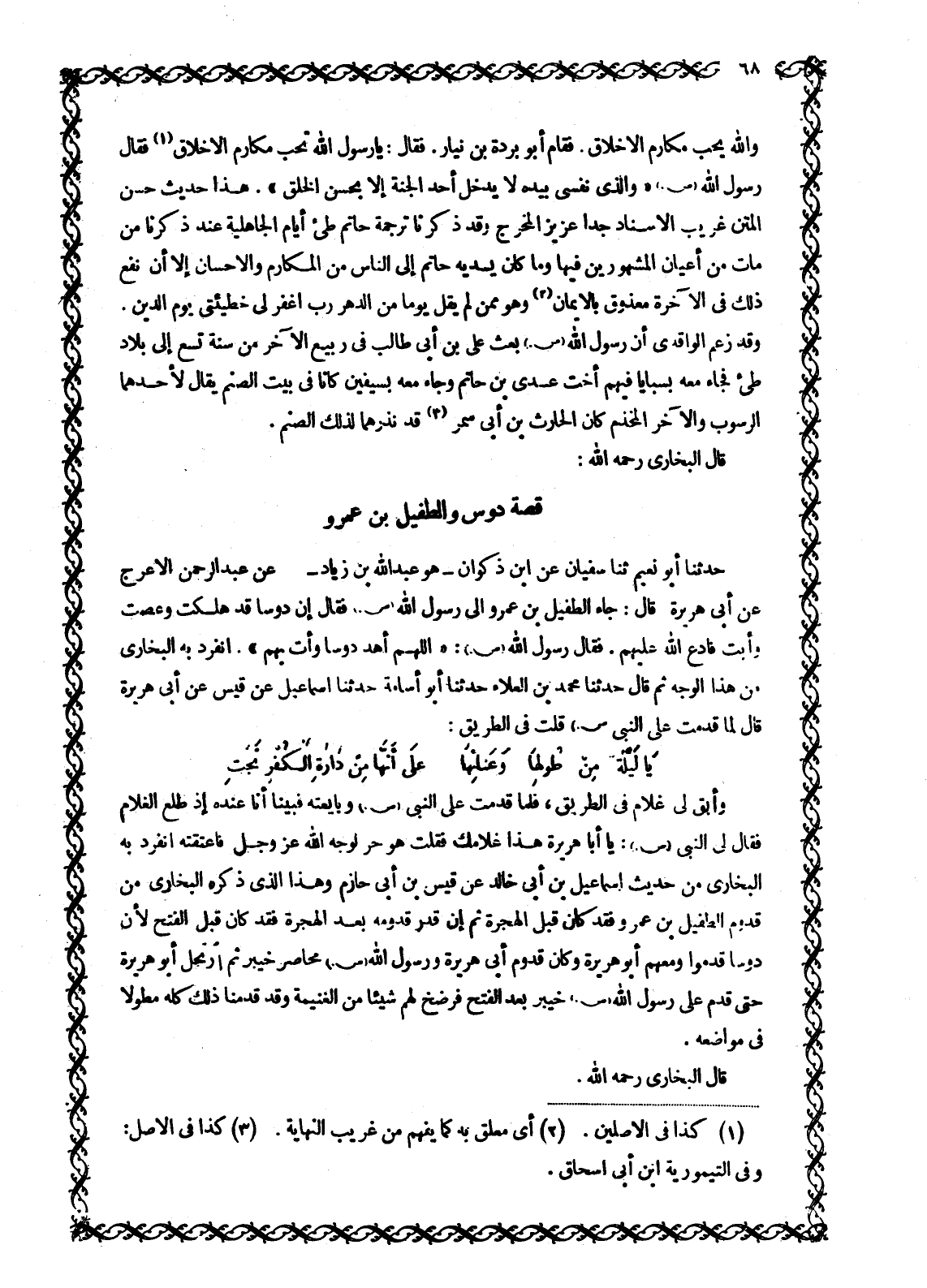 حَدَّثَنَا أَبُو نُعَيْمٍ ثَنَا سُفْيَانُ عَنِ ابْنِ ذَكْوَانَ- هو عبد الله بن زياد-[4] عَنْ عَبْدِ الرَّحْمَنِ الْأَعْرَجِ عَنْ أَبِي هُرَيْرَةَ قَالَ: جَاءَ الطُّفَيْلُ بْنُ عَمْرٍو إِلَى رَسُولِ اللَّهِ صَلَّى اللَّهُ عَلَيْهِ وَسَلَّمَ فَقَالَ إن دوسا قد هلكت وعصت وَأَبَتْ فَادْعُ اللَّهَ عَلَيْهِمْ. فَقَالَ رَسُولُ اللَّهِ صَلَّى اللَّهُ عَلَيْهِ وَسَلَّمَ: «اللَّهمّ اهْدِ دَوْسًا وَأْتِ بِهِمْ» . انْفَرَدَ بِهِ الْبُخَارِيُّ مِنْ هَذَا الْوَجْهِ ثُمَّ قَالَ حَدَّثَنَا مُحَمَّدُ بْنُ الْعَلَاءِ حَدَّثَنَا أَبُو أُسَامَةَ حَدَّثَنَا إِسْمَاعِيلُ عَنْ قَيْسٍ عَنْ أَبِي هُرَيْرَةَ قَالَ لَمَّا قَدِمْتُ عَلَى النَّبِيِّ صَلَّى اللَّهُ عَلَيْهِ وَسَلَّمَ قُلْتُ فِي الطَّرِيقِ: