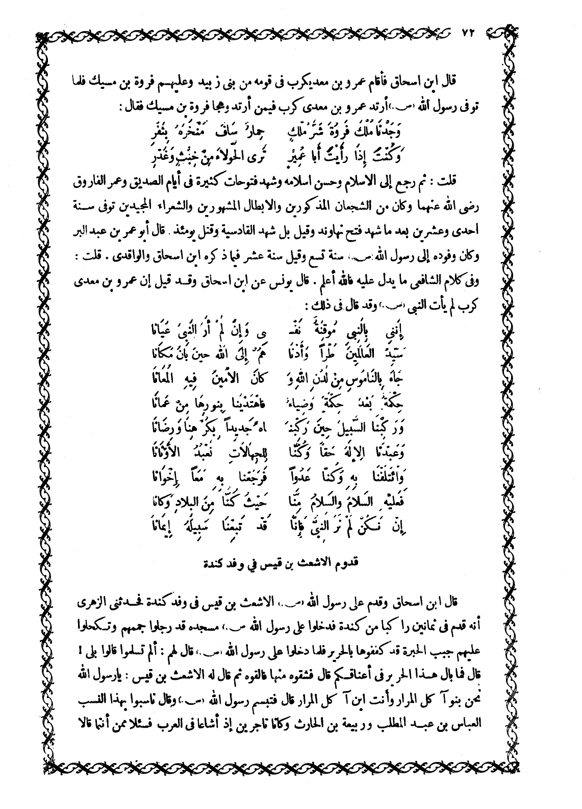 قَالَ ابْنُ إِسْحَاقَ وَقَدِمَ عَلَى رَسُولِ اللَّهِ صَلَّى اللَّهُ عَلَيْهِ وَسَلَّمَ الْأَشْعَثُ بْنُ قَيْسٍ فِي وَفْدِ كِنْدَةَ فَحَدَّثَنِي الزُّهْرِيُّ أَنَّهُ قَدِمَ فِي ثَمَانِينَ رَاكِبًا مِنْ كِنْدَةَ فَدَخَلُوا عَلَى رَسُولِ اللَّهِ صَلَّى اللَّهُ عَلَيْهِ وَسَلَّمَ مَسْجِدَهُ قَدْ رَجَّلُوا جُمَمَهُمْ وَتَكَحَّلُوا عَلَيْهِمْ جُبَبُ الْحِبَرَةِ قَدْ كَفَّفُوهَا بِالْحَرِيرِ فَلَمَّا دَخَلُوا عَلَى رَسُولِ اللَّهِ صَلَّى اللَّهُ عَلَيْهِ وَسَلَّمَ قَالَ لَهُمْ: أَلَمْ تُسْلِمُوا قَالُوا بَلَى! قَالَ فَمَا بَالُ هَذَا الْحَرِيرِ فِي أَعْنَاقِكُمْ قَالَ فَشَقُّوهُ مِنْهَا فَأَلْقَوْهُ ثُمَّ قَالَ لَهُ الْأَشْعَثُ بْنُ قَيْسٍ: يَا رَسُولَ اللَّهِ نَحْنُ بَنُو آكِلِ الْمُرَارِ وَأَنْتَ ابْنُ آكِلِ الْمُرَارِ قَالَ فَتَبَسَّمَ رَسُولُ اللَّهِ صَلَّى اللَّهُ عَلَيْهِ وَسَلَّمَ وَقَالَ نَاسِبُوا بِهَذَا النَّسَبِ الْعَبَّاسَ بْنَ عَبْدِ المطلب وربيعة بن الحارث وكانا تاجرين إذ أشاعا فِي الْعَرَبِ فَسُئِلَا مِمَّنْ أَنْتُمَا قَالَا