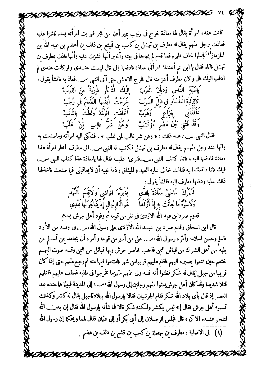 فَقَالَ النَّبِيُّ صَلَّى اللَّهُ عَلَيْهِ وَسَلَّمَ عِنْدَ ذَلِكَ: «وَهُنَّ شَرُّ غَالِبٍ لِمَنْ غَلَبْ» . فَشَكَى إِلَيْهِ امْرَأَتَهُ وَمَا صَنَعَتْ بِهِ وَأَنَّهَا عِنْدَ رَجُلٍ مِنْهُمْ يُقَالُ لَهُ مُطَرِّفُ بْنُ نَهْشَلٍ فَكَتَبَ لَهُ النَّبِيُّ صَلَّى اللَّهُ عَلَيْهِ وَسَلَّمَ إِلَى مُطَرِّفٍ انْظُرِ امْرَأَةَ هَذَا مُعَاذَةَ فَادْفَعْهَا إِلَيْهِ، فَأَتَاهُ كِتَابُ النَّبِيِّ صَلَّى اللَّهُ عَلَيْهِ وَسَلَّمَ فَقُرِئَ عَلَيْهِ فَقَالَ لَهَا يَا مُعَاذَةُ هَذَا كِتَابُ النَّبِيِّ صَلَّى اللَّهُ عَلَيْهِ وَسَلَّمَ فِيكِ فَأَنَا دَافِعُكِ إِلَيْهِ فَقَالَتْ خُذْ لِي عَلَيْهِ الْعَهْدَ وَالْمِيثَاقَ وَذِمَّةَ نَبِيِّهِ أَنْ لَا يُعَاقِبَنِي فِيمَا صَنَعْتُ فَأَخَذَ لَهَا ذَلِكَ عَلَيْهِ وَدَفَعَهَا مُطَرِّفٌ إِلَيْهِ فَأَنْشَأَ يَقُولُ: