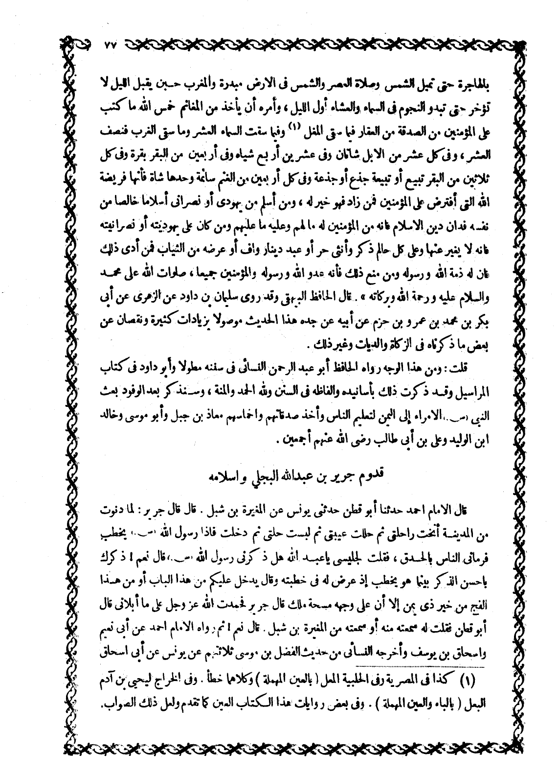 بِالْهَاجِرَةِ حَتَّى تَمِيلَ الشَّمْسُ وَصَلَاةُ الْعَصْرِ وَالشَّمْسِ في الأرض مبدرة والمغرب حبن يقبل الليل لا تُؤَخَّرُ حَتَّى تَبْدُوَ النُّجُومُ فِي السَّمَاءِ وَالْعِشَاءُ أول الليل، وَأَمَرَهُ أَنْ يَأْخُذَ مِنَ الْمَغَانِمِ خُمُسَ اللَّهِ ما كُتِبَ عَلَى الْمُؤْمِنِينَ مِنَ الصَّدَقَةِ مِنَ الْعَقَارِ فيما سقى المغل [1] وفيما سقت السماء العشر وما سقى الغرب فَنِصْفُ الْعُشْرِ، وَفِي كُلِّ عَشْرٍ مِنَ الْإِبِلِ شَاتَانِ وَفِي عِشْرِينَ أَرْبَعُ شِيَاهٍ وَفِي أَرْبَعِينَ مِنَ الْبَقَرِ بَقَرَةٌ وَفِي كُلِّ ثَلَاثِينَ مِنَ الْبَقَرِ تَبِيعٌ أَوْ تَبِيعَةٌ جَذَعٌ أَوْ جَذَعَةٌ وَفِي كُلِّ أَرْبَعِينَ مِنَ الْغَنَمِ سَائِمَةٍ وَحْدَهَا شَاةٌ فَإِنَّهَا فَرِيضَةُ اللَّهِ الَّتِي افْتَرَضَ عَلَى المؤمنين فمن زاد فهو خير له، ومن أَسْلَمَ مِنْ يَهُودِيٍّ أَوْ نَصْرَانِيٍّ إِسْلَامًا خَالِصًا مِنْ نَفْسِهِ فَدَانَ دِينَ الْإِسْلَامِ فَإِنَّهُ مِنَ الْمُؤْمِنِينَ لَهُ مَا لَهُمْ وَعَلَيْهِ مَا عَلَيْهِمْ وَمَنْ كَانَ عَلَى يَهُودِيَّتِهِ أَوْ نَصْرَانِيَّتِهِ فَإِنَّهُ لَا يُغَيَّرُ عَنْهَا وَعَلَى كُلِّ حَالِمٍ ذَكَرٍ وأنثى حر أو عبد دينار واف أو عرضه مِنَ الثِّيَابِ فَمَنْ أَدَّى ذَلِكَ فَإِنَّ لَهُ ذمة الله ورسوله وَمَنْ مَنَعَ ذَلِكَ فَإِنَّهُ عَدُوُّ اللَّهِ وَرَسُولِهِ وَالْمُؤْمِنِينَ جَمِيعًا، صَلَوَاتُ اللَّهِ عَلَى مُحَمَّدٍ وَالسَّلَامُ عَلَيْهِ وَرَحْمَةُ اللَّهِ وَبَرَكَاتُهُ» . قَالَ الْحَافِظُ الْبَيْهَقِيُّ وَقَدْ رَوَى سُلَيْمَانُ بْنُ دَاوُدَ عَنِ الزُّهْرِيِّ عَنْ أَبِي بَكْرِ بْنِ مُحَمَّدِ بْنِ عَمْرِو بْنِ حَزْمٍ عَنْ أَبِيهِ عَنْ جِدِّهِ هَذَا الْحَدِيثَ مَوْصُولًا بِزِيَادَاتٍ كَثِيرَةٍ وَنُقْصَانٍ عَنْ بَعْضِ مَا ذَكَرْنَاهُ فِي الزَّكَاةِ وَالدِّيَاتِ وَغَيْرِ ذَلِكَ. قُلْتُ: وَمِنْ هَذَا الْوَجْهِ رَوَاهُ الْحَافِظُ أَبُو عَبْدِ الرَّحْمَنِ النَّسَائِيُّ فِي سُنَنِهِ مُطَوَّلًا وَأَبُو دَاوُدَ فِي كِتَابِ الْمَرَاسِيلِ وَقَدْ ذَكَرْتُ ذَلِكَ بِأَسَانِيدِهِ وَأَلْفَاظِهِ فِي السُّنَنِ وللَّه الْحَمْدُ وَالْمِنَّةُ، وَسَنَذْكُرُ بَعْدَ الْوُفُودِ بَعْثَ النَّبِيِّ صَلَّى اللَّهُ عَلَيْهِ وَسَلَّمَ الْأُمَرَاءَ إِلَى الْيَمَنِ لِتَعْلِيمِ النَّاسِ وأخذ صدقاتهم واخماسهم معاذ بن جبل وأبو موسى وخالد ابن الْوَلِيدِ وَعَلِيُّ بْنُ أَبِي طَالِبٍ رَضِيَ اللَّهُ عَنْهُمْ أَجْمَعِينَ.