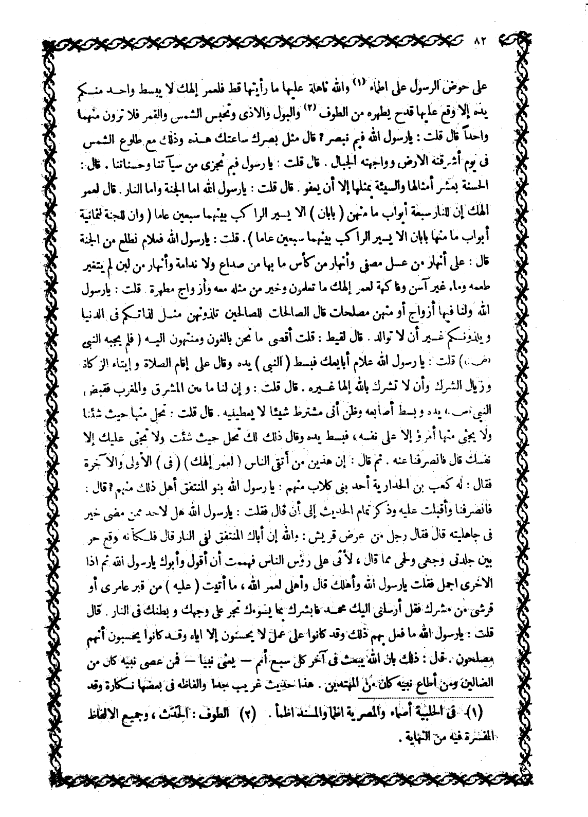 على حوض الرسول على اطماء [1] وَاللَّهِ نَاهِلَةٍ عَلَيْهَا مَا رَأَيْتُهَا قَطُّ فَلَعَمْرُ إِلَهِكَ لَا يَبْسُطُ وَاحِدٌ مِنْكُمْ يَدَهُ إِلَّا وَقَعَ عَلَيْهَا قَدَحٌ يُطَهِّرُهُ مِنَ الطَّوْفِ [2] وَالْبَوْلِ والأذى وتحبسن الشَّمْسُ وَالْقَمَرُ فَلَا تَرَوْنَ مِنْهُمَا وَاحِدًا قَالَ قُلْتُ: يَا رَسُولَ الله فيم نبصر؟ قال مثل بَصَرِكَ سَاعَتَكَ هَذِهِ وَذَلِكَ مَعَ طُلُوعِ الشَّمْسِ في يوم أشرقته الْأَرْضُ وَوَاجَهَتْهُ الْجِبَالُ. قَالَ قُلْتُ: يَا رَسُولَ فيم نُجْزَى مِنْ سَيِّئَاتِنَا وَحَسَنَاتِنَا. قَالَ: