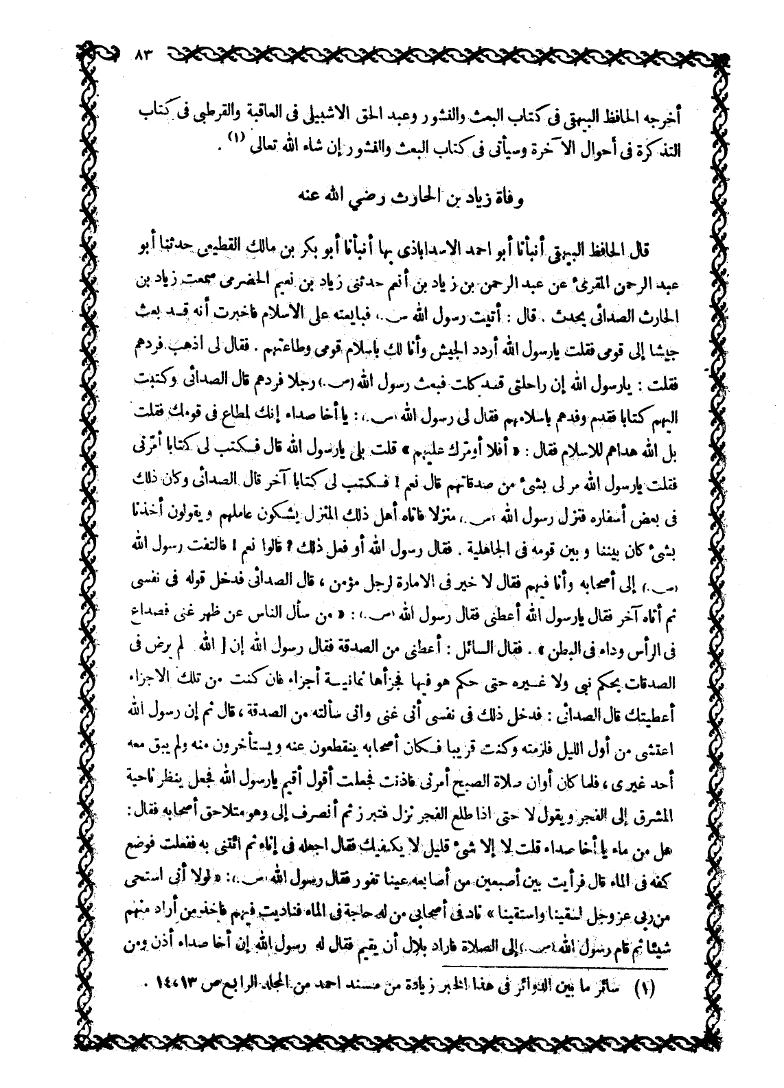 قَالَ الْحَافِظُ الْبَيْهَقِيُّ أَنْبَأَنَا أَبُو أَحْمَدَ الْأَسَدَابَاذِيُّ بِهَا أَنْبَأَنَا أَبُو بَكْرٍ بن مالك القطيعي حَدَّثَنَا أَبُو عَبْدِ الرَّحْمَنِ الْمُقْرِئُ عَنْ عَبْدِ الرَّحْمَنِ بْنِ زِيَادِ بْنِ أَنْعُمٍ حَدَّثَنِي زِيَادُ بْنُ نُعَيْمٍ الْحَضْرَمِيُّ سَمِعْتُ زِيَادَ بْنَ الْحَارِثِ الصُّدَائِيَّ يُحَدِّثُ. قَالَ: أَتَيْتُ رَسُولَ اللَّهِ صَلَّى اللَّهُ عَلَيْهِ وَسَلَّمَ فَبَايَعْتُهُ عَلَى الْإِسْلَامِ فَأُخْبِرْتُ أَنَّهُ قَدْ بَعَثَ جَيْشًا إِلَى قَوْمِي فَقُلْتُ يَا رَسُولَ اللَّهِ ارْدُدِ الْجَيْشَ وَأَنَا لَكَ بِإِسْلَامِ قَوْمِي وَطَاعَتِهِمْ. فَقَالَ لِيَ اذْهَبْ فَرُدَّهُمْ فَقُلْتُ: يَا رَسُولَ اللَّهِ إِنَّ رَاحِلَتِي قَدْ كَلَّتْ فَبُعِثَ رَسُولُ اللَّهِ صَلَّى اللَّهُ عَلَيْهِ وَسَلَّمَ رَجُلًا فَرَدَّهُمْ قَالَ الصُّدَائِيُّ وَكَتَبْتُ إِلَيْهِمْ كِتَابًا فَقَدِمَ وَفْدُهُمْ بِإِسْلَامِهِمْ فَقَالَ لِي رَسُولُ اللَّهِ صَلَّى اللَّهُ عَلَيْهِ وَسَلَّمَ: يَا أَخَا صُدَاءٍ إِنَّكَ لَمُطَاعٌ فِي قَوْمِكَ فَقُلْتُ بَلِ اللَّهُ هَدَاهُمْ لِلْإِسْلَامِ فَقَالَ: «أَفَلَا أُؤَمِّرُكَ عَلَيْهِمْ» قُلْتُ بَلَى يَا رَسُولَ اللَّهِ قَالَ فَكَتَبَ لِي كِتَابًا أَمَّرَنِي فَقُلْتُ يَا رَسُولَ اللَّهِ مُرْ لِي بِشَيْءٍ مِنْ صَدَقَاتِهِمْ قَالَ نَعَمْ! فَكَتَبَ لِي كِتَابًا آخَرَ قَالَ الصُّدَائِيُّ وَكَانَ ذَلِكَ فِي بَعْضِ أَسْفَارِهِ فَنَزَلَ رَسُولُ اللَّهِ صَلَّى اللَّهُ عَلَيْهِ وَسَلَّمَ مَنْزِلًا فَأَتَاهُ أَهْلُ ذَلِكَ الْمَنْزِلِ يَشْكُونَ عَامِلَهُمْ وَيَقُولُونَ أَخَذَنَا بِشَيْءٍ كَانَ بَيْنَنَا وَبَيْنَ قَوْمِهِ فِي الْجَاهِلِيَّةِ. فَقَالَ رسول الله أَوَ فَعَلَ ذَلِكَ؟ قَالُوا نَعَمْ! فَالْتَفَتَ رَسُولُ اللَّهِ صَلَّى اللَّهُ عَلَيْهِ وَسَلَّمَ إِلَى أَصْحَابِهِ وَأَنَا فِيهِمْ فَقَالَ لَا خَيْرَ فِي الْإِمَارَةِ لِرَجُلٍ مُؤْمِنٍ، قَالَ الصُّدَائِيُّ فَدَخَلَ قَوْلُهُ فِي نَفْسِي ثُمَّ أَتَاهُ آخَرٌ فَقَالَ يَا رَسُولَ اللَّهِ أَعْطِنِي فَقَالَ رَسُولُ اللَّهِ صَلَّى اللَّهُ عَلَيْهِ وَسَلَّمَ: «مَنْ سَأَلَ النَّاسَ عَنْ ظَهْرِ غِنًى فَصُدَاعٌ فِي الرَّأْسِ وَدَاءٌ فِي الْبَطْنِ» . فقال السائل: أعطنى من الصدقة فقال رسول الله إِنَّ [اللَّهَ] لَمْ يَرْضَ فِي الصَّدَقَاتِ بِحُكْمِ نَبِيٍّ وَلَا غَيْرِهِ حَتَّى حَكَمَ هُوَ فِيهَا فَجَزَّأَهَا ثَمَانِيَةَ أَجْزَاءٍ فَإِنْ كُنْتَ مِنْ تِلْكَ الْأَجْزَاءِ أَعْطَيْتُكَ قَالَ الصُّدَائِيُّ: فَدَخَلَ ذَلِكَ فِي نَفْسِي أَنِّي غَنِيٌّ وَأَنِّي سَأَلْتُهُ مِنَ الصَّدَقَةِ، قال ثم إن رسول الله اعْتَشَى مِنْ أَوَّلِ اللَّيْلِ فَلَزِمْتُهُ وَكُنْتُ قَرِيبًا فَكَانَ أَصْحَابُهُ يَنْقَطِعُونَ عَنْهُ وَيَسْتَأْخِرُونَ مِنْهُ وَلَمْ يَبْقَ مَعَهُ أَحَدٌ غَيْرِي، فَلَمَّا كَانَ أَوَانُ صَلَاةِ الصُّبْحِ أَمَرَنِي فَأَذَّنْتُ فَجَعَلْتُ أَقُولُ أُقِيمُ يَا رَسُولَ اللَّهِ فَجَعَلَ يَنْظُرُ نَاحِيَةَ الْمَشْرِقِ إِلَى الْفَجْرِ وَيَقُولُ لَا حَتَّى إِذَا طَلَعَ الْفَجْرُ نَزَلَ فَتَبَرَّزَ ثُمَّ انْصَرَفَ إِلَيَّ وَهُوَ مُتَلَاحِقٌ أَصْحَابَهُ فَقَالَ: