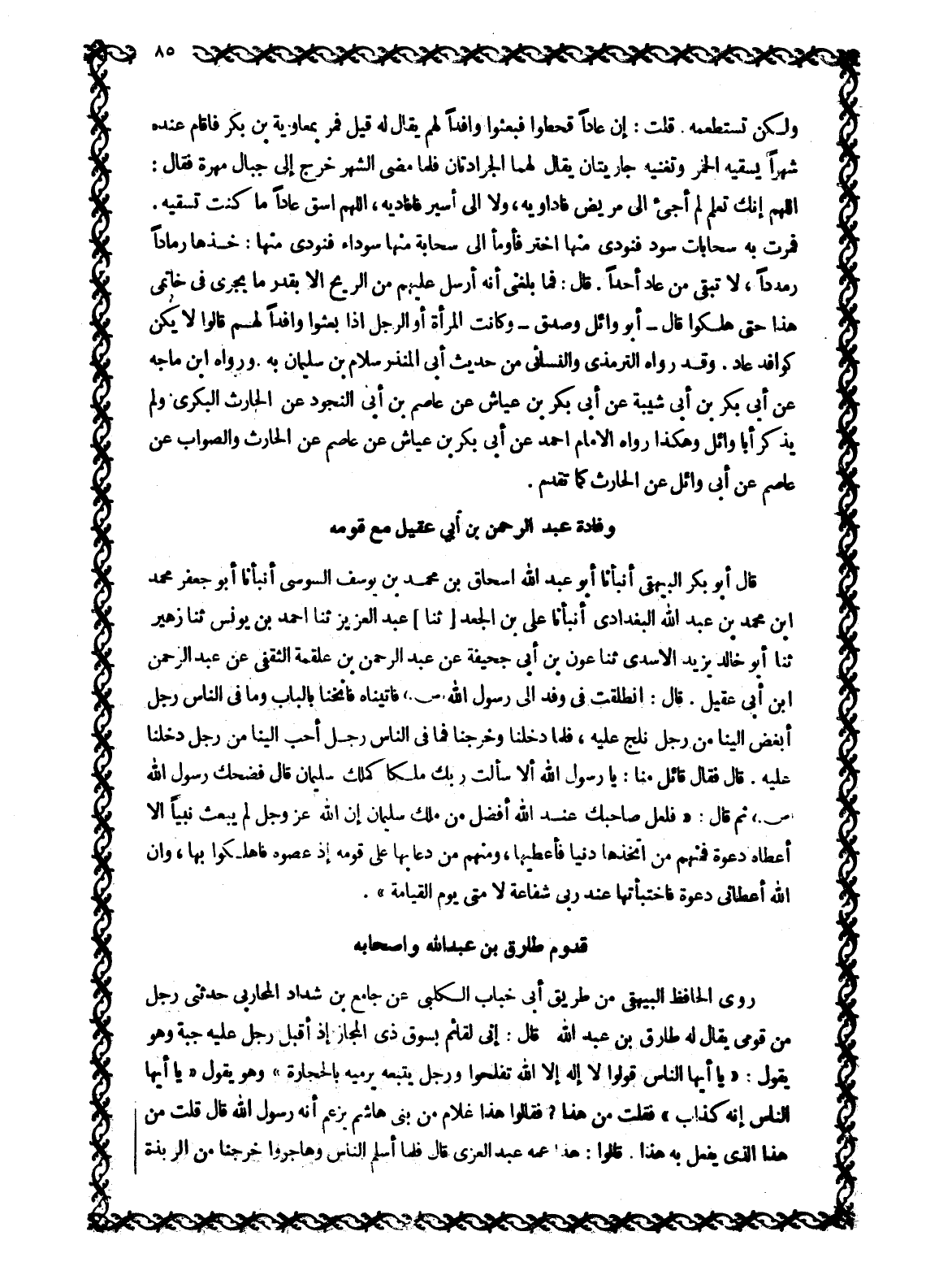 قال أَبُو بَكْرٍ الْبَيْهَقِيُّ أَنْبَأَنَا أَبُو عَبْدِ اللَّهِ إِسْحَاقُ بْنُ مُحَمَّدِ بْنِ يُوسُفَ السُّوسِيُّ أَنْبَأَنَا أبو جعفر محمد ابن مُحَمَّدِ بْنِ عَبْدِ اللَّهِ الْبَغْدَادِيُّ أَنْبَأَنَا عَلِيُّ بْنُ الْجَعْدِ [ثَنَا] عَبْدُ الْعَزِيزِ ثَنَا أَحْمَدُ بْنُ يُونُسَ ثَنَا زُهَيْرٌ ثَنَا أَبُو خَالِدٍ يَزِيدُ الْأَسَدِيُّ ثَنَا عَوْنُ بْنُ أَبِي جُحَيْفَةَ عَنْ عَبْدِ الرَّحْمَنِ بْنِ عَلْقَمَةَ الثَّقَفِيِّ عَنْ عَبْدِ الرحمن ابن أَبِي عَقِيلٍ. قَالَ: انْطَلَقْتُ فِي وَفْدٍ إِلَى رَسُولِ اللَّهِ صَلَّى اللَّهُ عَلَيْهِ وَسَلَّمَ فَأَتَيْنَاهُ فانخنا بالباب وما في الناس رجل أَبْغَضُ إِلَيْنَا مِنْ رَجُلٍ نَلِجُ عَلَيْهِ، فَلَمَّا دخلنا وخرجنا فما فِي النَّاسِ رَجُلٌ أَحَبُّ إِلَيْنَا مِنْ رَجُلٍ دَخَلْنَا عَلَيْهِ. قَالَ فَقَالَ قَائِلٌ مِنَّا: يَا رَسُولَ اللَّهِ أَلَا سَأَلْتَ رَبَّكَ مُلْكًا كَمُلْكِ سُلَيْمَانَ قَالَ فَضَحِكَ رَسُولُ اللَّهِ صَلَّى اللَّهُ عَلَيْهِ وَسَلَّمَ ثُمَّ قال: «فلعل صاحبك عِنْدَ اللَّهِ أَفْضَلَ مِنْ مُلْكِ سُلَيْمَانَ إِنَّ اللَّهَ عَزَّ وَجَلَّ لَمْ يَبْعَثْ نَبِيًّا إِلَّا أَعْطَاهُ دَعْوَةً فَمِنْهُمْ مَنِ اتَّخَذَهَا دُنْيَا فَأُعْطِيَهَا، وَمِنْهُمْ مَنْ دَعَا بِهَا عَلَى قَوْمِهِ إِذْ عَصَوْهُ فَأُهْلِكُوا بِهَا، وَإِنَّ اللَّهَ أَعْطَانِي دَعْوَةً فَاخْتَبَأْتُهَا عِنْدَ رَبِّي شفاعة لا متى يَوْمَ الْقِيَامَةِ» .