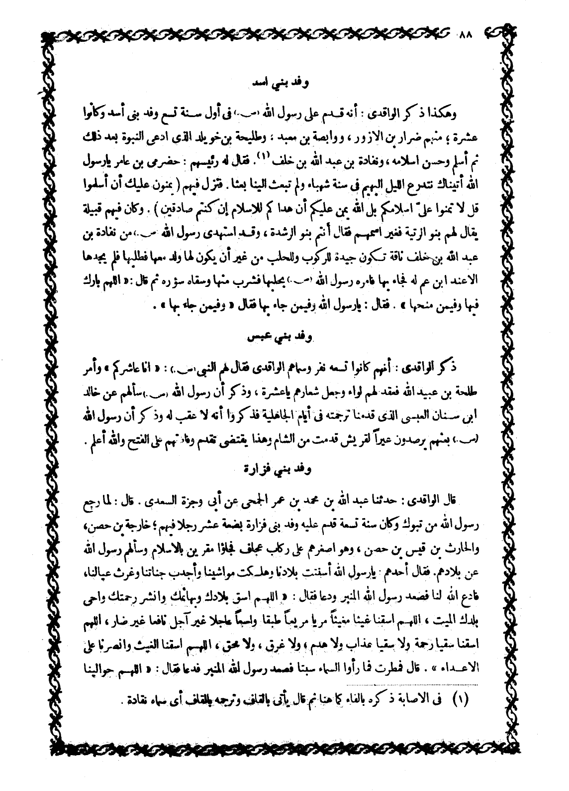 وَهَكَذَا ذَكَرَ الْوَاقِدِيُّ: أَنَّهُ قَدِمَ عَلَى رَسُولِ اللَّهِ صَلَّى اللَّهُ عَلَيْهِ وَسَلَّمَ فِي أَوَّلِ سَنَةِ تِسْعٍ وَفْدُ بَنِي أَسَدٍ وَكَانُوا عَشَرَةً، مِنْهُمْ ضِرَارُ بْنُ الْأَزْوَرِ، وَوَابِصَةُ بْنُ مَعْبَدٍ، وَطُلَيْحَةُ بْنُ خُوَيْلِدٍ الَّذِي ادَّعَى النُّبُوَّةَ بَعْدَ ذَلِكَ ثُمَّ أَسْلَمَ وَحَسُنَ إسلامه، ونفادة بْنُ عَبْدِ اللَّهِ بْنِ خَلَفٍ [1] . فَقَالَ لَهُ رَئِيسُهُمْ: حَضْرَمِيُّ بْنُ عَامِرٍ يَا رَسُولَ اللَّهِ أَتَيْنَاكَ نَتَدَرَّعُ اللَّيْلَ الْبَهِيمَ فِي سَنَةٍ شَهْبَاءَ وَلَمْ تَبْعَثْ إِلَيْنَا بَعْثًا. فَنَزَلَ فِيهِمْ يَمُنُّونَ عَلَيْكَ أَنْ أَسْلَمُوا قُلْ لَا تَمُنُّوا عَلَيَّ إِسْلامَكُمْ بَلِ اللَّهُ يَمُنُّ عَلَيْكُمْ أَنْ هَداكُمْ لِلْإِيمانِ إِنْ كُنْتُمْ صادِقِينَ 49: 17. وَكَانَ فِيهِمْ قَبِيلَةٌ يُقَالُ لَهُمْ بَنُو الزِّنْيَةِ فَغَيَّرَ اسْمَهُمْ فَقَالَ أَنْتُمْ بَنُو الرِّشْدَةِ، وَقَدِ اسْتَهْدَى رَسُولُ اللَّهِ صَلَّى اللَّهُ عَلَيْهِ وَسَلَّمَ مَنْ نفادة بْنِ عَبْدِ اللَّهِ بْنِ خَلَفٍ نَاقَةً تَكُونُ جَيِّدَةً لِلرُّكُوبِ وَلِلْحَلْبِ مِنْ غَيْرِ أَنْ يَكُونَ لَهَا وَلَدٌ مَعَهَا فَطَلَبَهَا فَلَمْ يَجِدْهَا إِلَّا عِنْدَ ابْنِ عَمٍّ لَهُ فَجَاءَ بِهَا فَأَمَرَهُ رَسُولُ اللَّهِ صَلَّى اللَّهُ عَلَيْهِ وَسَلَّمَ بِحَلْبِهَا فَشَرِبَ مِنْهَا وَسَقَاهُ سُؤْرَهُ ثُمَّ قَالَ: «اللَّهمّ بَارِكْ فِيهَا وَفِيمَنْ مَنَحَهَا» . فَقَالَ: يَا رَسُولَ اللَّهِ وَفِيمَنْ جَاءَ بِهَا فَقَالَ «وَفِيمَنْ جَاءَ بِهَا» .