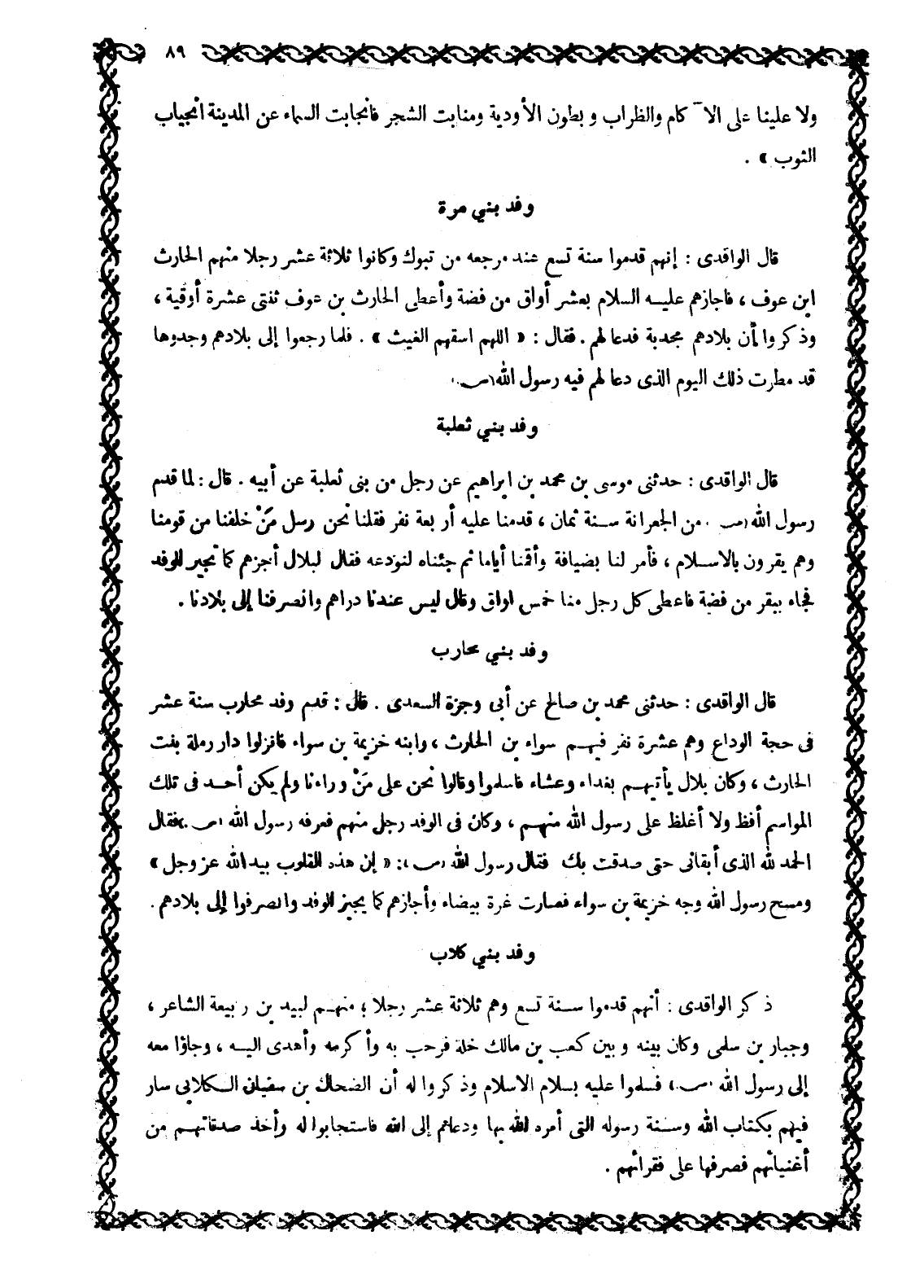 قَالَ الْوَاقِدِيُّ: حَدَّثَنِي مُوسَى بْنُ مُحَمَّدِ بْنِ إِبْرَاهِيمَ عَنْ رَجُلٍ مِنْ بَنِي ثَعْلَبَةَ عَنْ أَبِيهِ. قَالَ: لَمَّا قَدِمَ رَسُولُ اللَّهِ صَلَّى اللَّهُ عَلَيْهِ وَسَلَّمَ مِنَ الْجِعْرَانَةَ سَنَةَ ثَمَانٍ، قَدِمْنَا عَلَيْهِ أَرْبَعَةَ نَفَرٍ فَقُلْنَا نَحْنُ رُسُلُ مَنْ خَلْفَنَا مِنْ قَوْمِنَا وَهُمْ يُقِرُّونَ بِالْإِسْلَامِ، فَأَمَرَ لَنَا بِضِيَافَةٍ وَأَقَمْنَا أَيَّامًا ثُمَّ جِئْنَاهُ لِنُوَدِّعَهُ فَقَالَ لِبِلَالٍ أَجْزِهِمْ كَمَا تُجِيزُ الوفد فجاء ببقر مِنْ فِضَّةٍ فَأَعْطَى كُلَّ رَجُلٍ مِنَّا خَمْسَ أَوَاقٍ وَقَالَ لَيْسَ عِنْدَنَا دَرَاهِمُ وَانْصَرَفْنَا إِلَى بلادنا.