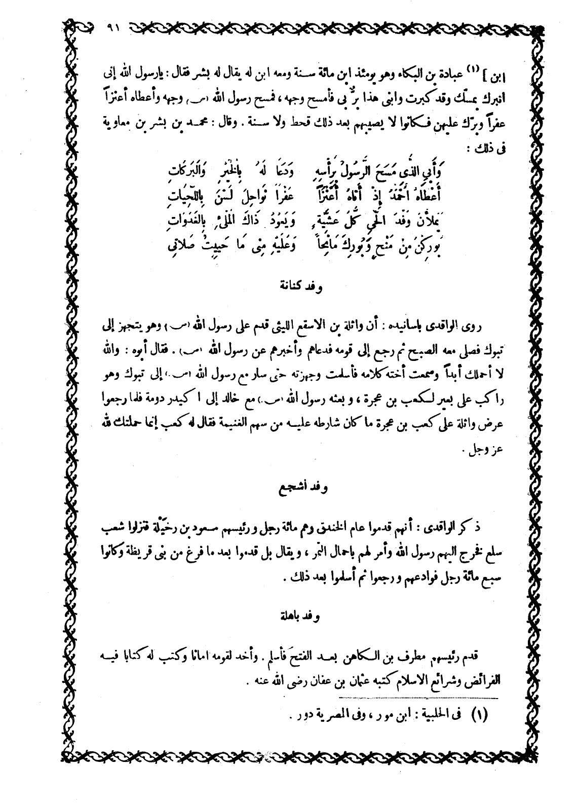 ابن] [1] عُبَادَةَ بْنِ الْبَكَّاءِ وَهُوَ يَوْمَئِذٍ ابْنُ مِائَةِ سَنَةٍ وَمَعَهُ ابْنٌ لَهُ يُقَالُ لَهُ بِشْرٌ فَقَالَ: يَا رَسُولَ اللَّهِ إِنِّي أَتَبَرَّكُ بِمَسِّكَ وَقَدْ كَبِرْتُ وَابْنِي هَذَا بَرٌّ بِي فَامْسَحْ وَجْهَهُ، فَمَسَحَ رَسُولُ اللَّهِ صَلَّى اللَّهُ عَلَيْهِ وَسَلَّمَ وَجْهَهُ وَأَعْطَاهُ أَعْنُزًا عُفْرًا وَبَرَّكَ عَلَيْهِنَّ فَكَانُوا لَا يُصِيبُهُمْ بَعْدَ ذَلِكَ قَحْطٌ وَلَا سَنَةٌ. وَقَالَ: مُحَمَّدُ بْنُ بِشْرِ بْنِ مُعَاوِيَةَ فِي ذَلِكَ: