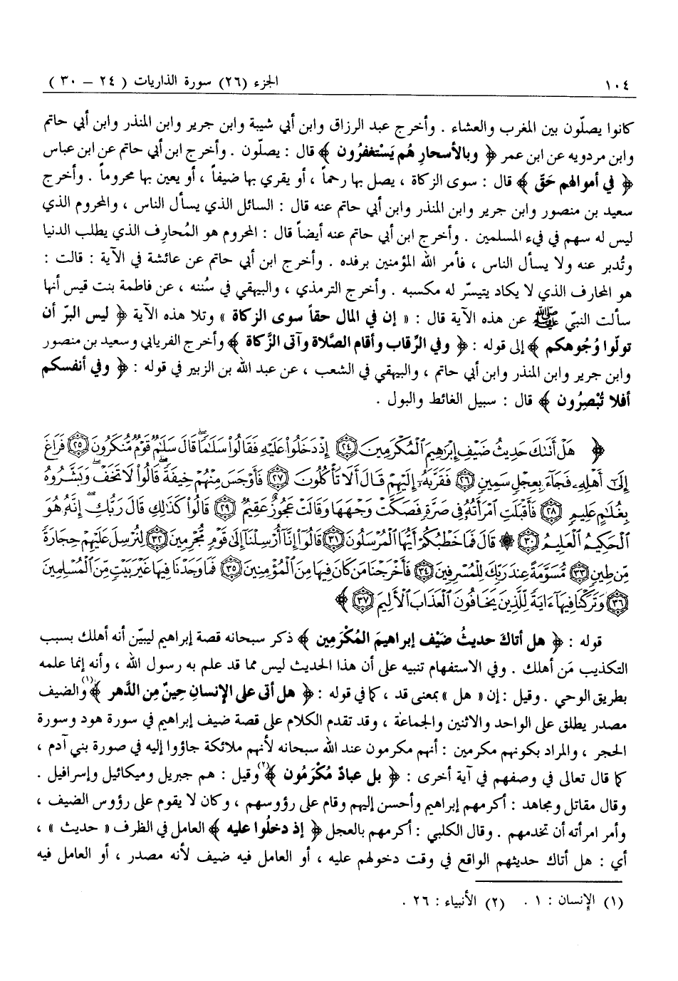 هَلْ أَتاكَ حَدِيثُ ضَيْفِ إِبْراهِيمَ الْمُكْرَمِينَ (24) إِذْ دَخَلُوا عَلَيْهِ فَقالُوا سَلاماً قالَ سَلامٌ قَوْمٌ مُنْكَرُونَ (25) فَراغَ إِلى أَهْلِهِ فَجاءَ بِعِجْلٍ سَمِينٍ (26) فَقَرَّبَهُ إِلَيْهِمْ قالَ أَلا تَأْكُلُونَ (27) فَأَوْجَسَ مِنْهُمْ خِيفَةً قالُوا لَا تَخَفْ وَبَشَّرُوهُ بِغُلامٍ عَلِيمٍ (28)