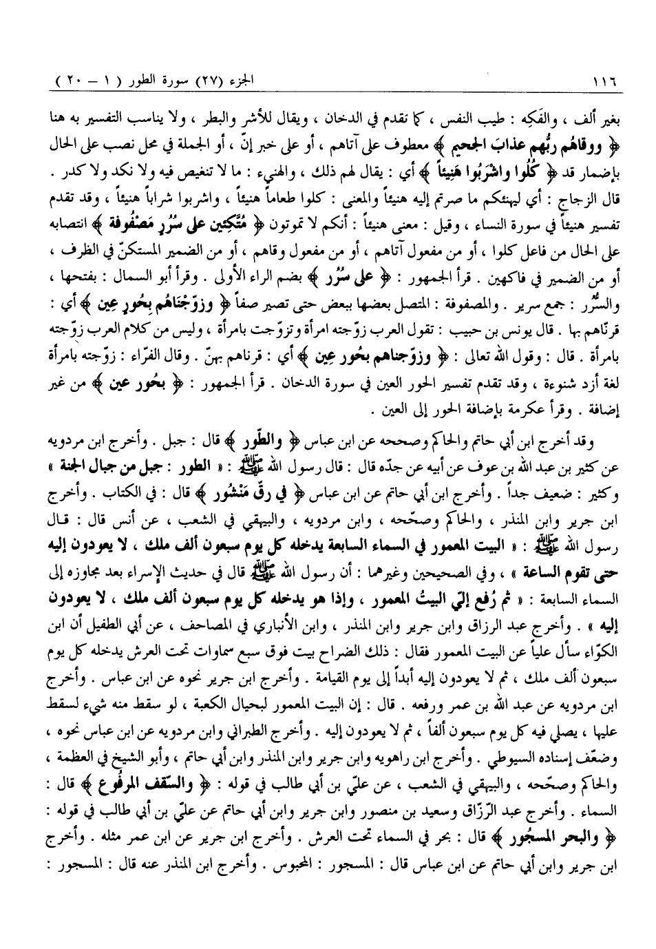 وَقَدْ أَخْرَجَ ابْنُ أَبِي حَاتِمٍ وَالْحَاكِمُ وَصَحَّحَهُ عَنِ ابْنِ عَبَّاسٍ وَالطُّورِ قَالَ: جَبَلٌ. وَأَخْرَجَ ابْنُ مَرْدَوَيْهِ عَنْ كَثِيرِ بْنِ عَبْدِ اللَّهِ بْنِ عَوْفٍ عَنْ أَبِيهِ عَنْ جَدِّهِ قَالَ: قَالَ رَسُولُ اللَّهِ صَلَّى اللَّهُ عَلَيْهِ وَسَلَّمَ: «الطُّورُ: جَبَلٌ مِنْ جِبَالِ الْجَنَّةِ» وَكَثِيرٌ: ضَعِيفٌ جِدًّا. وَأَخْرَجَ ابْنُ أَبِي حَاتِمٍ عَنِ ابْنِ عَبَّاسٍ فِي رَقٍّ مَنْشُورٍ قَالَ: فِي الْكِتَابِ. وَأَخْرَجَ ابْنُ جَرِيرٍ وَابْنُ الْمُنْذِرِ، وَالْحَاكِمُ وَصَحَّحَهُ، وَابْنُ مَرْدَوَيْهِ، وَالْبَيْهَقِيُّ فِي الشُّعَبِ، عَنْ أَنَسٍ قَالَ: قَالَ رَسُولُ اللَّهِ صَلَّى اللَّهُ عَلَيْهِ وَسَلَّمَ: «الْبَيْتُ الْمَعْمُورُ فِي السَّمَاءِ السَّابِعَةِ يَدْخُلُهُ كُلَّ يَوْمٍ سَبْعُونَ أَلْفَ مَلَكٍ، لَا يَعُودُونَ إليه حتى تقوم الساعة» ، وفي الصحيحين وغير هما: أَنَّ رَسُولَ اللَّهِ صَلَّى اللَّهُ عَلَيْهِ وَسَلَّمَ قال في حديث الإسراء بعد مجاوزه إِلَى السَّمَاءِ السَّابِعَةِ: «ثُمَّ رُفِعَ إِلَيَّ الْبَيْتُ الْمَعْمُورُ، وَإِذَا هُوَ يَدْخُلُهُ كُلَّ يَوْمٍ سَبْعُونَ أَلْفَ مَلَكٍ، لَا يَعُودُونَ إِلَيْهِ» . وَأَخْرَجَ عَبْدُ الرَّزَّاقِ وَابْنُ جَرِيرٍ وَابْنُ الْمُنْذِرِ، وَابْنُ الْأَنْبَارِيِّ فِي الْمَصَاحِفِ، عَنْ أَبِي الطُّفَيْلِ أَنَّ ابْنَ الْكَوَّاءِ سَأَلَ عَلِيًّا عَنِ الْبَيْتِ الْمَعْمُورِ فَقَالَ: ذلك الضراح بيت فوق سبع سماوات تَحْتَ الْعَرْشِ يَدْخُلُهُ كُلَّ يَوْمٍ سَبْعُونَ أَلْفَ مَلَكٍ، ثُمَّ لَا يَعُودُونَ إِلَيْهِ أَبَدًا إِلَى يَوْمِ الْقِيَامَةِ. وَأَخْرَجَ ابْنُ جَرِيرٍ نَحْوَهُ عَنِ ابْنِ عَبَّاسٍ. وَأَخْرَجَ ابْنُ مَرْدَوَيْهِ عَنْ عَبْدِ اللَّهِ بْنِ عمر وَرَفَعَهُ. قَالَ: إِنَّ الْبَيْتَ الْمُعْمُورَ لَبِحِيَالِ الْكَعْبَةِ، لَوْ سَقَطَ مِنْهُ شَيْءٌ لَسَقَطَ عَلَيْهَا، يُصَلِّي فِيهِ كُلَّ يَوْمٍ سَبْعُونَ أَلْفًا، ثُمَّ لَا يَعُودُونَ إِلَيْهِ. وَأَخْرَجَ الطَّبَرَانِيُّ وَابْنُ مَرْدَوَيْهِ عَنِ ابْنِ عَبَّاسٍ نَحْوَهُ، وَضَعَّفَ إِسْنَادَهُ السُّيُوطِيُّ. وَأَخْرَجَ ابْنُ رَاهَوَيْهِ وَابْنُ جَرِيرٍ وَابْنُ الْمُنْذِرِ وَابْنُ أَبِي حَاتِمٍ، وَأَبُو الشَّيْخِ فِي الْعَظَمَةِ، وَالْحَاكِمُ وَصَحَّحَهُ، وَالْبَيْهَقِيُّ فِي الشُّعَبِ، عَنْ عَلِيِّ بْنِ أَبِي طَالِبٍ فِي قَوْلِهِ: وَالسَّقْفِ الْمَرْفُوعِ قَالَ: