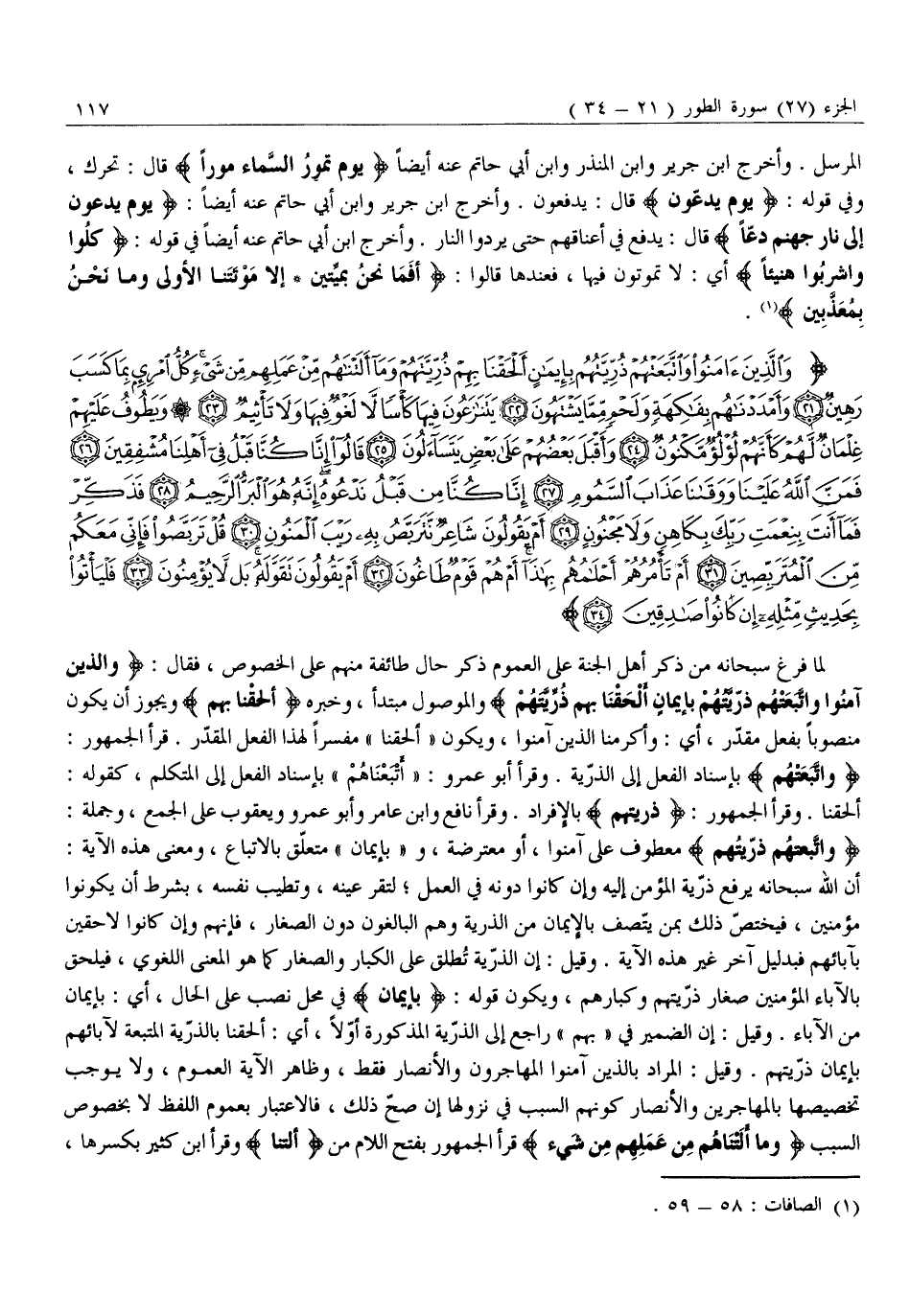 لَمَّا فَرَغَ سُبْحَانَهُ مِنْ ذِكْرِ أَهْلِ الْجَنَّةِ عَلَى الْعُمُومِ ذَكَرَ حَالَ طَائِفَةٍ مِنْهُمْ عَلَى الْخُصُوصِ، فَقَالَ: وَالَّذِينَ آمَنُوا وَاتَّبَعَتْهُمْ ذُرِّيَّتُهُمْ بِإِيمانٍ أَلْحَقْنا بِهِمْ ذُرِّيَّتَهُمْ وَالْمَوْصُولُ مُبْتَدَأٌ، وَخَبَرُهُ أَلْحَقْنا بِهِمْ وَيَجُوزُ أَنْ يَكُونَ مَنْصُوبًا بِفِعْلٍ مُقَدَّرٍ، أَيْ: وَأَكْرَمْنَا الَّذِينَ آمَنُوا، وَيَكُونُ «أَلْحَقْنَا» مُفَسِّرًا لِهَذَا الْفِعْلِ الْمُقَدَّرِ. قَرَأَ الْجُمْهُورُ: