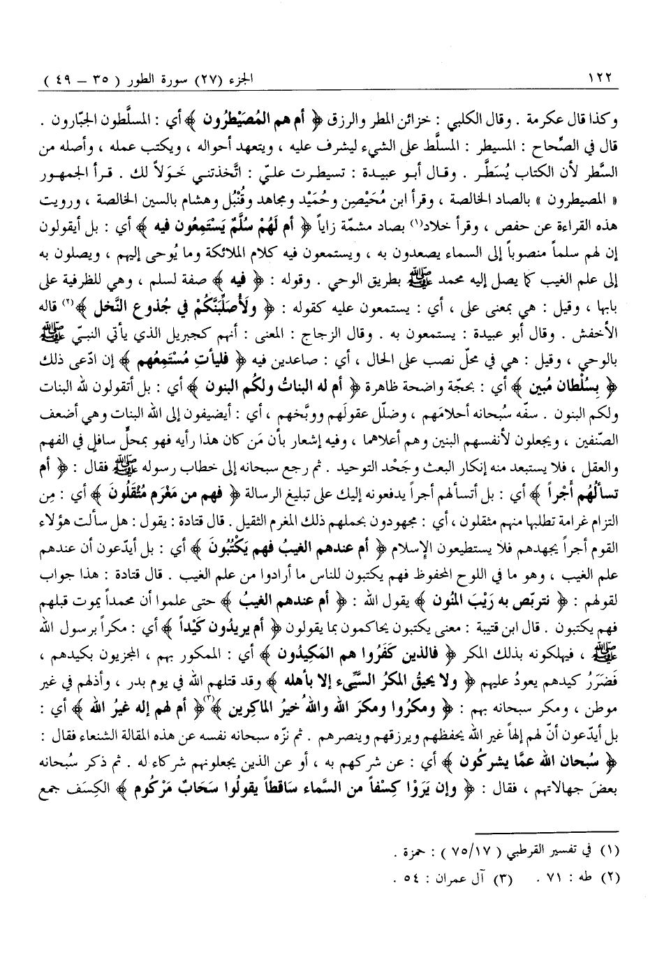 قَالَ فِي الصِّحَاحِ: الْمُسَيْطِرُ: الْمُسَلَّطُ عَلَى الشَّيْءِ لِيُشْرِفَ عَلَيْهِ، وَيَتَعَهَّدَ أَحْوَالَهُ، وَيَكْتُبَ عَمَلَهُ، وَأَصْلُهُ مِنَ السَّطْرِ لِأَنَّ الْكِتَابَ يسطّر. وقال أبو عبيدة: تسيطرت عَلَيَّ: اتَّخَذْتَنِي خَوَلًا لَكَ. قَرَأَ الْجُمْهُورُ «الْمُصَيْطِرُونَ» بِالصَّادِ الْخَالِصَةِ، وَقَرَأَ ابْنُ مُحَيْصِنٍ وَحُمَيْدٌ وَمُجَاهِدٌ وَقُنْبُلٌ وَهِشَامٌ بِالسِّينِ الْخَالِصَةِ، وَرُوِيَتْ هَذِهِ الْقِرَاءَةُ عَنْ حَفْصٍ، وَقَرَأَ خَلَّادٌ «1» بِصَادٍ مُشَمَّةٍ زَايًا أَمْ لَهُمْ سُلَّمٌ يَسْتَمِعُونَ فِيهِ أَيْ: بَلْ أَيَقُولُونَ إِنَّ لَهُمْ سُلَّمًا مَنْصُوبًا إِلَى السَّمَاءِ يَصْعَدُونَ بِهِ، وَيَسْتَمِعُونَ فِيهِ كَلَامَ الْمَلَائِكَةِ وَمَا يُوحَى إِلَيْهِمْ، وَيَصِلُونَ بِهِ إِلَى عِلْمِ الْغَيْبِ كَمَا يَصِلُ إِلَيْهِ مُحَمَّدٌ صَلَّى اللَّهُ عَلَيْهِ وَسَلَّمَ بِطَرِيقِ الْوَحْيِ. وَقَوْلِهِ: فِيهِ صِفَةٌ لِسُلَّمٍ، وَهِيَ لِلظَّرْفِيَّةِ عَلَى بَابِهَا، وَقِيلَ: هِيَ بِمَعْنَى عَلَى، أَيْ: يَسْتَمِعُونَ عَلَيْهِ كَقَوْلِهِ: وَلَأُصَلِّبَنَّكُمْ فِي جُذُوعِ النَّخْلِ «2» قَالَهُ الْأَخْفَشُ. وَقَالَ أَبُو عُبَيْدَةَ: يَسْتَمِعُونَ بِهِ. وَقَالَ الزَّجَّاجُ: الْمَعْنَى: أَنَّهُمْ كَجِبْرِيلَ الَّذِي يَأْتِي النَّبِيَّ صَلَّى اللَّهُ عَلَيْهِ وَسَلَّمَ بِالْوَحْيِ، وَقِيلَ: هِيَ فِي مَحَلِّ نَصْبٍ عَلَى الْحَالِ، أَيْ: صَاعِدِينَ فِيهِ فَلْيَأْتِ مُسْتَمِعُهُمْ إِنِ ادَّعَى ذَلِكَ بِسُلْطانٍ مُبِينٍ أَيْ: بِحُجَّةٍ وَاضِحَةٍ ظَاهِرَةٍ أَمْ لَهُ الْبَناتُ وَلَكُمُ الْبَنُونَ أَيْ: بَلْ أَتَقُولُونَ لِلَّهِ الْبَنَاتُ وَلَكُمُ الْبَنُونَ. سَفَّهَ سُبْحَانَهُ أَحْلَامَهُمْ، وَضَلَّلَ عُقُولَهُمْ وَوَبَّخَهُمْ، أَيْ: أَيُضِيفُونَ إِلَى اللَّهِ الْبَنَاتِ وَهِيَ أَضْعَفُ الصِّنْفَيْنِ، وَيَجْعَلُونَ لِأَنْفُسِهِمُ الْبَنِينَ وَهُمْ أَعْلَاهُمَا، وَفِيهِ إِشْعَارٌ بِأَنَّ مَنْ كَانَ هَذَا رَأْيُهُ فَهُوَ بِمَحَلٍّ سَافِلٍ فِي الْفَهْمِ وَالْعَقْلِ، فَلَا يُسْتَبْعَدُ مِنْهُ إِنْكَارُ الْبَعْثِ وَجَحْدُ التَّوْحِيدِ. ثُمَّ رَجَعَ سُبْحَانَهُ إِلَى خِطَابِ رَسُولِهِ صَلَّى اللَّهُ عَلَيْهِ وَسَلَّمَ فَقَالَ: أَمْ تَسْئَلُهُمْ أَجْراً أَيْ: بَلْ أَتَسْأَلُهُمْ أَجْرًا يَدْفَعُونَهُ إِلَيْكَ عَلَى تَبْلِيغِ الرِّسَالَةِ فَهُمْ مِنْ مَغْرَمٍ مُثْقَلُونَ أَيْ: مِنَ الْتِزَامِ غَرَامَةٍ تَطْلُبُهَا مِنْهُمْ مُثْقَلُونَ، أَيْ: مَجْهُودُونَ بِحَمْلِهِمْ ذَلِكَ الْمَغْرَمَ الثَّقِيلَ. قَالَ قَتَادَةُ: يَقُولُ: هَلْ سَأَلْتَ هَؤُلَاءِ الْقَوْمَ أَجْرًا يجهدهم فَلَا يَسْتَطِيعُونَ الْإِسْلَامَ أَمْ عِنْدَهُمُ الْغَيْبُ فَهُمْ يَكْتُبُونَ أَيْ: بَلْ أَيَدَّعُونَ أَنَّ عِنْدَهُمْ عِلْمَ الْغَيْبِ، وَهُوَ مَا فِي اللَّوْحِ الْمَحْفُوظِ فَهُمْ يَكْتُبُونَ لِلنَّاسِ مَا أَرَادُوا مِنْ عِلْمِ الْغَيْبِ. قَالَ قَتَادَةُ: هَذَا جَوَابٌ لِقَوْلِهِمْ: نَتَرَبَّصُ بِهِ رَيْبَ الْمَنُونِ يَقُولُ اللَّهُ: أَمْ عِنْدَهُمُ الْغَيْبُ حَتَّى عَلِمُوا أَنَّ مُحَمَّدًا يَمُوتُ قَبْلَهُمْ فَهُمْ يكتبون. قال ابن قتيبة: معنى يكتبون يحاكمون بِمَا يَقُولُونَ أَمْ يُرِيدُونَ كَيْداً أَيْ: مَكْرًا بِرَسُولِ اللَّهِ صَلَّى اللَّهُ عَلَيْهِ وَسَلَّمَ، فَيُهْلِكُونَهُ بِذَلِكَ الْمَكْرِ فَالَّذِينَ كَفَرُوا هُمُ الْمَكِيدُونَ أَيِ: الْمَمْكُورُ بِهِمُ، الْمَجْزِيُّونَ بِكَيْدِهِمْ، فَضَرَرُ كَيْدِهِمْ يَعُودُ عَلَيْهِمْ وَلا يَحِيقُ الْمَكْرُ السَّيِّئُ إِلَّا بِأَهْلِهِ وَقَدْ قَتَلَهُمُ اللَّهُ فِي يَوْمِ بَدْرٍ، وَأَذَلَّهُمْ فِي غَيْرِ مَوْطِنٍ، وَمَ