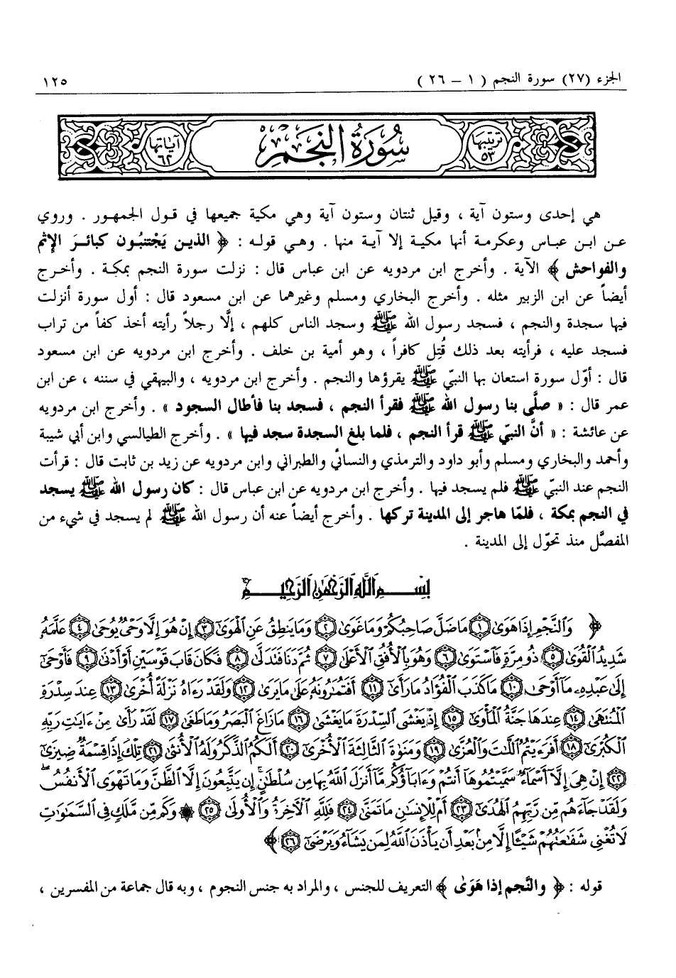 هي إحدى وستون آية، وقيل ثنتان وستون آية وَهِيَ مَكِّيَّةٌ جَمِيعُهَا فِي قَوْلِ الْجُمْهُورِ. وَرُوِيَ عَنِ ابْنِ عَبَّاسٍ وَعِكْرِمَةَ أَنَّهَا مَكِّيَّةٌ إِلَّا آيَةً مِنْهَا. وَهِيَ قَوْلُهُ: الَّذِينَ يَجْتَنِبُونَ كَبائِرَ الْإِثْمِ وَالْفَواحِشَ الْآيَةَ. وَأَخْرَجَ ابْنُ مَرْدَوَيْهِ عَنِ ابْنِ عَبَّاسٍ قَالَ: نَزَلَتْ سُورَةُ النَّجْمِ بِمَكَّةَ. وَأَخْرَجَ أَيْضًا عَنِ ابْنِ الزُّبَيْرِ مِثْلَهُ. وَأَخْرَجَ الْبُخَارِيُّ وَمُسْلِمٌ وغير هما عَنِ ابْنِ مَسْعُودٍ قَالَ: أَوَّلُ سُورَةٍ أُنْزِلَتْ فِيهَا سَجْدَةٌ وَالنَّجْمِ، فَسَجَدَ رَسُولُ اللَّهِ صَلَّى اللَّهُ عَلَيْهِ وَسَلَّمَ وَسَجَدَ النَّاسُ كُلُّهُمْ، إِلَّا رَجُلًا رَأَيْتُهُ أَخَذَ كَفًّا مِنْ تُرَابٍ فَسَجَدَ عَلَيْهِ، فَرَأَيْتُهُ بَعْدَ ذَلِكَ قُتِلَ كَافِرًا، وَهُوَ أُمَيَّةُ بْنُ خَلَفٍ. وَأَخْرَجَ ابْنُ مَرْدَوَيْهِ عَنِ ابْنِ مَسْعُودٍ قَالَ: أوّل سورة استعان بها النبيّ صلّى الله عليه وسلّم يقرؤها وَالنَّجْمِ. وَأَخْرَجَ ابْنُ مَرْدَوَيْهِ، وَالْبَيْهَقِيُّ فِي سُنَنِهِ، عَنِ ابْنِ عُمَرَ قَالَ: «صَلَّى بِنَا رَسُولُ اللَّهِ صَلَّى اللَّهُ عَلَيْهِ وَسَلَّمَ فَقَرَأَ النَّجْمَ، فَسَجَدَ بِنَا فَأَطَالَ السُّجُودَ» . وَأَخْرَجَ ابْنُ مَرْدَوَيْهِ عَنْ عَائِشَةَ: «أَنَّ النَّبِيَّ صَلَّى اللَّهُ عَلَيْهِ وَسَلَّمَ قَرَأَ النَّجْمَ، فَلَمَّا بَلَغَ السَّجْدَةَ سَجَدَ فِيهَا» . وَأَخْرَجَ الطَّيَالِسِيُّ وَابْنُ أَبِي شَيْبَةَ وَأَحْمَدُ وَالْبُخَارِيُّ وَمُسْلِمٌ وَأَبُو دَاوُدَ وَالتِّرْمِذِيُّ وَالنَّسَائِيُّ وَالطَّبَرَانِيُّ وَابْنُ مَرْدَوَيْهِ عَنْ زَيْدِ بْنِ ثَابِتٍ قَالَ: قَرَأْتُ النَّجْمَ عِنْدَ النَّبِيِّ صَلَّى اللَّهُ عَلَيْهِ وَسَلَّمَ فَلَمْ يَسْجُدْ فِيهَا. وَأَخْرَجَ ابْنُ مَرْدَوَيْهِ عَنِ ابْنِ عَبَّاسٍ قَالَ: كَانَ رَسُولُ اللَّهِ صَلَّى اللَّهُ عَلَيْهِ وَسَلَّمَ يَسْجُدُ فِي النَّجْمِ بِمَكَّةَ، فَلَمَّا هَاجَرَ إِلَى الْمَدِينَةِ تَرَكَهَا. وَأَخْرَجَ أَيْضًا عَنْهُ أَنَّ رَسُولَ اللَّهِ صَلَّى اللَّهُ عَلَيْهِ وَسَلَّمَ لَمْ يَسْجُدْ فِي شَيْءٍ مِنَ الْمُفَصَّلِ مُنْذُ تَحَوَّلَ إِلَى الْمَدِينَةِ.