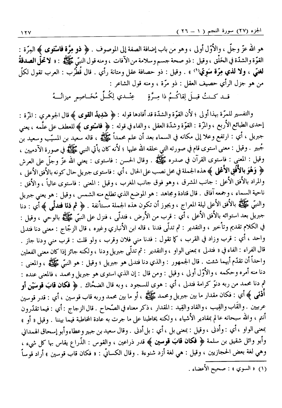 إِحْدَى الطَّبَائِعِ الْأَرْبَعِ، وَالْمِرَّةُ: الْقُوَّةُ وَشِدَّةُ الْعَقْلِ، وَالْفَاءُ فِي قَوْلِهِ: فَاسْتَوى لِلْعَطْفِ عَلَى عَلَّمَهُ، يعني جبريل، أي: ارتفع وعلا إِلَى مَكَانِهِ فِي السَّمَاءِ بَعْدَ أَنْ عَلَّمَ مُحَمَّدًا صَلَّى اللَّهُ عَلَيْهِ وَسَلَّمَ، قَالَهُ سَعِيدُ بْنُ الْمُسَيَّبِ وَسَعِيدُ بْنُ جُبَيْرٍ. وَقِيلَ: مَعْنَى اسْتَوَى قَامَ فِي صُورَتِهِ الَّتِي خَلَقَهُ اللَّهُ عَلَيْهَا لِأَنَّهُ كَانَ يَأْتِي النَّبِيَّ صَلَّى اللَّهُ عَلَيْهِ وَسَلَّمَ فِي صُورَةِ الْآدَمِيِّينَ، وَقِيلَ: الْمَعْنَى: فَاسْتَوَى الْقُرْآنُ فِي صَدْرِهِ صَلَّى اللَّهُ عَلَيْهِ وَسَلَّمَ. وَقَالَ الْحَسَنُ: فَاسْتَوَى: يَعْنِي اللَّهَ عَزَّ وَجَلَّ عَلَى الْعَرْشِ وَهُوَ بِالْأُفُقِ الْأَعْلى هَذِهِ الْجُمْلَةُ فِي مَحَلِّ نَصْبٍ عَلَى الْحَالِ، أَيْ: فَاسْتَوَى جِبْرِيلُ حَالَ كَوْنِهِ بِالْأُفُقِ الْأَعْلَى، وَالْمُرَادُ بِالْأُفُقِ الْأَعْلَى: جَانِبُ الْمَشْرِقِ، وَهُوَ فَوْقَ جَانِبِ الْمَغْرِبِ، وَقِيلَ: الْمَعْنَى: فَاسْتَوَى عَالِيًا، وَالْأُفُقُ:
