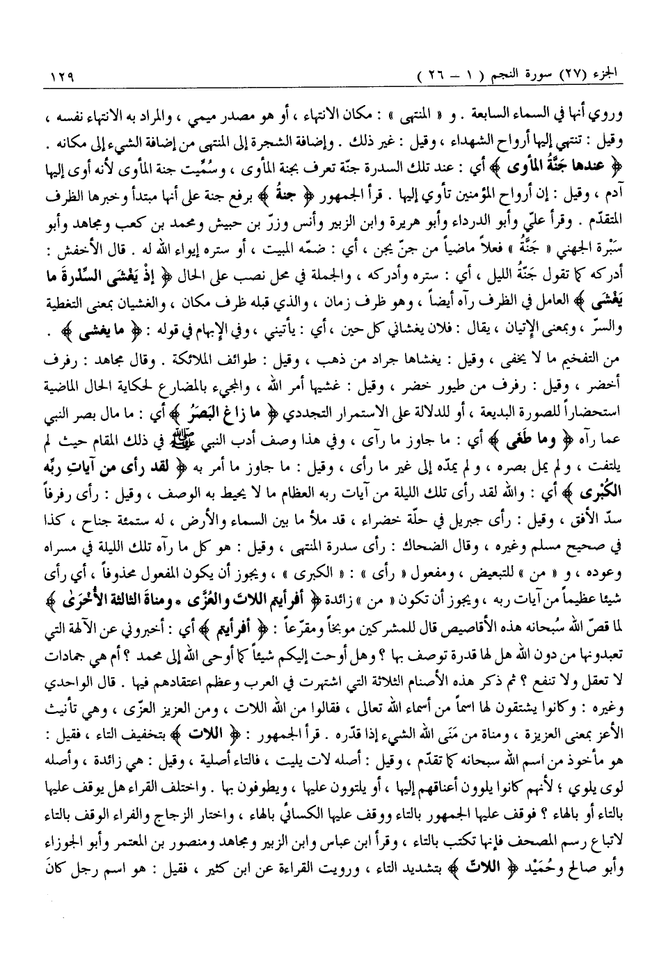 مِنَ التَّفْخِيمِ مَا لَا يَخْفَى، وَقِيلَ: يغشاها جراد من ذهب، وقيل: طوائف الْمَلَائِكَةِ. وَقَالَ مُجَاهِدٌ: رَفْرَفٌ أَخْضَرُ، وَقِيلَ: رَفْرَفٌ مِنْ طُيُورٍ خُضْرٍ، وَقِيلَ: غَشِيَهَا أَمْرُ اللَّهِ، وَالْمَجِيءُ بِالْمُضَارِعِ لِحِكَايَةِ الْحَالِ الْمَاضِيَةِ اسْتِحْضَارًا لِلصُّورَةِ الْبَدِيعَةِ، أَوْ لِلدَّلَالَةِ عَلَى الِاسْتِمْرَارِ التَّجَدُّدِيِّ مَا زاغَ الْبَصَرُ أَيْ: مَا مَالَ بَصَرُ النَّبِيِّ عَمَّا رَآهُ وَما طَغى أَيْ: مَا جَاوَزَ مَا رَأَى، وَفِي هَذَا وَصْفُ أَدَبِ النَّبِيِّ صَلَّى اللَّهُ عَلَيْهِ وَسَلَّمَ فِي ذَلِكَ الْمَقَامِ حَيْثُ لَمْ يَلْتَفِتْ، وَلَمْ يَمِلْ بَصَرُهُ، وَلَمْ يَمُدَّهُ إِلَى غَيْرِ مَا رَأَى، وَقِيلَ: مَا جَاوَزَ مَا أُمِرَ بِهِ لَقَدْ رَأى مِنْ آياتِ رَبِّهِ الْكُبْرى أَيْ: وَاللَّهِ لَقَدْ رَأَى تِلْكَ اللَّيْلَةَ مِنْ آيَاتِ رَبِّهِ الْعِظَامِ مَا لا يحيط به الوصف، وقيل: رَأَى رَفْرَفًا سَدَّ الْأُفُقَ، وَقِيلَ: رَأَى جِبْرِيلَ فِي حُلَّةٍ خَضْرَاءَ، قَدْ مَلَأَ مَا بَيْنَ السَّمَاءِ وَالْأَرْضِ، لَهُ سِتُّمِائَةِ جَنَاحٍ، كَذَا فِي صَحِيح مُسْلِمٍ وَغَيْرِهِ، وَقَالَ الضَّحَّاكُ: رَأَى سِدْرَةَ الْمُنْتَهَى، وَقِيلَ: هُوَ كُلُّ مَا رَآهُ تِلْكَ اللَّيْلَةَ فِي مَسْرَاهُ وَعَوْدِهِ، وَ «مِنْ» لِلتَّبْعِيضِ، وَمَفْعُولُ «رَأَى» : «الْكُبْرَى» ، وَيَجُوزُ أَنْ يَكُونَ الْمَفْعُولُ مَحْذُوفًا، أَيْ رَأَى شَيْئًا عَظِيمًا مِنْ آيَاتِ رَبِّهِ، وَيَجُوزُ أَنْ تَكُونَ «مِنْ» زَائِدَةً أَفَرَأَيْتُمُ اللَّاتَ وَالْعُزَّى- وَمَناةَ الثَّالِثَةَ الْأُخْرى لَمَّا قَصَّ اللَّهُ سُبْحَانَهُ هَذِهِ الْأَقَاصِيصَ قَالَ لِلْمُشْرِكِينَ مُوَبِّخًا وَمُقَرِّعًا: أَفَرَأَيْتُمُ أَيْ: أَخْبِرُونِي عَنِ الْآلِهَةِ الَّتِي تَعْبُدُونَهَا مِنْ دُونِ اللَّهِ هَلْ لَهَا قُدْرَةٌ تُوصَفُ بِهَا؟ وَهَلْ أَوْحَتْ إِلَيْكُمْ شَيْئًا كَمَا أَوْحَى اللَّهُ إِلَى مُحَمَّدٍ؟ أَمْ هِيَ جَمَادَاتٌ لَا تَعْقِلُ وَلَا تَنْفَعُ؟ ثُمَّ ذَكَرَ هَذِهِ الْأَصْنَامَ الثَّلَاثَةَ الَّتِي اشْتُهِرَتْ فِي الْعَرَبِ وَعَظُمَ اعْتِقَادُهُمْ فِيهَا. قَالَ الْوَاحِدِيُّ وَغَيْرُهُ: وَكَانُوا يَشْتَقُّونَ لها اسما مِنْ أَسْمَاءِ اللَّهِ تَعَالَى، فَقَالُوا مِنَ اللَّهِ اللَّاتَ، وَمِنَ الْعَزِيزِ الْعُزَّى، وَهِيَ تَأْنِيثُ الْأَعَزِّ بِمَعْنَى الْعَزِيزَةِ، وَمَنَاةَ مِنْ مَنَى اللَّهُ الشَّيْءَ إِذَا قَدَّرَهُ. قَرَأَ الْجُمْهُورُ: اللَّاتَ بِتَخْفِيفِ التَّاءِ، فَقِيلَ: