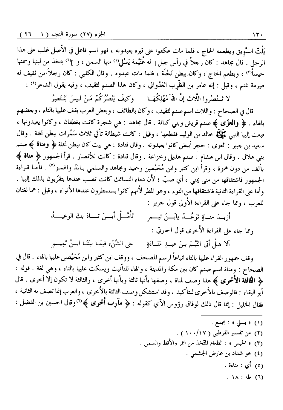 قَالَ فِي الصِّحَاحِ: وَاللَّاتُ اسْمُ صَنَمٍ لِثَقِيفٍ، وَكَانَ بِالطَّائِفِ، وَبَعْضُ الْعَرَبِ يَقِفُ عَلَيْهَا بِالتَّاءِ، وَبَعْضُهُمْ بِالْهَاءِ. وَالْعُزَّى صَنَمُ قُرَيْشٍ وَبَنِي كِنَانَةَ. قَالَ مُجَاهِدٌ: هِيَ شَجَرَةٌ كَانَتْ بِغَطَفَانَ، وَكَانُوا يَعْبُدُونَهَا، فَبَعَثَ إِلَيْهَا النَّبِيُّ صَلَّى اللَّهُ عَلَيْهِ وَسَلَّمَ خَالِدَ بْنَ الْوَلِيدِ فَقَطَعَهَا، وَقِيلَ: كَانَتْ شَيْطَانَةٌ تَأْتِي ثَلَاثَ سَمُرَاتٍ بِبَطْنِ نَخْلَةَ. وَقَالَ سَعِيدُ بْنُ جُبَيْرٍ: الْعُزَّى: حَجَرٌ أَبْيَضٌ كَانُوا يَعْبُدُونَهُ. وَقَالَ قَتَادَةُ: هِيَ بَيْتٌ كَانَ بِبَطْنِ نَخْلَةَ وَمَناةَ صَنَمُ بَنِي هِلَالٍ. وَقَالَ ابْنُ هِشَامٍ: صَنَمُ هُذَيْلٍ وَخُزَاعَةَ. وَقَالَ قَتَادَةُ: كَانَتْ لِلْأَنْصَارِ. قَرَأَ الْجُمْهُورُ مَناةَ بِأَلِفٍ مِنْ دُونِ هَمْزَةٍ، وَقَرَأَ ابْنُ كَثِيرٍ وَابْنُ مُحَيْصِنٍ وَحُمَيْدٌ وَمُجَاهِدٌ وَالسُّلَمِيُّ بِالْمَدِّ وَالْهَمْزِ «5» . فَأَمَّا قِرَاءَةُ الْجُمْهُورِ فَاشْتِقَاقُهَا مِنْ مَنَى يَمْنَى، أَيْ صَبَّ لِأَنَّ دِمَاءَ النَّسَائِكِ كَانَتْ تُصَبُّ عِنْدَهَا يَتَقَرَّبُونَ بِذَلِكَ إِلَيْهَا.