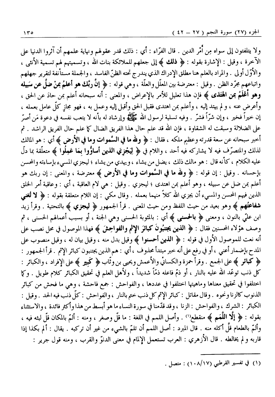 وَلَا يَلْتَفِتُونَ إِلَى سِوَاهُ مِنْ أَمْرِ الدِّينِ. قَالَ الْفَرَّاءُ: أَيْ: ذَلِكَ قَدْرُ عُقُولِهِمْ وَنِهَايَةُ عِلْمِهِمْ أَنْ آثَرُوا الدُّنْيَا عَلَى الْآخِرَةِ، وَقِيلَ: الْإِشَارَةُ بِقَوْلِهِ: ذلِكَ إِلَى جَعْلِهِمْ لِلْمَلَائِكَةِ بَنَاتِ اللَّهِ، وَتَسْمِيَتِهِمْ لَهُمْ تَسْمِيَةَ الْأُنْثَى، وَالْأَوَّلُ أَوْلَى. وَالْمُرَادُ بِالْعِلْمِ هَنَا مُطْلَقُ الْإِدْرَاكِ الَّذِي يَنْدَرِجُ تَحْتَهُ الظَّنُّ الْفَاسِدُ، وَالْجُمْلَةُ مُسْتَأْنَفَةٌ لِتَقْرِيرِ جَهْلِهِمْ وَاتِّبَاعِهِمْ مُجَرَّدَ الظَّنِّ. وَقِيلَ: مُعْتَرِضَةٌ بَيْنَ الْمُعَلَّلِ وَالْعِلَّةِ، وَهِيَ قَوْلُهُ: إِنَّ رَبَّكَ هُوَ أَعْلَمُ بِمَنْ ضَلَّ عَنْ سَبِيلِهِ وَهُوَ أَعْلَمُ بِمَنِ اهْتَدى فَإِنَّ هَذَا تَعْلِيلٌ لِلْأَمْرِ بِالْإِعْرَاضِ، وَالْمَعْنَى: أَنَّهُ سُبْحَانَهُ أَعْلَمُ بِمَنْ حَادَ عَنِ الْحَقِّ، وَأَعْرَضَ عَنْهُ، وَلَمْ يَهْتَدِ إِلَيْهِ، وَأَعْلَمُ بِمَنِ اهْتَدَى فَقَبِلَ الْحَقَّ وَأَقْبَلَ إِلَيْهِ وَعَمِلَ بِهِ، فَهُوَ مُجَازٍ كُلَّ عَامِلٍ بِعَمَلِهِ، إِنْ خَيْرًا فَخَيْرٌ، وَإِنْ شَرًّا فَشَرٌّ. وَفِيهِ تَسْلِيَةٌ لِرَسُولِ اللَّهِ صَلَّى اللَّهُ عَلَيْهِ وَسَلَّمَ وَإِرْشَادٌ لَهُ بأنه لَا يُتْعِبَ نَفْسَهُ فِي دَعْوَةِ مَنْ أَصَرَّ عَلَى الضَّلَالَةِ وَسَبَقَتْ لَهُ الشَّقَاوَةُ، فَإِنَّ اللَّهَ قَدْ عَلِمَ حَالَ هَذَا الْفَرِيقِ الضَّالِّ كَمَا عَلِمَ حَالَ الْفَرِيقِ الرَّاشِدِ. ثُمَّ أَخْبَرَ سُبْحَانَهُ عَنْ سَعَةِ قُدْرَتِهِ وَعَظِيمِ مُلْكِهِ، فَقَالَ: وَلِلَّهِ مَا فِي السَّماواتِ وَما فِي الْأَرْضِ أَيْ: هُوَ الْمَالِكُ لِذَلِكَ وَالْمُتَصَرِّفُ فِيهِ لَا يُشَارِكُهُ فيه أحد، واللام في لِيَجْزِيَ الَّذِينَ أَساؤُا بِما عَمِلُوا مُتَعَلِّقَةٌ بِمَا دَلَّ عَلَيْهِ الْكَلَامُ، كَأَنَّهُ قَالَ: هُوَ مَالِكُ ذَلِكَ، يُضِلُّ مَنْ يَشَاءُ، وَيَهْدِي مَنْ يَشَاءُ لِيَجْزِيَ الْمُسِيءَ بِإِسَاءَتِهِ وَالْمُحْسِنَ بِإِحْسَانِهِ. وَقِيلَ: إِنَّ قَوْلُهُ: وَلِلَّهِ مَا فِي السَّماواتِ وَما فِي الْأَرْضِ مُعْتَرِضَةٌ، وَالْمَعْنَى: إِنَّ رَبَّكَ هُوَ أَعْلَمُ بِمَنْ ضَلَّ عَنْ سَبِيلِهِ، وَهُوَ أَعْلَمُ بِمَنِ اهْتَدَى لِيَجْزِيَ. وَقِيلَ: هِيَ لَامُ الْعَاقِبَةِ، أَيْ: وَعَاقِبَةُ أَمْرِ الْخَلْقِ الَّذِينَ فِيهِمُ الْمُحْسِنُ وَالْمُسِيءُ أَنْ يَجْزِيَ اللَّهُ كُلًّا مِنْهُمَا بِعَمَلِهِ. وَقَالَ مَكِّيٌّ: إِنَّ اللَّامَ مُتَعَلِّقَةٌ بِقَوْلِهِ: لَا تُغْنِي شَفاعَتُهُمْ وَهُوَ بَعِيدٌ مِنْ حَيْثُ اللَّفْظِ وَمِنْ حَيْثُ الْمَعْنَى. قَرَأَ الجمهور لِيَجْزِيَ بالتحتية. وقرأ زيد ابن عَلِيٍّ بِالنُّونِ، وَمَعْنَى بِالْحُسْنَى أَيْ: بِالْمَثُوبَةِ الْحُسْنَى وَهِيَ الْجَنَّةُ، أَوْ بِسَبَبِ أَعْمَالِهِمُ الْحُسْنَى، ثُمَّ وَصَفَ هَؤُلَاءِ الْمُحْسِنِينَ فَقَالَ: الَّذِينَ يَجْتَنِبُونَ كَبائِرَ الْإِثْمِ وَالْفَواحِشَ فَهَذَا