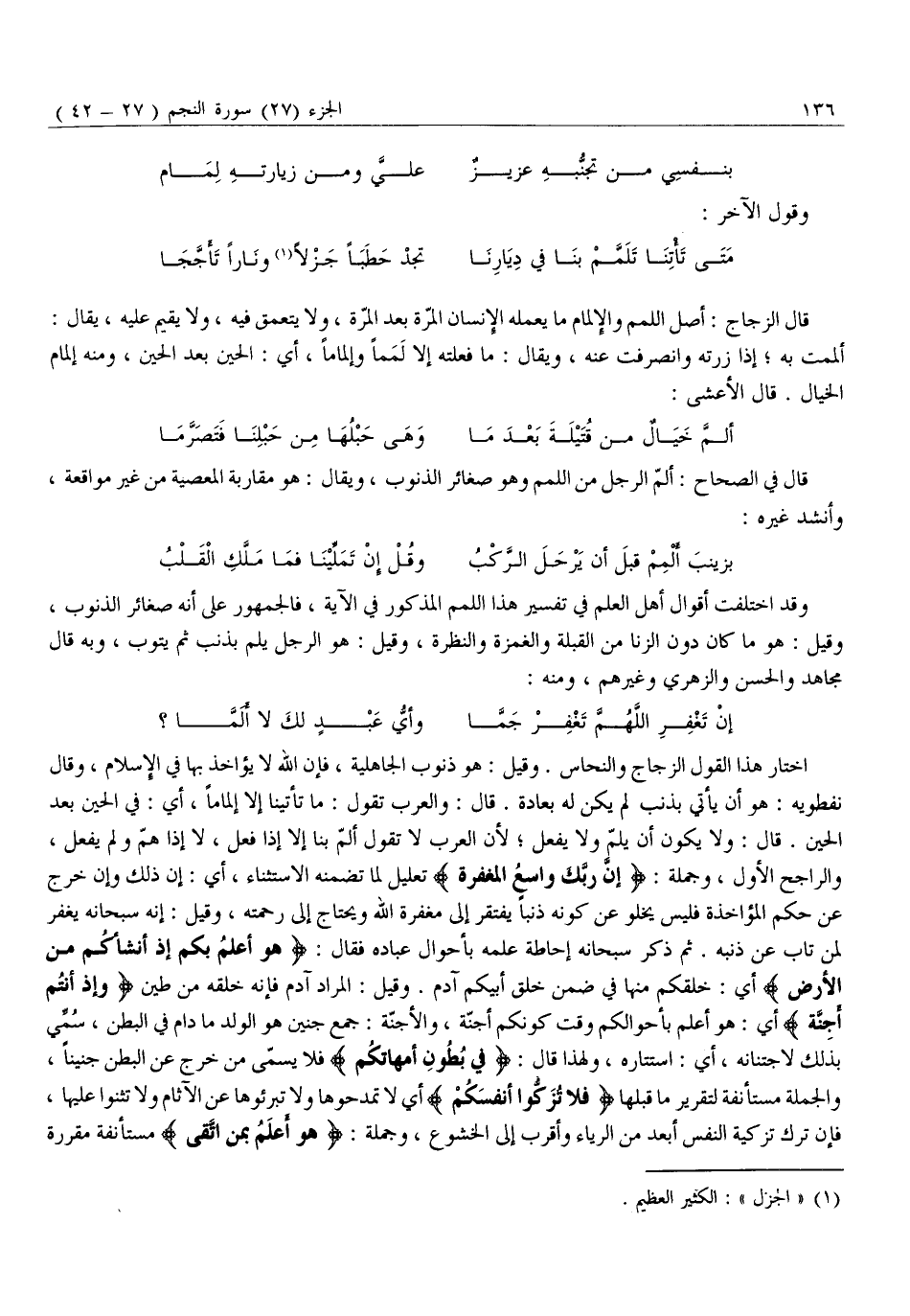 اخْتَارَ هَذَا الْقَوْلَ الزَّجَّاجُ وَالنَّحَّاسُ. وَقِيلَ: هُوَ ذُنُوبُ الْجَاهِلِيَّةِ، فَإِنَّ اللَّهَ لَا يُؤَاخِذُ بِهَا فِي الْإِسْلَامِ، وَقَالَ نِفْطَوَيْهِ: هُوَ أَنْ يأتي بذنب لم يكن له بعبادة. قَالَ: وَالْعَرَبُ تَقُولُ: مَا تَأْتِينَا إِلَّا إِلْمَامًا، أَيْ: فِي الْحِينِ بَعْدَ الْحِينِ. قَالَ: وَلَا يَكُونُ أَنْ يُلِمَّ وَلَا يَفْعَلَ لِأَنَّ الْعَرَبَ لَا تَقُولُ أَلَمَّ بِنَا إِلَّا إِذَا فَعَلَ، لَا إِذَا هَمَّ وَلَمْ يَفْعَلْ، وَالرَّاجِحُ الْأَوَّلُ، وَجُمْلَةُ: إِنَّ رَبَّكَ واسِعُ الْمَغْفِرَةِ تَعْلِيلٌ لِمَا تَضَمَّنَهُ الِاسْتِثْنَاءُ، أَيْ: إِنْ ذَلِكَ وَإِنْ خَرَجَ عَنْ حُكْمِ الْمُؤَاخَذَةِ فَلَيْسَ يَخْلُو عَنْ كَوْنِهِ ذَنْبًا يَفْتَقِرُ إِلَى مَغْفِرَةِ اللَّهِ وَيَحْتَاجُ إِلَى رَحْمَتِهِ، وَقِيلَ: إِنَّهُ سُبْحَانَهُ يَغْفِرُ لِمَنْ تَابَ عَنْ ذَنْبِهِ. ثُمَّ ذَكَرَ سُبْحَانَهُ إِحَاطَةَ عِلْمِهِ بِأَحْوَالِ عِبَادِهِ فَقَالَ: هُوَ أَعْلَمُ بِكُمْ إِذْ أَنْشَأَكُمْ مِنَ الْأَرْضِ أَيْ: خَلَقَكُمْ مِنْهَا فِي ضِمْنِ خَلْقِ أَبِيكُمْ آدَمَ. وَقِيلَ: الْمُرَادُ آدَمُ فَإِنَّهُ خَلَقَهُ مِنْ طِينٍ وَإِذْ أَنْتُمْ أَجِنَّةٌ أَيْ: هُوَ أَعْلَمُ بِأَحْوَالِكُمْ وَقْتَ كَوْنِكُمْ أَجِنَّةً، والأجنّة: جمع جنين هو الْوَلَدُ مَا دَامَ فِي الْبَطْنِ، سُمِّيَ بِذَلِكَ لِاجْتِنَانِهِ، أَيِ: اسْتِتَارِهِ، وَلِهَذَا قَالَ: فِي بُطُونِ أُمَّهاتِكُمْ فَلَا يُسَمَّى مَنْ خَرَجَ عَنِ الْبَطْنِ جَنِينًا، وَالْجُمْلَةُ مُسْتَأْنَفَةٌ لِتَقْرِيرِ مَا قَبْلَهَا فَلا تُزَكُّوا أَنْفُسَكُمْ أَيْ لَا تَمْدَحُوهَا وَلَا تُبَرِّئُوهَا عَنِ الْآثَامِ وَلَا تُثْنُوا عَلَيْهَا، فَإِنَّ تَرْكَ تَزْكِيَةِ النَّفْسِ أَبْعَدُ مِنَ الرِّيَاءِ وَأَقْرَبُ إِلَى الْخُشُوعِ، وَجُمْلَةُ: هُوَ أَعْلَمُ بِمَنِ اتَّقى مُسْتَأْنَفَةٌ مقررة