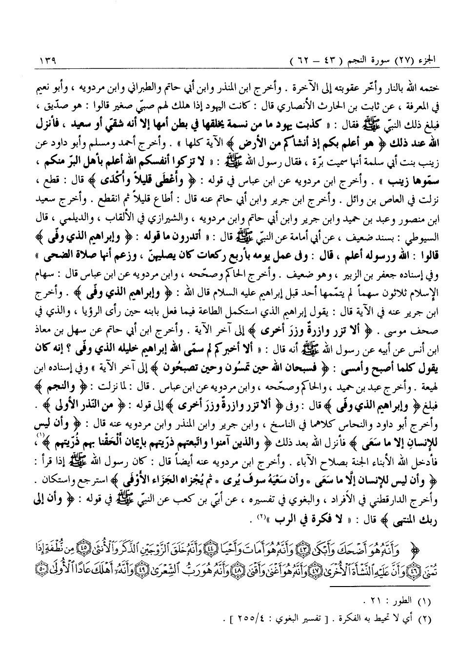 خَتَمَهُ اللَّهُ بِالنَّارِ وَأَخَّرَ عُقُوبَتَهُ إِلَى الْآخِرَةِ. وَأَخْرَجَ ابْنُ الْمُنْذِرِ وَابْنُ أَبِي حَاتِمٍ وَالطَّبَرَانِيُّ وَابْنُ مَرْدَوَيْهِ، وَأَبُو نُعَيْمٍ فِي الْمَعْرِفَةِ، عَنْ ثَابِتِ بْنِ الْحَارِثِ الْأَنْصَارِيِّ قَالَ: كَانَتِ الْيَهُودُ إِذَا هَلَكَ لَهُمْ صَبِيٌّ صَغِيرٌ قَالُوا: هُوَ صِدِّيقٌ، فَبَلَغَ ذَلِكَ النَّبِيَّ صَلَّى اللَّهُ عَلَيْهِ وَسَلَّمَ فَقَالَ: «كَذَبَتْ يَهُودُ مَا مِنْ نَسَمَةٍ يَخْلُقُهَا فِي بَطْنِ أُمِّهَا إِلَّا أَنَّهُ شَقِيٌّ أَوْ سَعِيدٌ، فَأَنْزَلَ اللَّهُ عِنْدَ ذَلِكَ هُوَ أَعْلَمُ بِكُمْ إِذْ أَنْشَأَكُمْ مِنَ الْأَرْضِ الْآيَةَ كُلَّهَا» . وَأَخْرَجَ أَحْمَدُ وَمُسْلِمٌ وَأَبُو دَاوُدَ عَنْ زَيْنَبَ بِنْتِ أَبِي سَلَمَةَ أَنَّهَا سُمِّيَتْ بَرَّةَ، فَقَالَ رَسُولُ اللَّهِ صَلَّى اللَّهُ عَلَيْهِ وَسَلَّمَ: «لَا تُزَكُّوا أَنْفُسَكُمُ اللَّهُ أَعْلَمُ بِأَهْلِ الْبِرِّ مِنْكُمْ، سَمُّوهَا زَيْنَبَ» . وَأَخْرَجَ ابْنُ مَرْدَوَيْهِ عَنِ ابْنِ عَبَّاسٍ فِي قَوْلِهِ: وَأَعْطى قَلِيلًا وَأَكْدى قَالَ: قَطَعَ، نَزَلَتْ فِي الْعَاصِ بْنِ وَائِلٍ. وَأَخْرَجَ ابْنُ جَرِيرٍ وَابْنُ أَبِي حَاتِمٍ عَنْهُ قَالَ: أَطَاعَ قَلِيلًا ثُمَّ انْقَطَعَ. وَأَخْرَجَ سَعِيدُ ابن مَنْصُورٍ وَعَبْدُ بْنُ حُمَيْدٍ وَابْنُ جَرِيرٍ وَابْنُ أَبِي حَاتِمٍ وَابْنُ مَرْدَوَيْهِ، وَالشِّيرَازِيُّ فِي الْأَلْقَابِ، وَالدَّيْلَمِيُّ، قَالَ السُّيُوطِيُّ: بِسَنَدٍ ضَعِيفٍ، عَنْ أَبِي أُمَامَةَ عَنِ النَّبِيِّ صَلَّى اللَّهُ عَلَيْهِ وَسَلَّمَ قَالَ: «أَتَدْرُونَ مَا قَوْلُهُ: وَإِبْراهِيمَ الَّذِي وَفَّى قَالُوا: اللَّهُ وَرَسُولُهُ أَعْلَمُ، قَالَ: وَفَّى عَمَلَ يَوْمِهِ بِأَرْبَعِ رَكَعَاتٍ كَانَ يُصَلِّيهِنَّ، وَزَعَمَ أَنَّهَا صَلَاةُ الضُّحَى» وَفِي إِسْنَادِهِ جَعْفَرُ بْنُ الزُّبَيْرِ، وَهُوَ ضَعِيفٌ. وَأَخْرَجَ الْحَاكِمُ وَصَحَّحَهُ، وَابْنُ مَرْدَوَيْهِ عَنِ ابْنِ عَبَّاسٍ قَالَ: سِهَامُ الْإِسْلَامِ ثَلَاثُونَ سَهْمًا لَمْ يُتَمِّمْهَا أَحَدٌ قَبْلَ إِبْرَاهِيمَ عَلَيْهِ السَّلَامُ قَالَ اللَّهُ: وَإِبْراهِيمَ الَّذِي وَفَّى. وَأَخْرَجَ ابْنُ جَرِيرٍ عَنْهُ فِي الْآيَةِ قَالَ: يَقُولُ إِبْرَاهِيمُ الَّذِي اسْتَكْمَلَ الطَّاعَةَ فِيمَا فَعَلَ بِابْنِهِ حِينَ رَأَى الرُّؤْيَا، وَالَّذِي فِي صُحُفِ مُوسَى. أَلَّا تَزِرُ وازِرَةٌ وِزْرَ أُخْرى إِلَى آخِرِ الْآيَةِ. وَأَخْرَجَ ابْنُ أَبِي حَاتِمٍ عَنْ سَهْلِ بن معاذ ابن أَنَسٍ عَنْ أَبِيهِ عَنْ رَسُولِ اللَّهِ صَلَّى اللَّهُ عَلَيْهِ وَسَلَّمَ أَنَّهُ قَالَ: «أَلَا أُخْبِرُكُمْ لِمَ سَمَّى اللَّهُ إِبْرَاهِيمَ خَلِيلَهُ الَّذِي وَفَّى؟ إِنَّهُ كَانَ يَقُولُ كُلَّمَا أَصْبَحَ وَأَمْسَى: فَسُبْحانَ اللَّهِ حِينَ تُمْسُونَ وَحِينَ تُصْبِحُونَ إِلَى آخِرِ الْآيَةِ» وَفِي إِسْنَادِهِ ابْنُ لَهِيعَةَ. وَأَخْرَجَ عَبْدُ بْنُ حُمَيْدٍ، وَالْحَاكِمُ وَصَحَّحَهُ، وَابْنُ مَرْدَوَيْهِ عَنِ ابْنِ عَبَّاسٍ. قَالَ: لَمَّا نَزَلَتْ: وَالنَّجْمِ فَبَلَغَ وَإِبْراهِيمَ الَّذِي وَفَّى قَالَ: وَفَّى أَلَّا تَزِرُ وازِرَةٌ وِزْرَ أُخْرى إِلَى قَوْلِهِ: مِنَ النُّذُرِ الْأُولى.