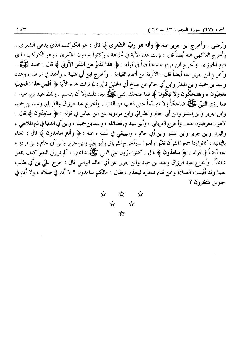 فَمَا رُؤِيَ النَّبِيُّ صَلَّى اللَّهُ عَلَيْهِ وَسَلَّمَ ضَاحِكًا وَلَا مُتَبَسِّمًا حَتَّى ذَهَبَ مِنَ الدُّنْيَا. وَأَخْرَجَ عَبْدُ الرَّزَّاقِ وَالْفِرْيَابِيُّ وَعَبْدُ بْنُ حُمَيْدٍ وَابْنُ جَرِيرٍ وَابْنُ الْمُنْذِرِ وَابْنُ أَبِي حَاتِمٍ وَالطَّبَرَانِيُّ وَابْنُ مَرْدَوَيْهِ عَنِ ابْنِ عَبَّاسٍ فِي قَوْلِهِ: سامِدُونَ قَالَ: