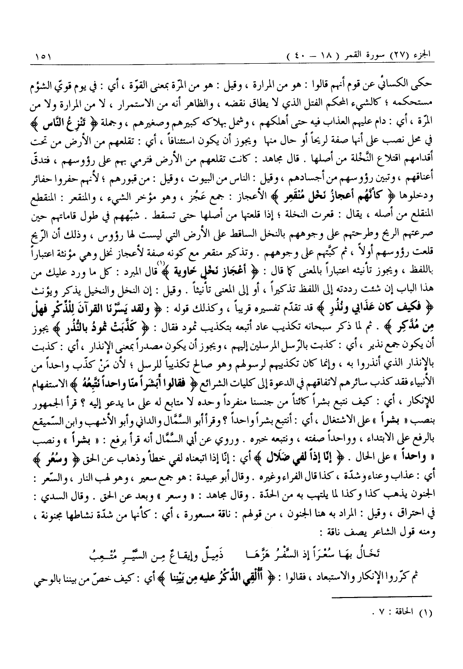 حَكَى الْكِسَائِيُّ عَنْ قَوْمٍ أَنَّهُمْ قَالُوا: هُوَ مِنَ الْمَرَارَةِ، وَقِيلَ: هُوَ مِنَ الْمِرَّةِ بِمَعْنَى الْقُوَّةِ، أَيْ: فِي يَوْمٍ قَوِيِّ الشُّؤْمِ مُسْتَحْكَمِهِ كَالشَّيْءِ الْمُحْكَمِ الْفَتْلِ الَّذِي لَا يُطَاقُ نَقْضُهُ، وَالظَّاهِرُ أَنَّهُ مِنَ الِاسْتِمْرَارِ، لَا مِنَ الْمَرَارَةِ وَلَا مِنَ الْمِرَّةِ، أَيْ: دَامَ عَلَيْهِمُ الْعَذَابُ فِيهِ حَتَّى أَهْلَكَهُمْ، وَشَمَلَ بِهَلَاكِهِ كَبِيرَهُمْ وَصَغِيرَهُمْ، وَجُمْلَةُ تَنْزِعُ النَّاسَ فِي مَحَلِّ نَصْبٍ عَلَى أنها صفة لريحا أَوْ حَالٌ مِنْهَا وَيَجُوزُ أَنْ يَكُونَ اسْتِئْنَافًا، أَيْ: تَقْلَعُهُمْ مِنَ الْأَرْضِ مِنْ تَحْتِ أَقْدَامِهِمُ اقْتِلَاعَ النَّخْلَةِ مِنْ أَصْلِهَا. قَالَ مُجَاهِدٌ: كَانَتْ تَقْلَعُهُمْ مِنَ الْأَرْضِ فَتَرْمِي بِهِمْ عَلَى رُؤُوسِهِمْ، فَتَدُقُّ أَعْنَاقَهُمْ، وَتُبَيِّنُ رُؤُوسَهُمْ مِنْ أَجْسَادِهِمْ، وَقِيلَ: النَّاسَ مِنَ الْبُيُوتِ، وَقِيلَ: مِنْ قُبُورِهِمْ لِأَنَّهُمْ حَفَرُوا حَفَائِرَ وَدَخَلُوهَا كَأَنَّهُمْ أَعْجازُ نَخْلٍ مُنْقَعِرٍ الْأَعْجَازُ: جَمْعُ عَجُزٍ، وَهُوَ مُؤَخَّرُ الشَّيْءِ، وَالْمُنْقَعِرُ: الْمُنْقَطِعُ الْمُنْقَلِعُ مِنْ أَصْلِهِ، يُقَالُ: قَعَّرْتُ النَّخْلَةَ إِذَا قَلَعْتُهَا مِنْ أَصْلِهَا حَتَّى تَسْقُطَ. شَبَّهَهُمْ فِي طُولِ قَامَاتِهِمْ حِينَ صَرَعَتْهُمُ الرِّيحُ وَطَرَحَتْهُمْ عَلَى وُجُوهِهِمْ بِالنَّخْلِ السَّاقِطِ عَلَى الْأَرْضِ الَّتِي لَيْسَتْ لَهَا رُؤُوسٌ، وَذَلِكَ أَنَّ الرِّيحَ قَلَعَتْ رُؤُوسَهُمْ أَوَّلًا، ثُمَّ كَبَّتْهُمْ عَلَى وُجُوهِهِمْ. وَتَذْكِيرُ مُنْقَعِرٍ مَعَ كَوْنِهِ صِفَةً لِأَعْجَازِ نَخْلٍ وَهِيَ مُؤَنَّثَةٌ اعْتِبَارًا بِاللَّفْظِ، وَيَجُوزُ تَأْنِيثُهُ اعْتِبَارًا بِالْمَعْنَى كما قال: أَعْجازُ نَخْلٍ خاوِيَةٍ «1» قَالَ الْمُبَرِّدُ: كُلُّ مَا وَرَدَ عَلَيْكَ مِنْ هَذَا الْبَابِ إِنْ شِئْتَ رَدَدْتَهُ إِلَى اللَّفْظِ تَذْكِيرًا، أَوْ إِلَى الْمَعْنَى تَأْنِيثًا. وَقِيلَ: إِنَّ النَّخْلَ وَالنَّخِيلَ يُذَكَّرُ وَيُؤَنَّثُ فَكَيْفَ كانَ عَذابِي وَنُذُرِ قَدْ تَقَدَّمَ تَفْسِيرُهُ قَرِيبًا، وَكَذَلِكَ قَوْلُهُ: وَلَقَدْ يَسَّرْنَا الْقُرْآنَ لِلذِّكْرِ فَهَلْ مِنْ مُدَّكِرٍ. ثُمَّ لَمَّا ذَكَرَ سُبْحَانَهُ تَكْذِيبَ عَادٍ أَتْبَعَهُ بِتَكْذِيبِ ثَمُودٍ فَقَالَ: كَذَّبَتْ ثَمُودُ بِالنُّذُرِ يَجُوزُ أَنْ يَكُونَ جَمْعَ نَذِيرٍ، أَيْ: كَذَّبَتْ بِالرُّسُلِ الْمُرْسَلِينَ إِلَيْهِمْ، وَيَجُوزُ أَنْ يَكُونَ مَصْدَرًا بِمَعْنَى الْإِنْذَارِ، أَيْ: كَذَّبَتْ بِالْإِنْذَارِ الَّذِي أُنْذِرُوا بِهِ، وَإِنَّمَا كَانَ تَكْذِيبُهُمْ لِرَسُولِهِمْ وَهُوَ صَالِحٌ تَكْذِيبًا لِلرُّسُلِ لِأَنَّ مَنْ كَذَّبَ وَاحِدًا مِنَ الْأَنْبِيَاءِ فَقَدْ كَذَّبَ سَائِرَهُمْ لِاتِّفَاقِهِمْ فِي الدَّعْوَةِ إِلَى كُلِّيَّاتِ الشَّرَائِعِ فَقالُوا أَبَشَراً مِنَّا واحِداً نَتَّبِعُهُ الِاسْتِفْهَامُ لِلْإِنْكَارِ، أَيْ: كَيْفَ نَتَّبِعُ بَشَرًا كَائِنًا مِنْ جِنْسِنَا مُنْفَرِدًا وَحْدَهُ لَا مُتَابِعَ لَهُ عَلَى مَا يَدْعُو إِلَيْهِ؟ قَرَأَ الْجُمْهُورُ بِنَصْبِ «بَشَرًا» عَلَى الِاشْتِغَالِ، أَيْ: أَنَتَّبِعُ بَشَرًا وَاحِدًا؟ وقرأ أبو السّمّال أنه قرأ برفع: «بشرا» ونصب بالرفع على الابتداء، وواحدا صفته، ونتبعه خبره. وروي عن أبي السّمّال أَنَّهُ قَرَأَ بِرَفْعِ: «بَشَرًا» وَنَصْبِ «وَاحِدًا» عَلَى الْحَالِ. إِنَّا إِذاً لَفِي ضَلالٍ أَيْ: إِنَّا إِذَا اتَّبَعْنَاهُ لَفِي خَطَأٍ وَذَهَابٍ عَنِ الْحَقِّ وَسُعُرٍ أَيْ: عَذَابٍ وَعَنَاءٍ وَشِدَّةٍ، كَذَا قَالَ الْفَرَّاءُ وَغَيْرُهُ. وَقَالَ أَبُو عُبَ