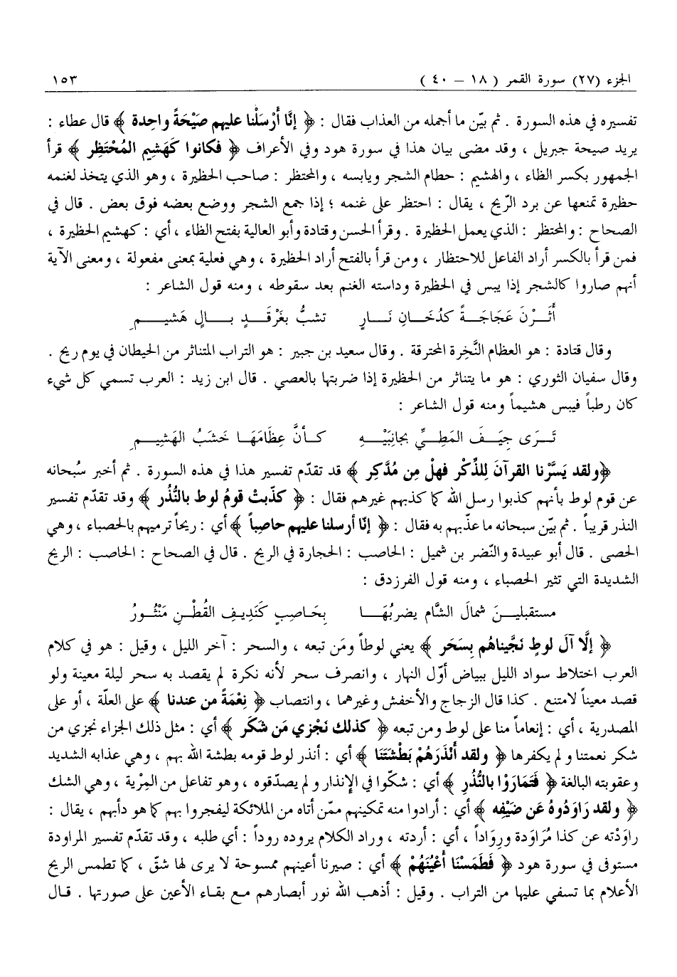 وَلَقَدْ يَسَّرْنَا الْقُرْآنَ لِلذِّكْرِ فَهَلْ مِنْ مُدَّكِرٍ قَدْ تَقَدَّمَ تَفْسِيرُ هَذَا فِي هَذِهِ السُّورَةِ. ثُمَّ أَخْبَرَ سُبْحَانَهُ عَنْ قَوْمِ لُوطٍ بِأَنَّهُمْ كَذَّبُوا رُسُلَ اللَّهِ كَمَا كَذَّبَهُمْ غَيْرُهُمْ فَقَالَ: كَذَّبَتْ قَوْمُ لُوطٍ بِالنُّذُرِ وَقَدْ تَقَدَّمَ تَفْسِيرُ النُّذُرِ قَرِيبًا. ثُمَّ بَيَّنَ سُبْحَانَهُ مَا عَذَّبَهُمْ بِهِ فَقَالَ: إِنَّا أَرْسَلْنا عَلَيْهِمْ حاصِباً أَيْ: رِيحًا تَرْمِيهِمْ بِالْحَصْبَاءِ، وَهِيَ الْحَصَى. قَالَ أَبُو عُبَيْدَةَ وَالنَّضْرُ بْنُ شُمَيْلٍ: الْحَاصِبُ: الْحِجَارَةُ فِي الرِّيحِ. قَالَ فِي الصِّحَاحِ: الْحَاصِبُ: الرِّيحُ الشَّدِيدَةُ الَّتِي تُثِيرُ الْحَصْبَاءَ، وَمِنْهُ قَوْلُ الْفَرَزْدَقِ: