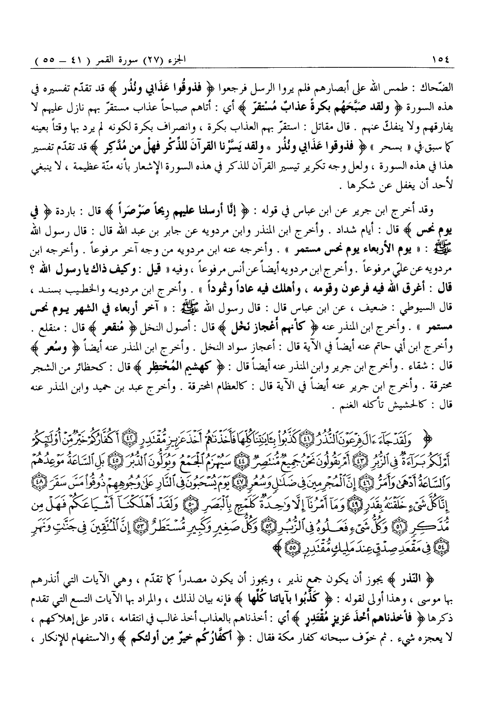 قَالَ: أَغْرَقَ اللَّهُ فِيهِ فِرْعَوْنَ وَقَوْمَهُ، وَأَهْلَكَ فِيهِ عادا وثمودا» . وَأَخْرَجَ ابْنُ مَرْدَوَيْهِ وَالْخَطِيبُ بِسَنَدٍ، قَالَ السُّيُوطِيُّ: ضَعِيفٍ، عَنِ ابْنِ عَبَّاسٍ قَالَ: قَالَ رَسُولُ اللَّهِ صَلَّى اللَّهُ عَلَيْهِ وَسَلَّمَ: «آخِرُ أَرْبِعَاءٍ فِي الشَّهْرِ يَوْمُ نَحْسٍ مُسْتَمِرٍّ» . وَأَخْرَجَ ابْنُ المنذر عنه كَأَنَّهُمْ أَعْجازُ نَخْلٍ قَالَ: أُصُولُ النَّخْلِ مُنْقَعِرٍ قَالَ: مُنْقَلِعٌ.
