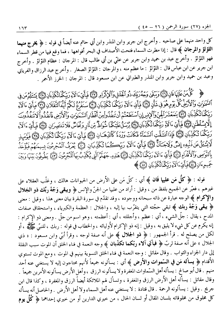 أَنَّهُ يُكَرَّمُ عَنْ كُلِّ شَيْءٍ لَا يَلِيقُ بِهِ، وَقِيلَ: إِنَّهُ ذُو الْإِكْرَامِ لِأَوْلِيَائِهِ، وَالْخِطَابُ فِي قَوْلِهِ: رَبِّكَ، لِلنَّبِيِّ صَلَّى اللَّهُ عَلَيْهِ وَسَلَّمَ، أَوْ لِكُلِّ مَنْ يَصْلُحُ لَهُ. قَرَأَ الْجُمْهُورُ: ذُو الْجَلالِ عَلَى أَنَّهُ صِفَةٌ لِوَجْهٍ، وَقَرَأَ أُبَيٌّ وَابْنُ مَسْعُودٍ: «ذِي الْجَلَالِ» عَلَى أَنَّهُ صِفَةٌ لِرَبِّ فَبِأَيِّ آلاءِ رَبِّكُما تُكَذِّبانِ وَجْهُ النِّعْمَةِ فِي فَنَاءِ الْخَلْقِ أَنَّ الْمَوْتَ سَبَبُ النُّقْلَةِ إِلَى دَارِ الْجَزَاءِ وَالثَّوَابِ. وَقَالَ مُقَاتِلٌ: وَجْهُ النِّعْمَةِ فِي فَنَاءِ الْخَلْقِ التَّسْوِيَةُ بَيْنَهُمْ فِي الْمَوْتِ، وَمَعَ الموت تستوي الأقدام يَسْئَلُهُ مَنْ فِي السَّماواتِ وَالْأَرْضِ أَيْ: يَسْأَلُونَهُ جَمِيعًا لِأَنَّهُمْ مُحْتَاجُونَ إِلَيْهِ لَا يَسْتَغْنِي عَنْهُ أَحَدٌ مِنْهُمْ. قَالَ أَبُو صَالِحٍ: يَسْأَلُهُ أَهْلُ السَّمَاوَاتِ الْمَغْفِرَةَ وَلَا يَسْأَلُونَهُ الرِّزْقَ، وَأَهْلُ الْأَرْضِ يَسْأَلُونَهُ الْأَمْرَيْنِ جَمِيعًا.