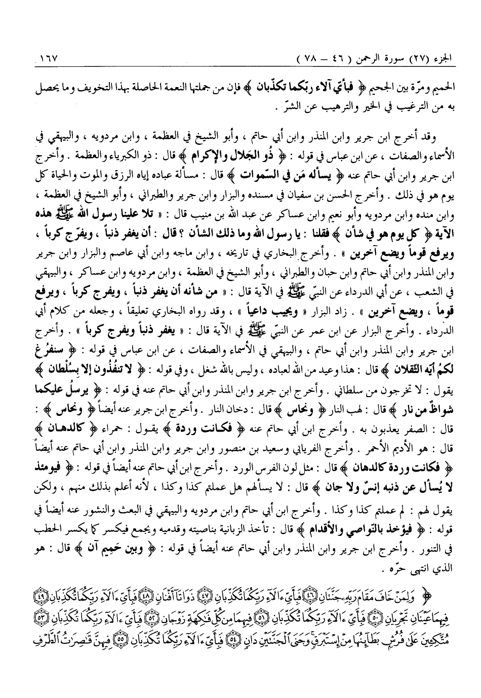 وَقَدْ أَخْرَجَ ابْنُ جَرِيرٍ وَابْنُ الْمُنْذِرِ وَابْنُ أَبِي حَاتِمٍ، وَأَبُو الشَّيْخِ فِي الْعَظَمَةِ، وَابْنُ مَرْدَوَيْهِ، وَالْبَيْهَقِيُّ فِي الْأَسْمَاءِ وَالصِّفَاتِ، عَنِ ابْنِ عَبَّاسٍ فِي قَوْلِهِ: ذُو الْجَلالِ وَالْإِكْرامِ قَالَ: ذُو الْكِبْرِيَاءِ وَالْعَظَمَةِ. وَأَخْرَجَ ابْنُ جَرِيرٍ وَابْنُ أَبِي حَاتِمٍ عَنْهُ يَسْئَلُهُ مَنْ فِي السَّماواتِ قَالَ: مَسْأَلَةُ عِبَادِهِ إِيَّاهُ الرِّزْقَ وَالْمَوْتَ وَالْحَيَاةَ كُلَّ يَوْمٍ هُوَ فِي ذَلِكَ. وَأَخْرَجَ الْحَسَنُ بْنُ سُفْيَانَ فِي مُسْنَدِهِ وَالْبَزَّارُ وَابْنُ جَرِيرٍ وَالطَّبَرَانِيُّ، وَأَبُو الشَّيْخِ فِي الْعَظَمَةِ، وَابْنُ مَنْدَهْ وَابْنُ مَرْدَوَيْهِ وَأَبُو نُعَيْمٍ وَابْنُ عَسَاكِرَ عَنْ عَبْدِ اللَّهِ بْنِ مُنِيبٍ قَالَ: «تَلَا عَلَيْنَا رَسُولُ اللَّهِ صَلَّى اللَّهُ عَلَيْهِ وَسَلَّمَ هَذِهِ الْآيَةَ كُلَّ يَوْمٍ هُوَ فِي شَأْنٍ فَقُلْنَا: يَا رَسُولَ اللَّهِ وَمَا ذَلِكَ الشَّأْنُ؟ قَالَ: أَنْ يَغْفِرَ ذَنْبًا، وَيُفَرِّجَ كَرْبًا، وَيَرْفَعَ قَوْمًا وَيَضَعَ آخَرِينَ» . وَأَخْرَجَ الْبُخَارِيُّ فِي تَارِيخِهِ، وَابْنُ مَاجَهْ وَابْنُ أَبِي عَاصِمٍ والبزار وابن جرير وابن المنده وَابْنُ أَبِي حَاتِمٍ وَابْنُ حِبَّانَ وَالطَّبَرَانِيُّ، وَأَبُو الشَّيْخِ فِي الْعَظَمَةِ، وَابْنُ مَرْدَوَيْهِ وَابْنُ عَسَاكِرَ، وَالْبَيْهَقِيُّ فِي الشُّعَبِ، عَنْ أَبِي الدَّرْدَاءِ عَنِ النَّبِيِّ صَلَّى اللَّهُ عَلَيْهِ وَسَلَّمَ فِي الْآيَةِ قَالَ: «مِنْ شَأْنِهِ أَنْ يَغْفِرَ ذَنْبًا، وَيُفَرِّجَ كَرْبًا، وَيَرْفَعَ قَوْمًا، وَيَضَعَ آخَرِينَ» . زَادَ الْبَزَّارُ «وَيُجِيبَ دَاعِيًا» ، وَقَدْ رَوَاهُ الْبُخَارِيُّ تَعْلِيقًا، وَجَعَلَهُ مِنْ كَلَامِ أَبِي الدَّرْدَاءِ. وَأَخْرَجَ الْبَزَّارُ عَنِ ابْنِ عُمَرَ عَنِ النَّبِيِّ صَلَّى اللَّهُ عَلَيْهِ وَسَلَّمَ فِي الْآيَةِ قَالَ: «يَغْفِرُ ذَنْبًا وَيُفَرِّجُ كَرْبًا» . وَأَخْرَجَ ابْنُ جَرِيرٍ وَابْنُ الْمُنْذِرِ وَابْنُ أَبِي حَاتِمٍ، وَالْبَيْهَقِيُّ فِي الْأَسْمَاءِ وَالصِّفَاتِ، عَنِ ابْنِ عَبَّاسٍ في قوله: سَنَفْرُغُ لَكُمْ أَيُّهَ الثَّقَلانِ قَالَ: هَذَا وَعِيدٌ مِنَ اللَّهِ لِعِبَادِهِ، وَلَيْسَ بِاللَّهِ شُغُلٌ، وَفِي قَوْلِهِ: لَا تَنْفُذُونَ إِلَّا بِسُلْطانٍ يَقُولُ: لَا تَخْرُجُونَ مِنْ سُلْطَانِي. وَأَخْرَجَ ابْنُ جَرِيرٍ وَابْنُ الْمُنْذِرِ وَابْنُ أَبِي حَاتِمٍ عَنْهُ فِي قَوْلِهِ: يُرْسَلُ عَلَيْكُما شُواظٌ مِنْ نارٍ قَالَ: لَهَبُ النَّارِ وَنُحاسٌ قَالَ: دُخَانُ النَّارِ. وَأَخْرَجَ ابْنُ جَرِيرٍ عَنْهُ أَيْضًا وَنُحاسٌ: